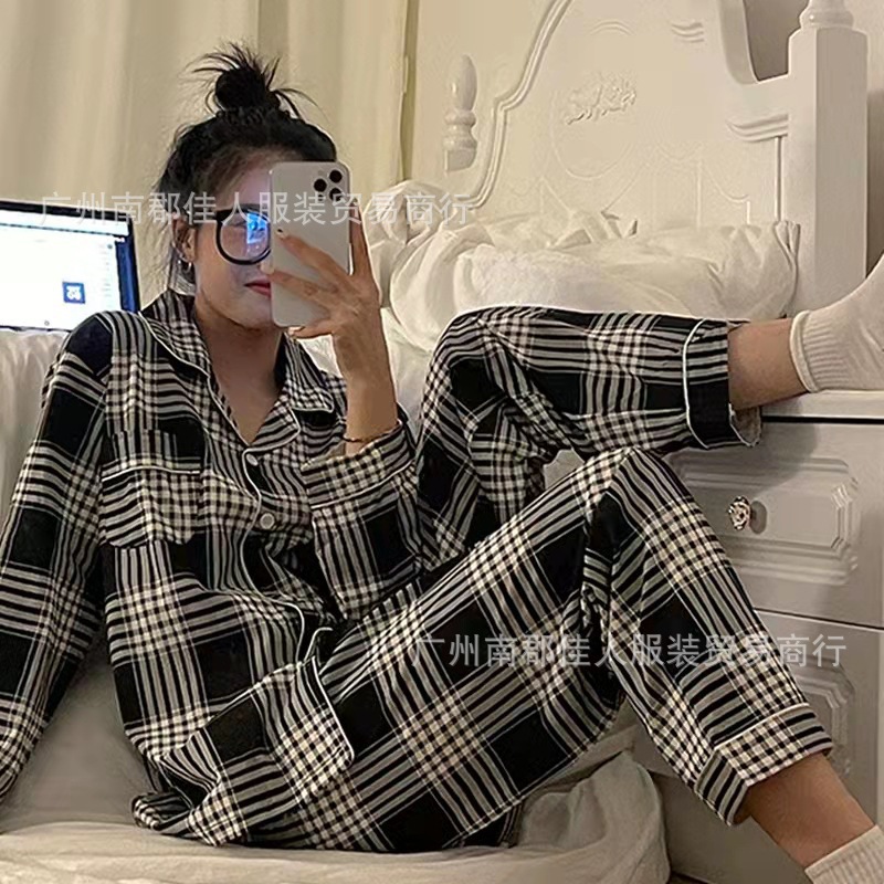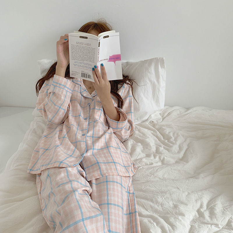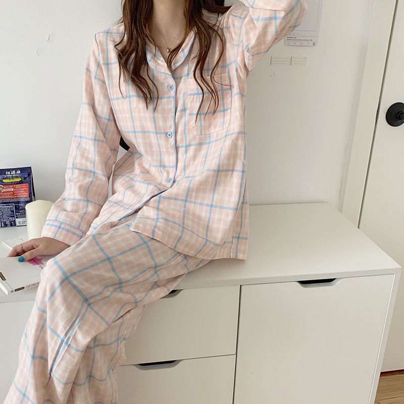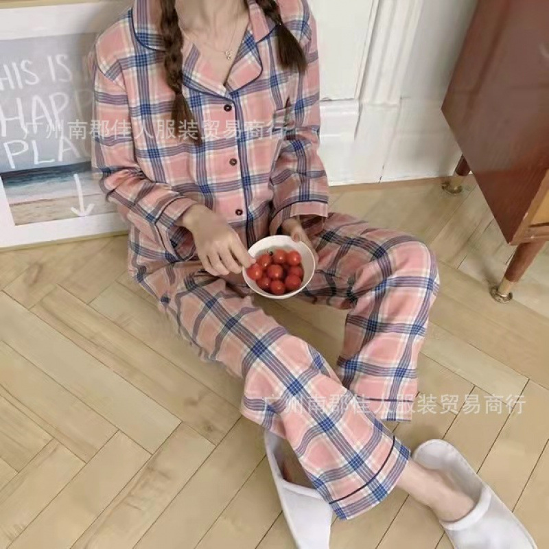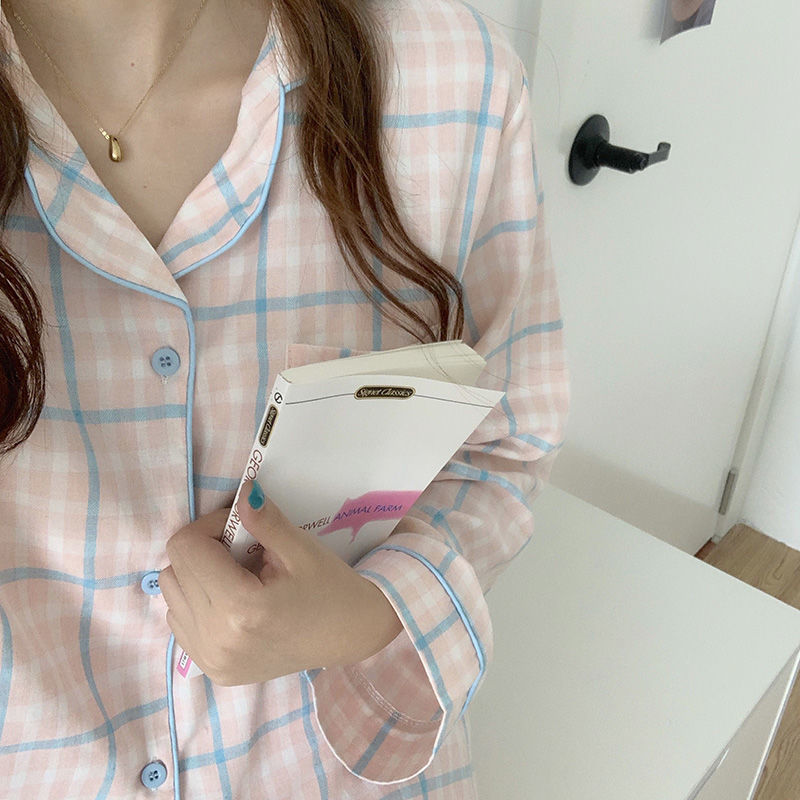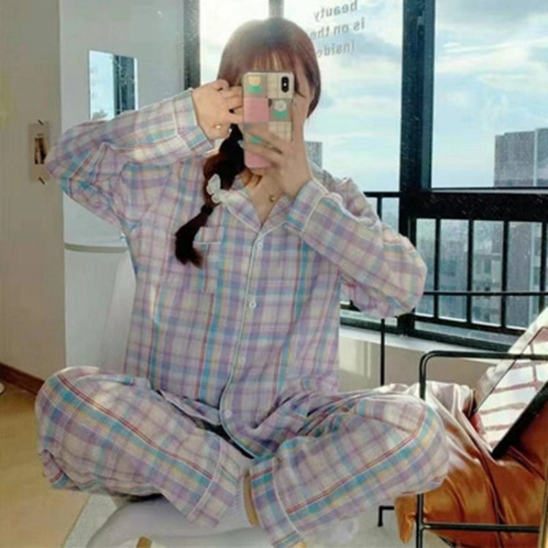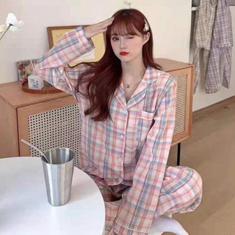새로운 격자 무늬 잠옷 여성 일본식 한국식 귀여운 긴팔 봄 · 가을 홈웨어 겉옷 투피스 세트 국경 도매스토어 가기
