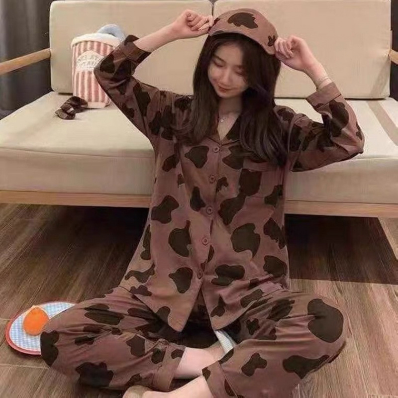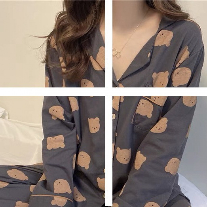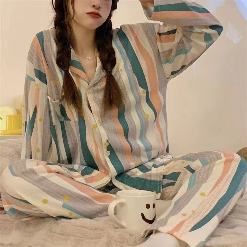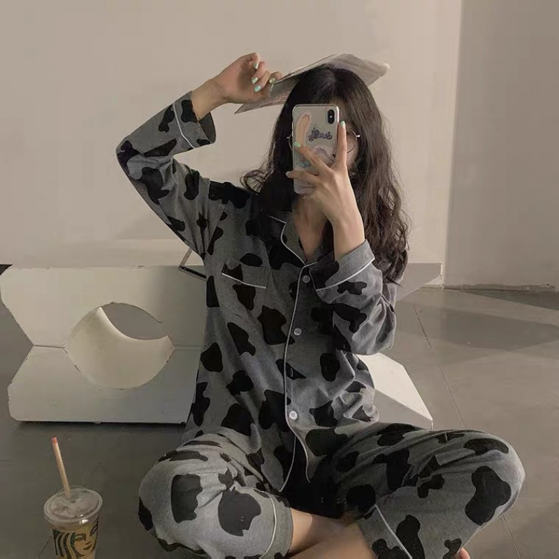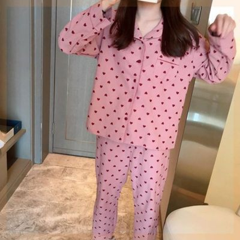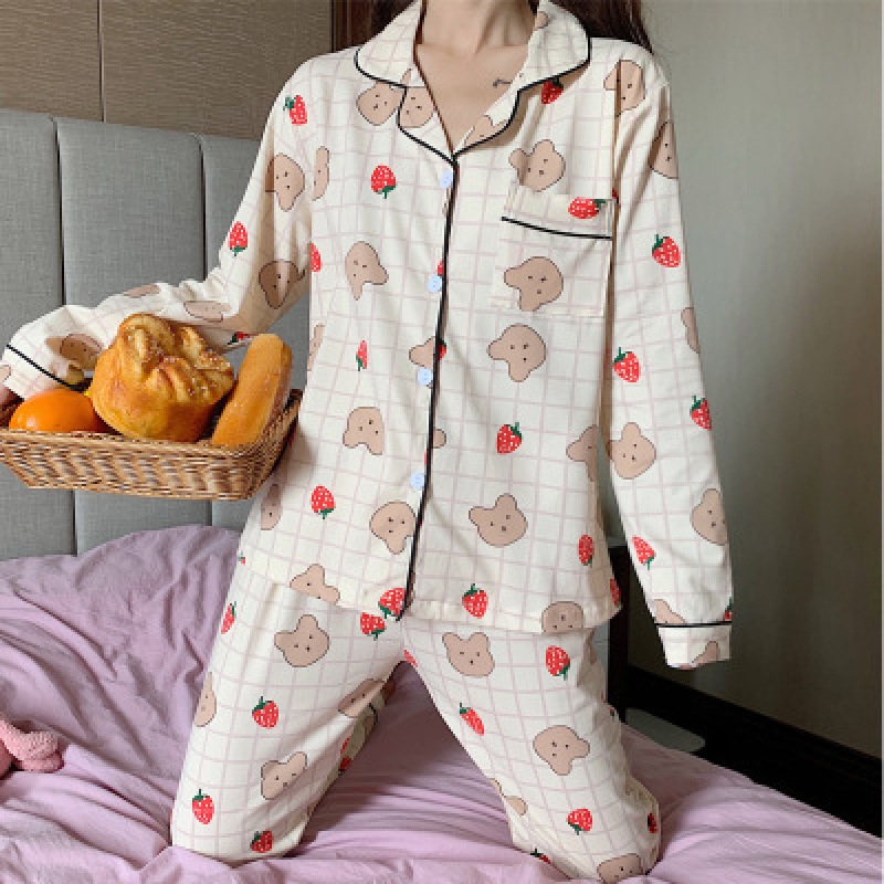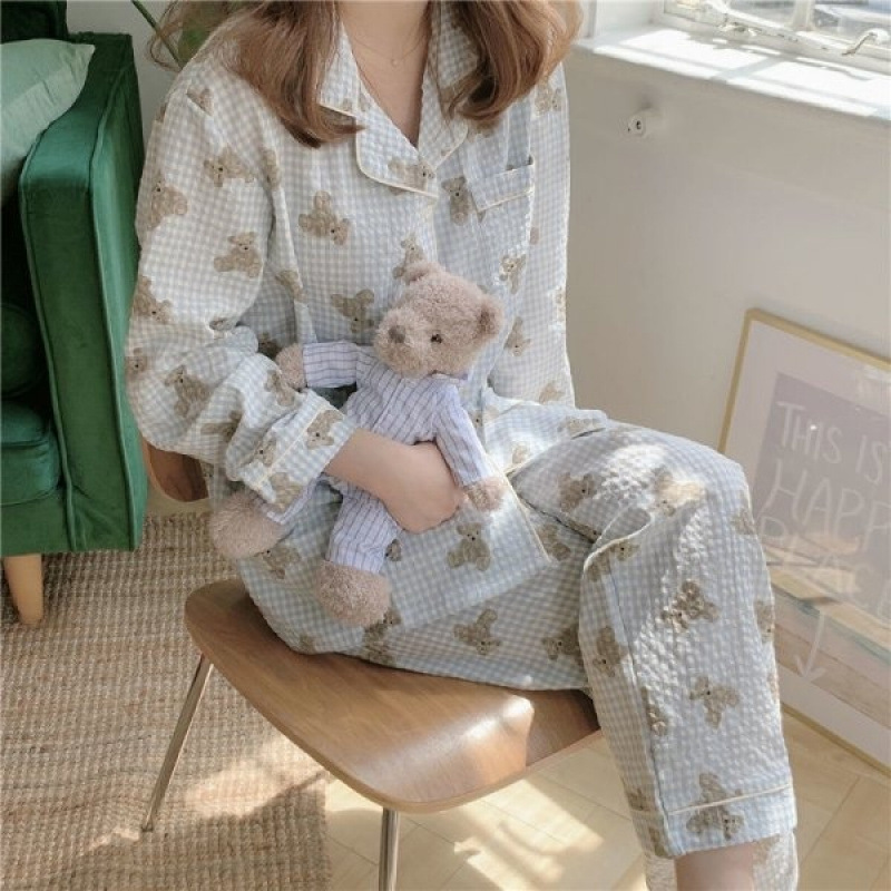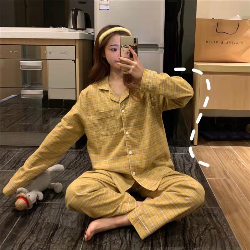 새로운 격자 무늬 잠옷 여성 일본식 한국식 귀여운 긴팔 봄 · 가을 홈웨어 겉옷 투피스 세트 국경 도매스토어 가기