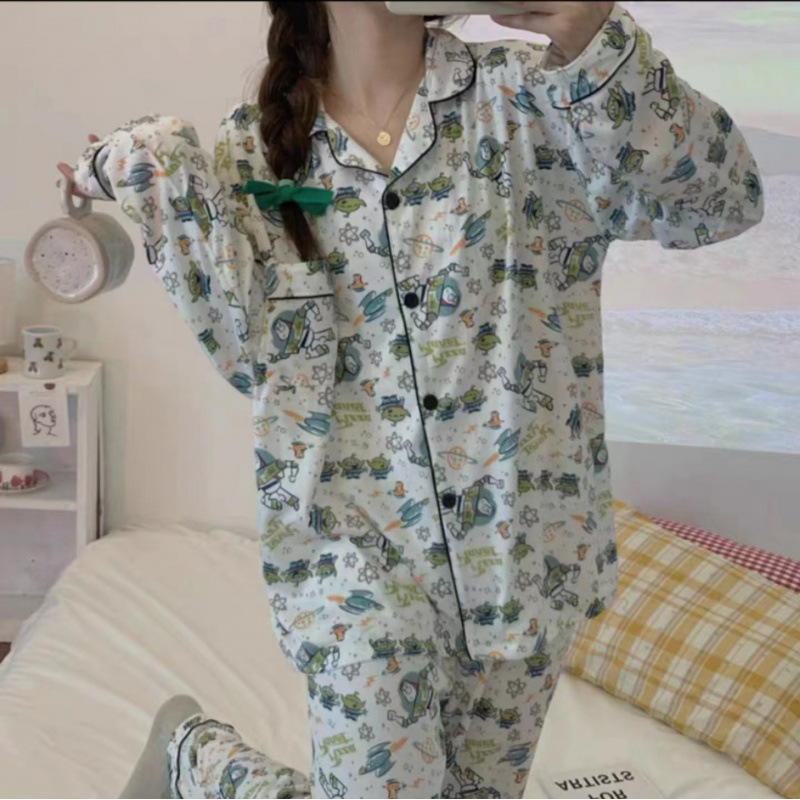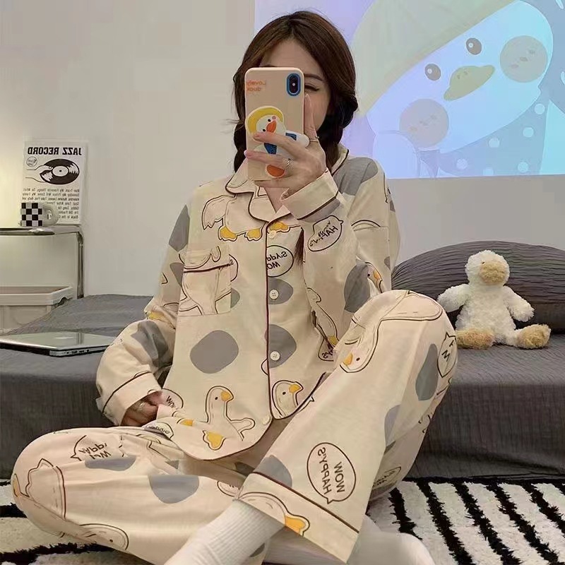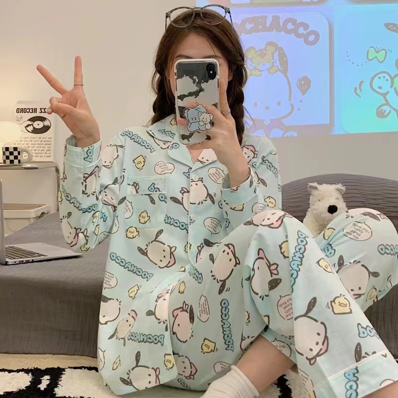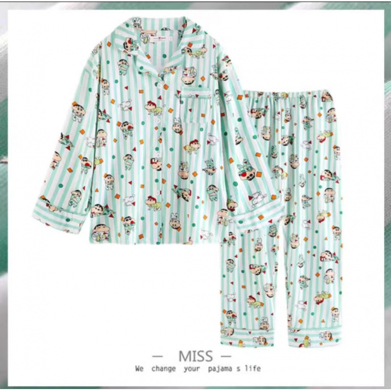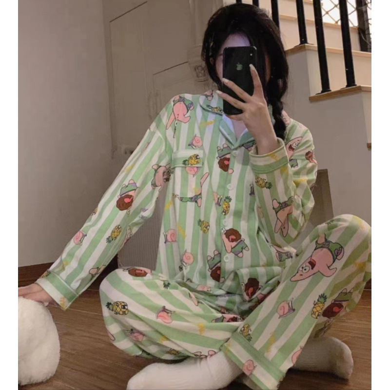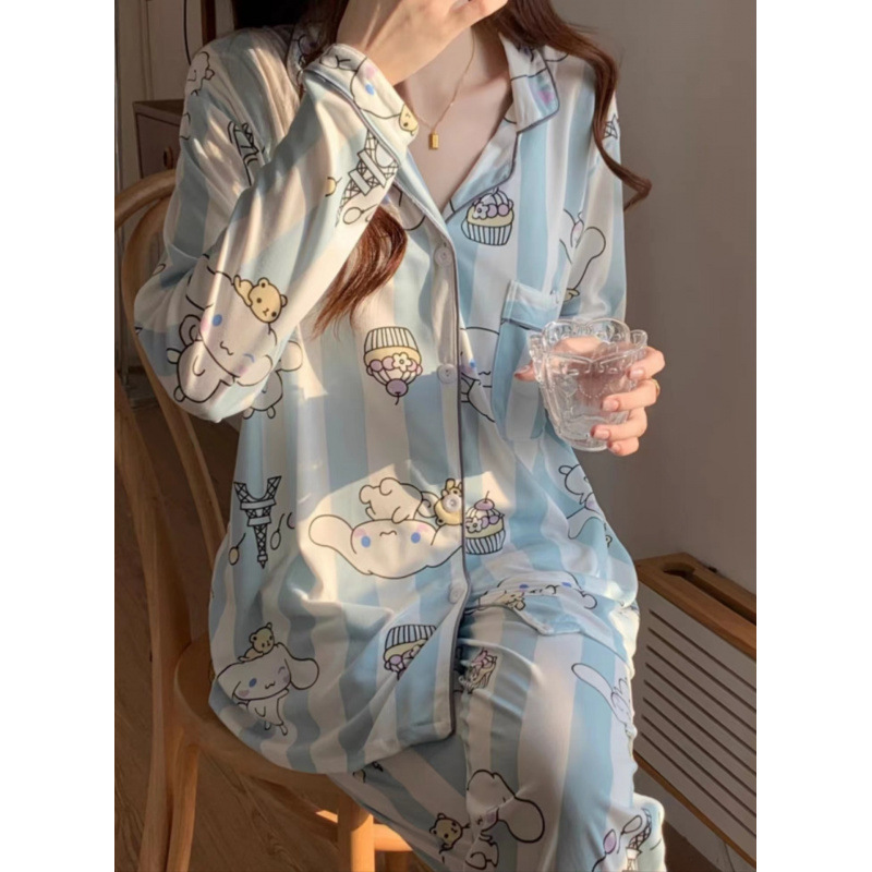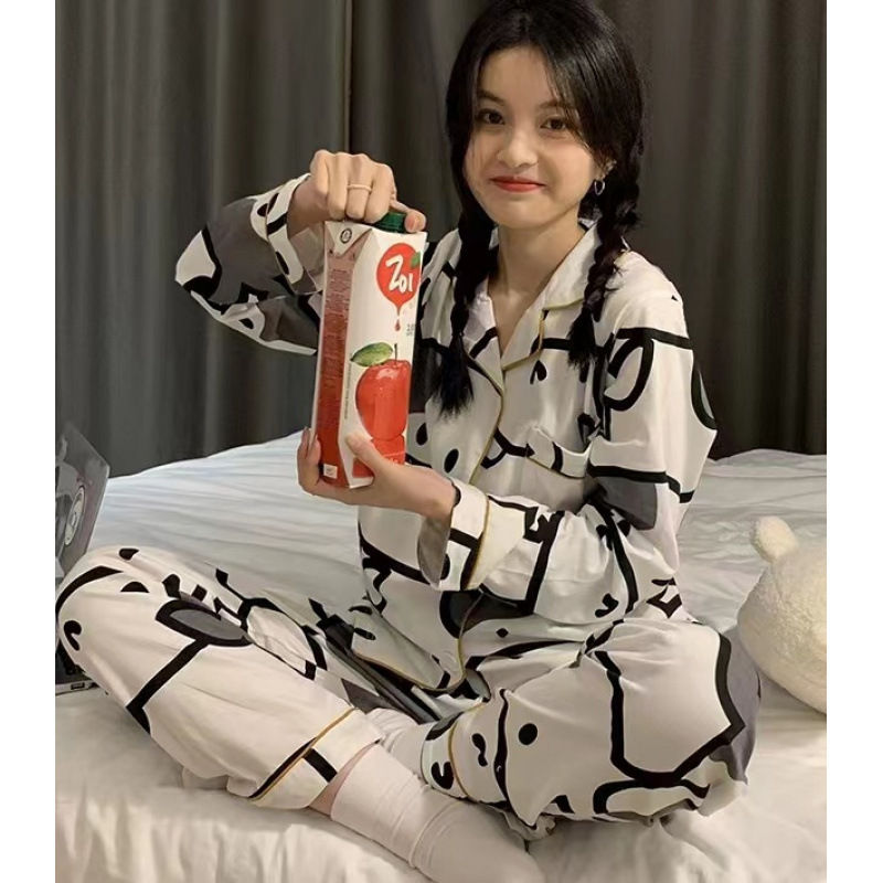 새로운 격자 무늬 잠옷 여성 일본식 한국식 귀여운 긴팔 봄 · 가을 홈웨어 겉옷 투피스 세트 국경 도매스토어 가기