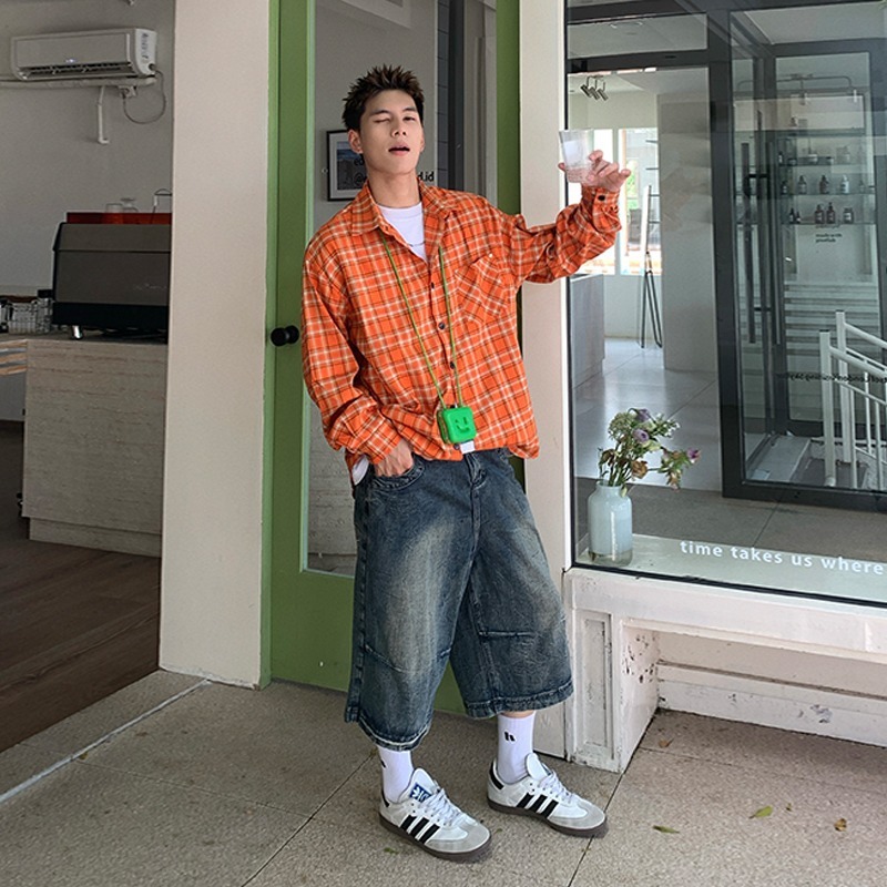 아메리칸 스타일 오렌지 격자 무늬 셔츠 남성 복고풍 디자인 센스 긴 소매 셔츠 봄과 가을 느슨한 캐주얼 셔츠 커플 재킷스토어 가기