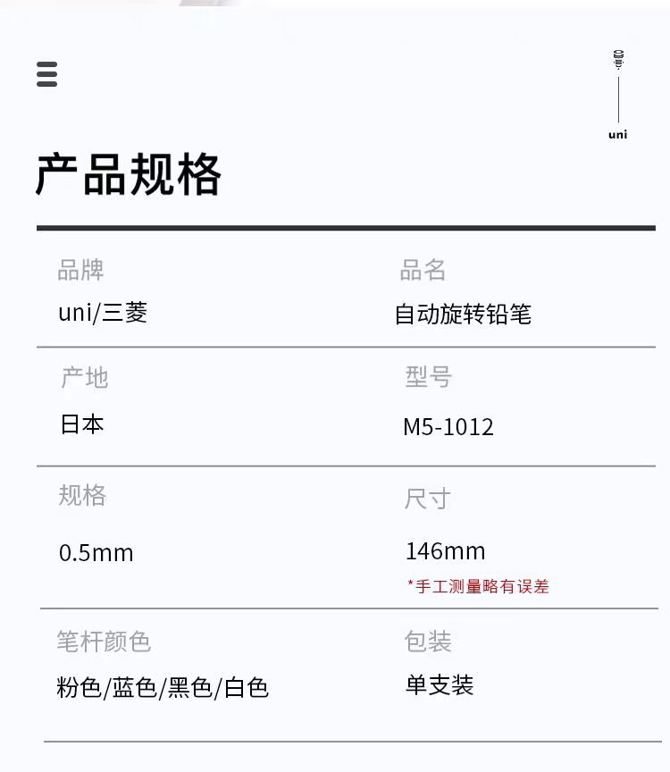 일본 UNI 미쓰비시 쿠루토가 자동연필 M51012/7 회전식 깨지지 않는 심 블랙 테크놀로지 샤프펜슬