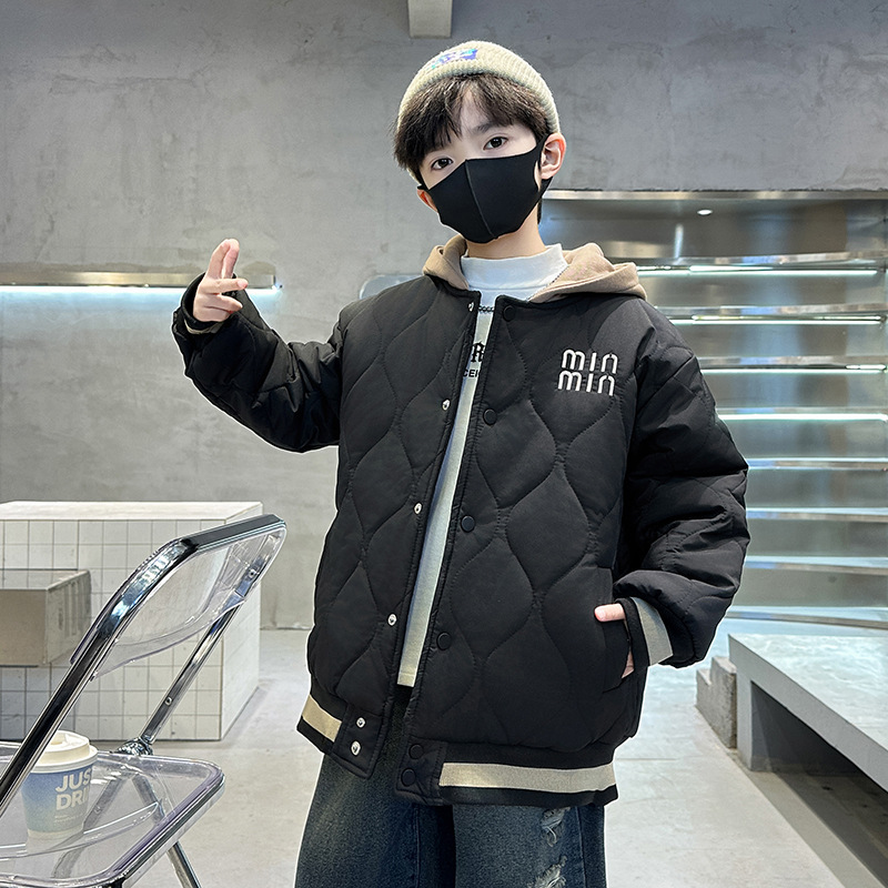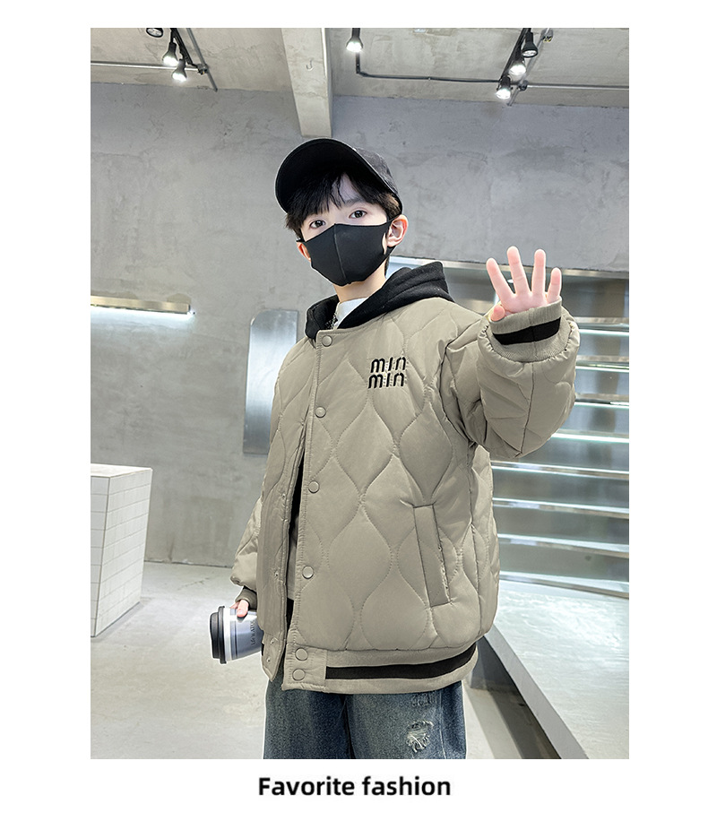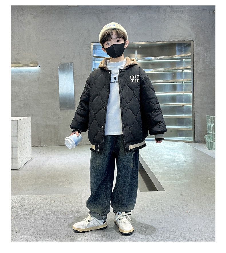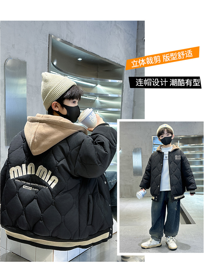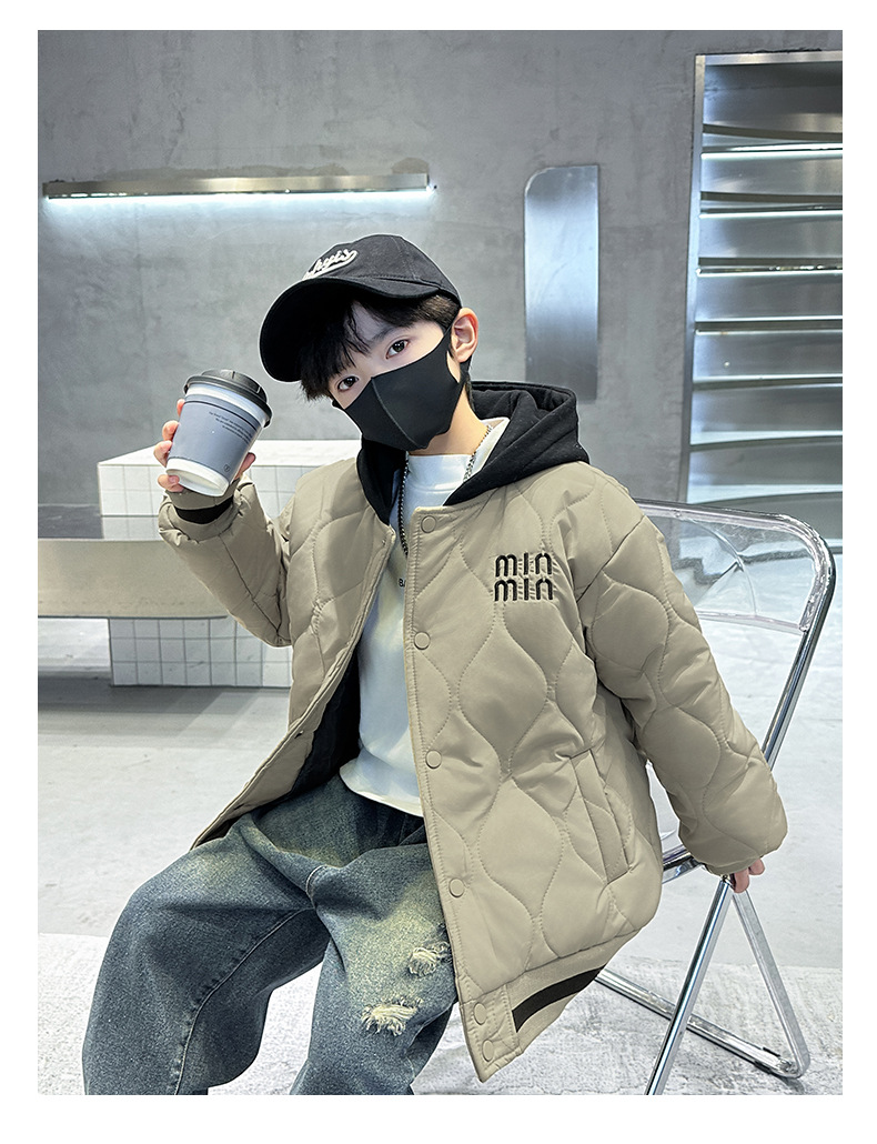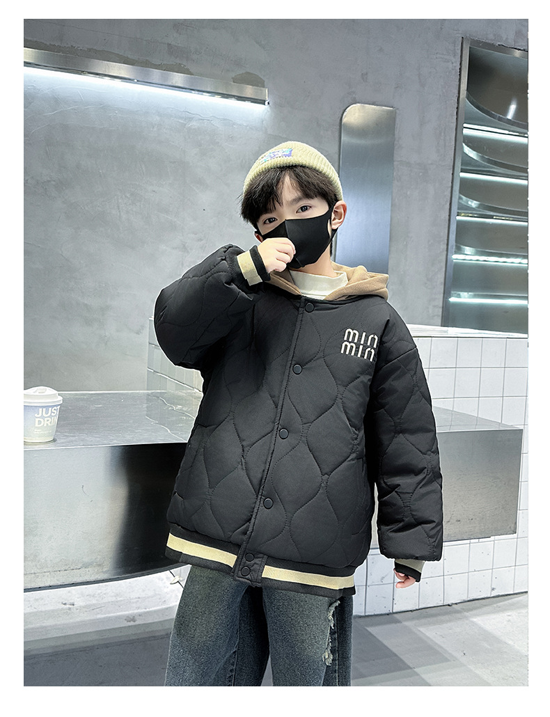 25 가을과 겨울 중 및 대형 어린이 편지 면 패딩 코트 두꺼운 버튼 카디건 탑 어린이 느슨한 캐주얼 후드 따뜻한 면화 패딩 코트