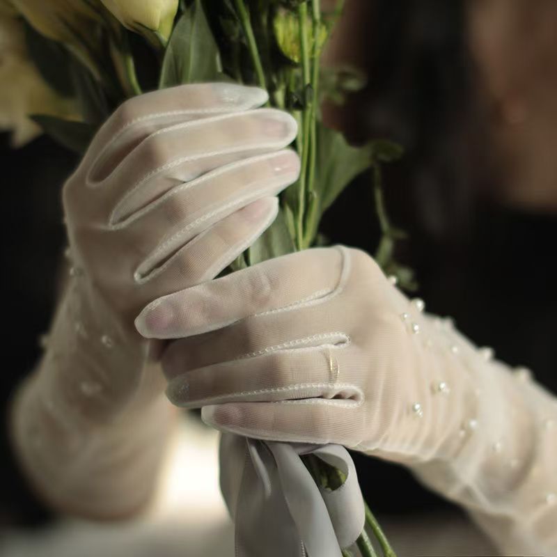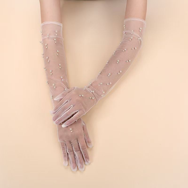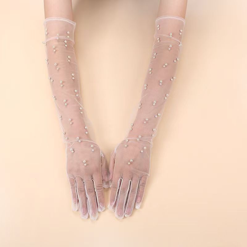 도매 소매 긴 신부 진주 장갑 메쉬 레이스 커버 팔 흰색 거즈 웨딩 원피스 손 소매 여행 얇은