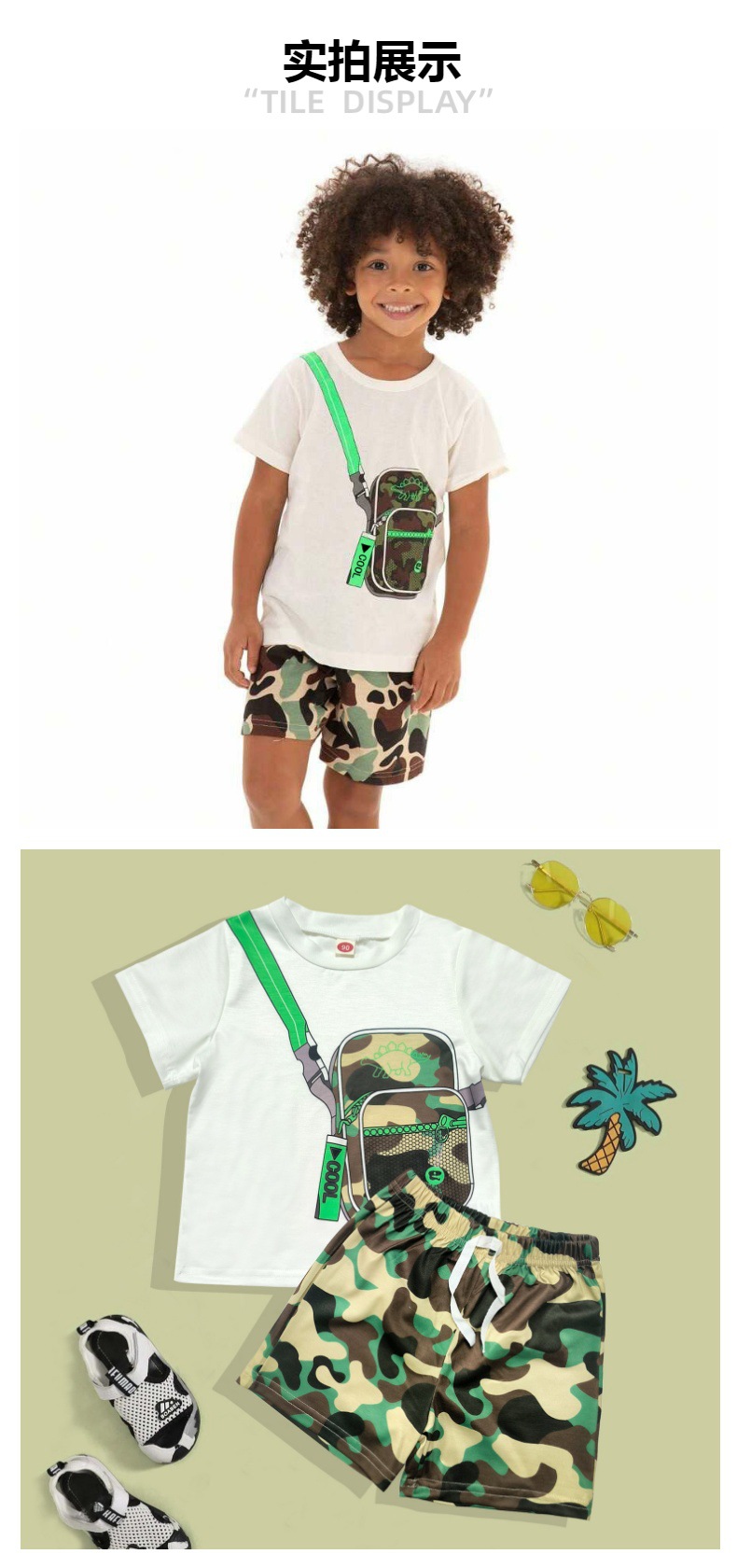 아마존 여름 새로운 크로스 국경 키즈 세트 배낭 인쇄 짧은 소매 티셔츠 위장 반바지 소년 세트스토어 가기