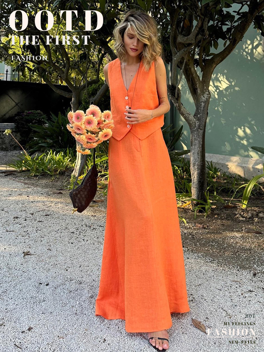 국경 간 면화 및 리넨 조끼 치마 세트 여성 유럽과 미국 2025 여름 새로운 조끼 대형 스윙 스커트 캐주얼 세트