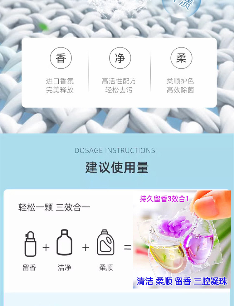 3 대 1 세탁 응고제 비즈 향긋한 구슬 지속 향기 탈취, 진드기 제거, 박테리아 정적 농도 향수 유형 깨끗한 세탁 공