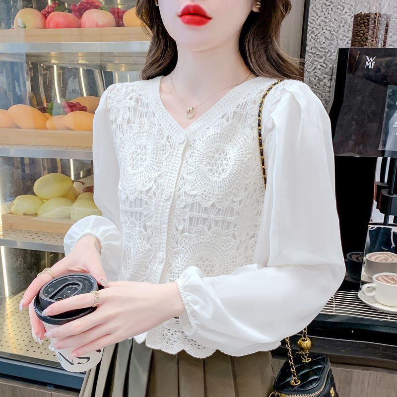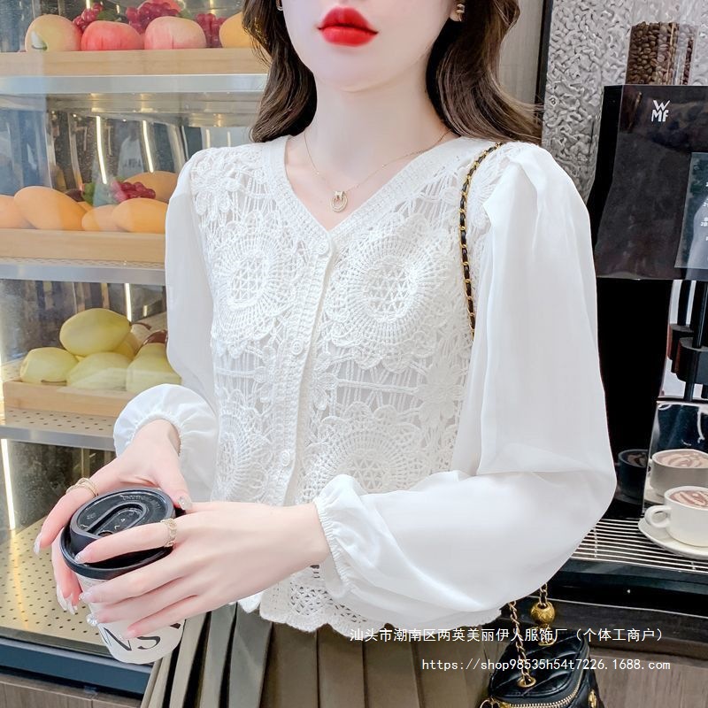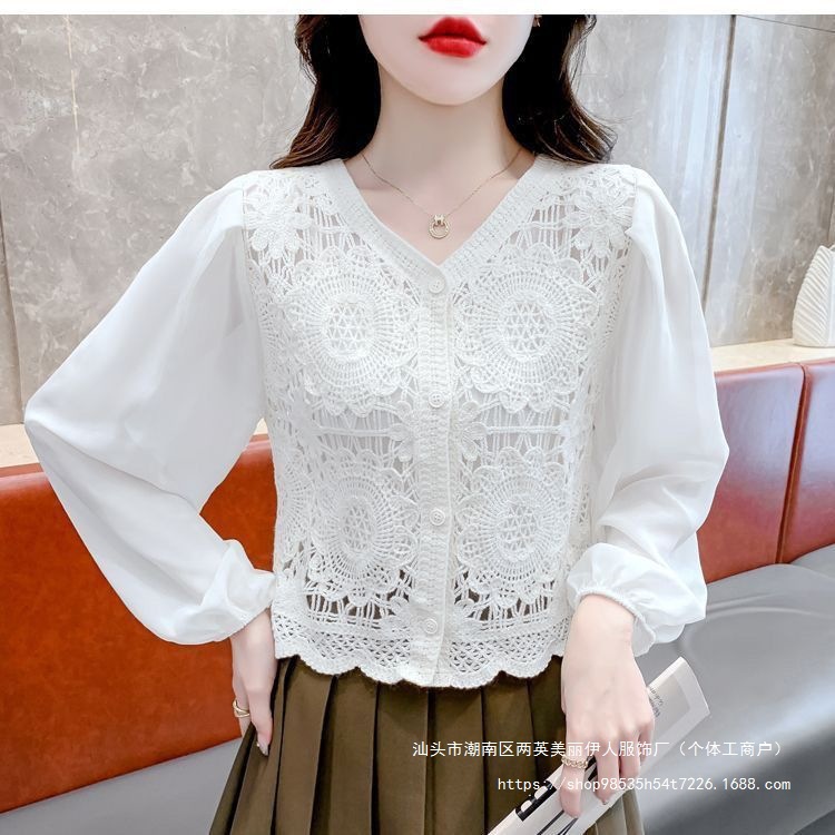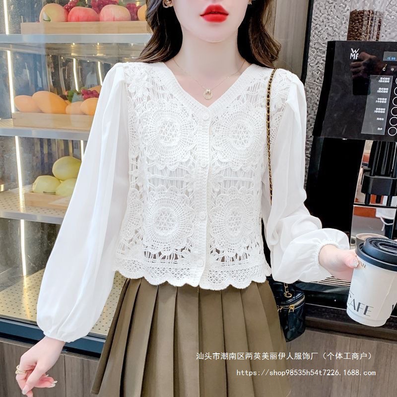 프랑스 빈티지 크로 셰 슬림 니트 웨스턴 스타일 디자인 카디건 2024 새로운 레이스 스티칭 쉬폰 긴 소매 탑스토어 가기