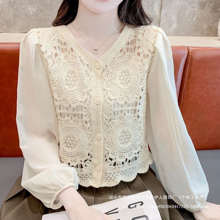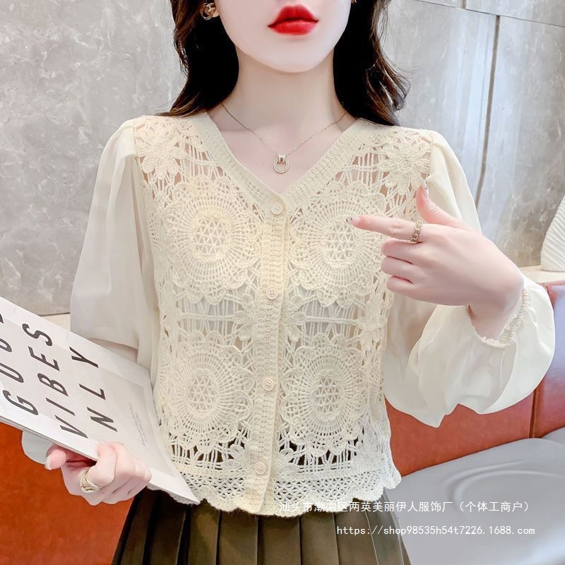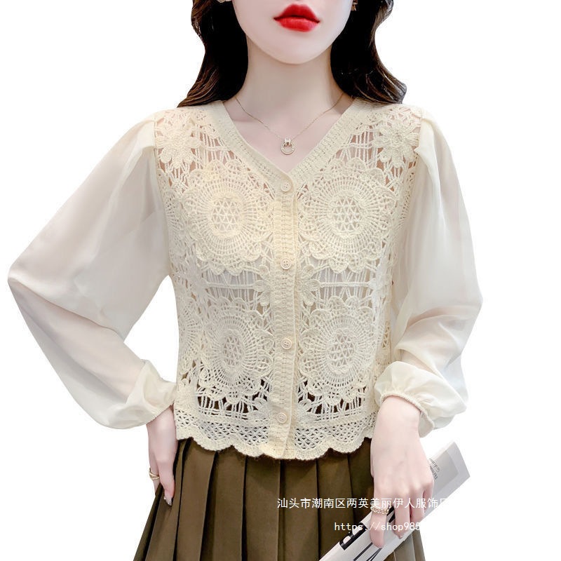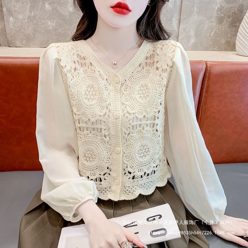 프랑스 빈티지 크로 셰 슬림 니트 웨스턴 스타일 디자인 카디건 2024 새로운 레이스 스티칭 쉬폰 긴 소매 탑