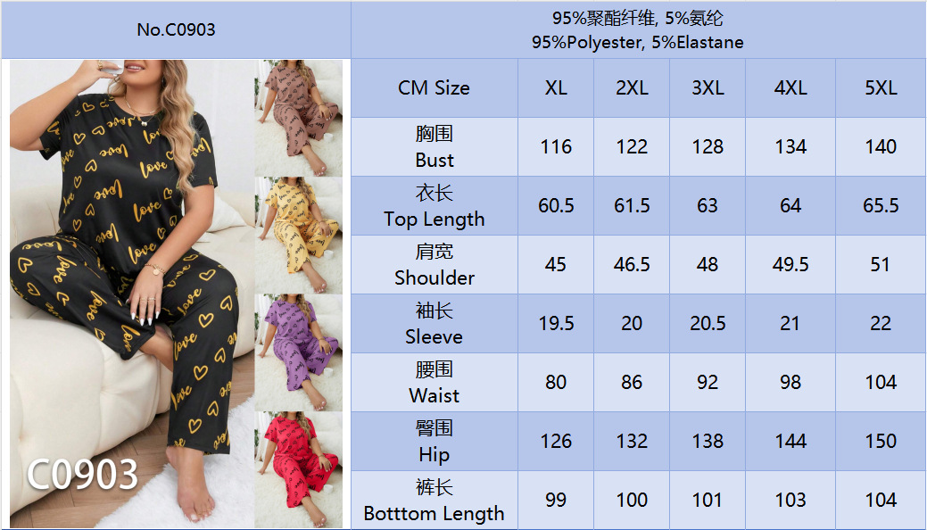 Temu 국경 간 유럽과 미국 스타일의 플러스 사이즈 홈 옷과 뚱뚱한 사랑 둥근 목 짧은 소매 바지 여성 잠옷 세트