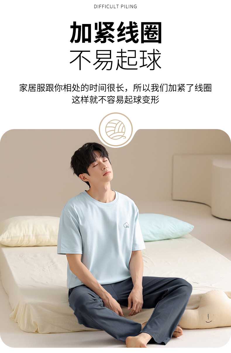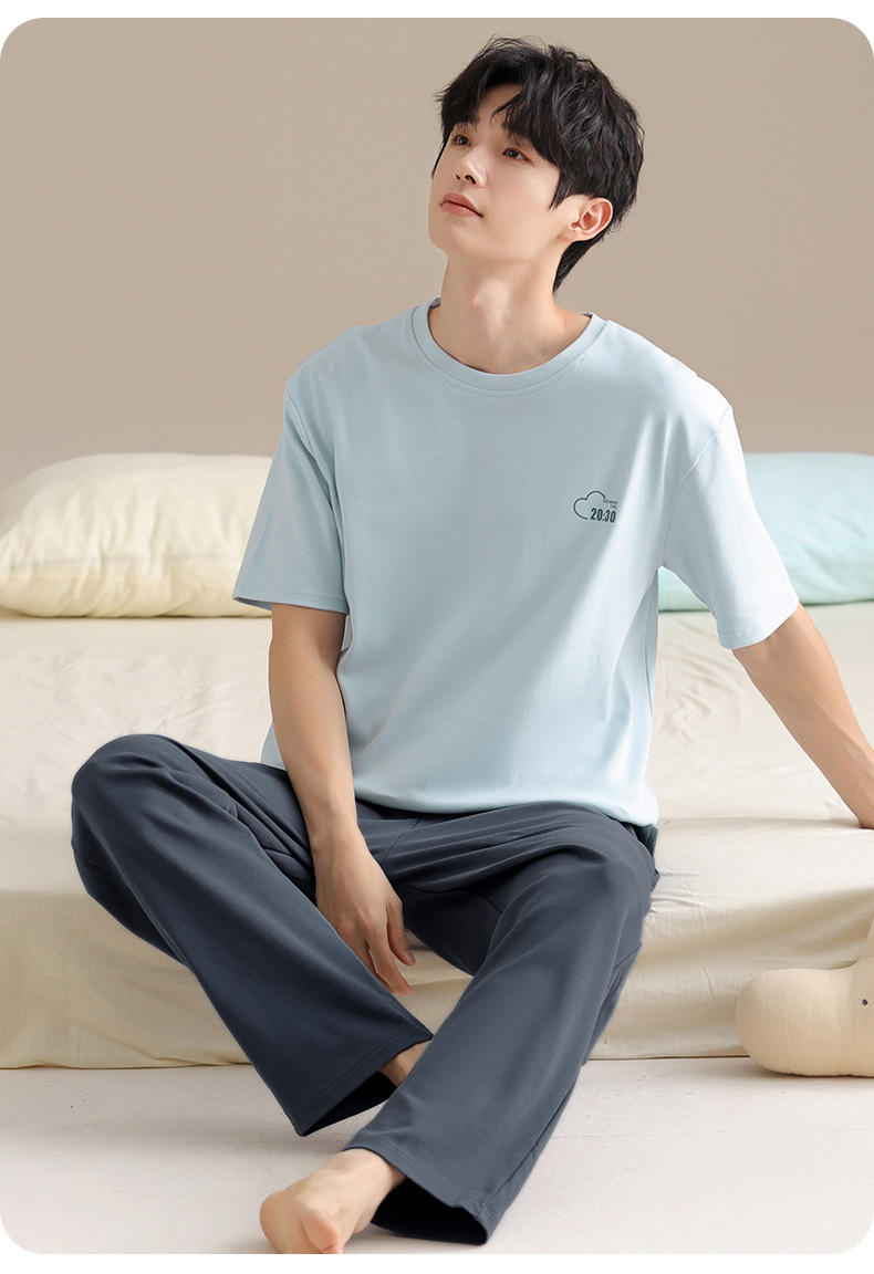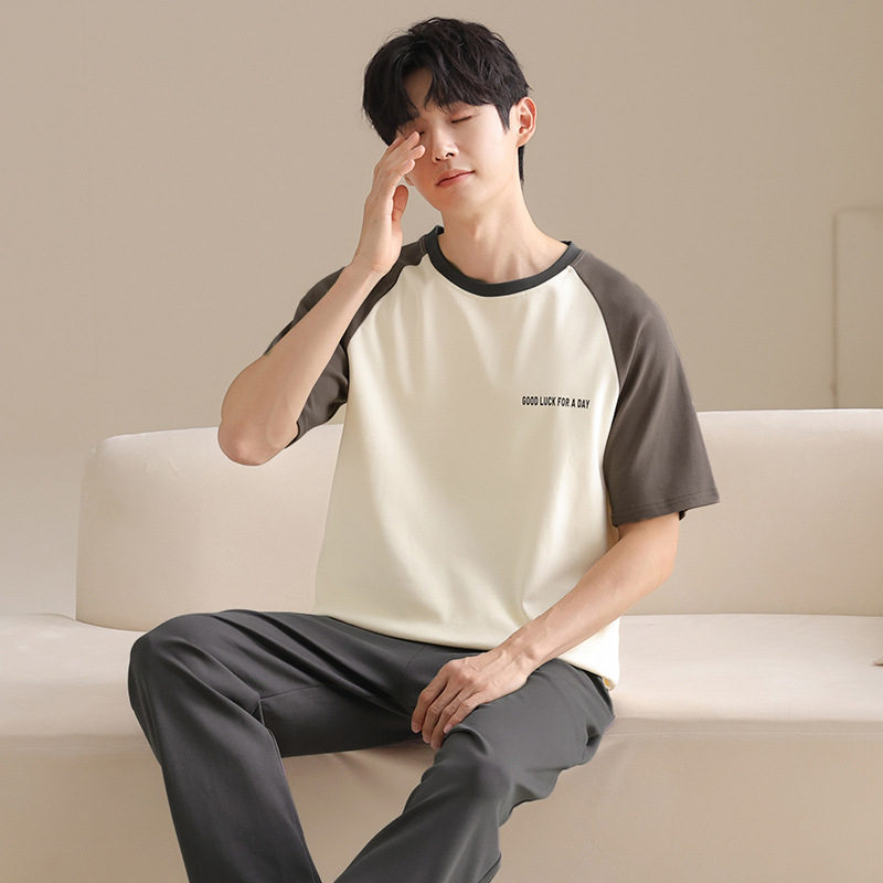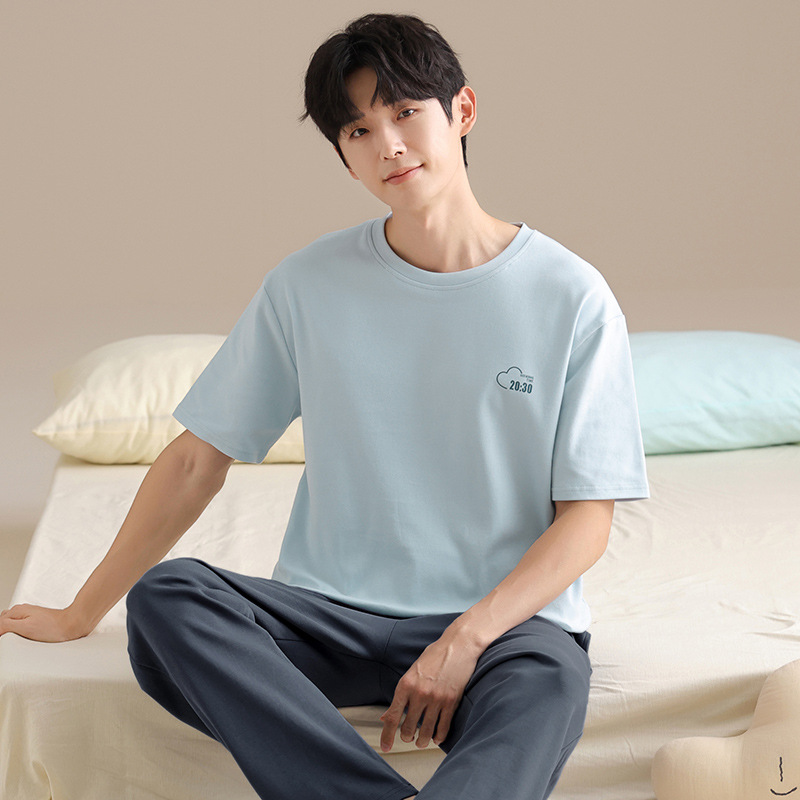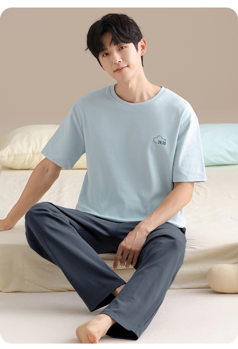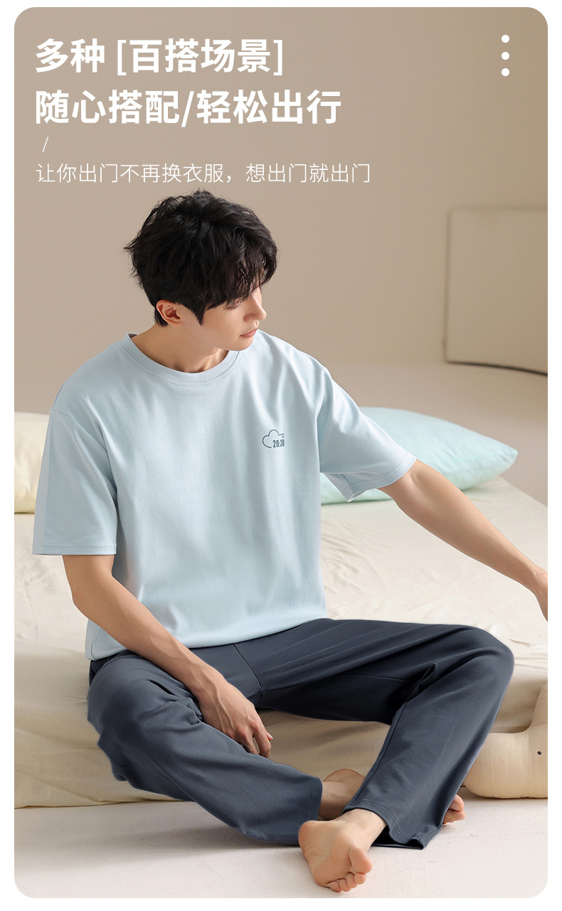 풀오버 순수 코튼 남성 잠옷 봄과 여름 새로운 반팔 라운드 넥 바지 솔리드 컬러 캐주얼 겉옷 홈웨어 세트스토어 가기