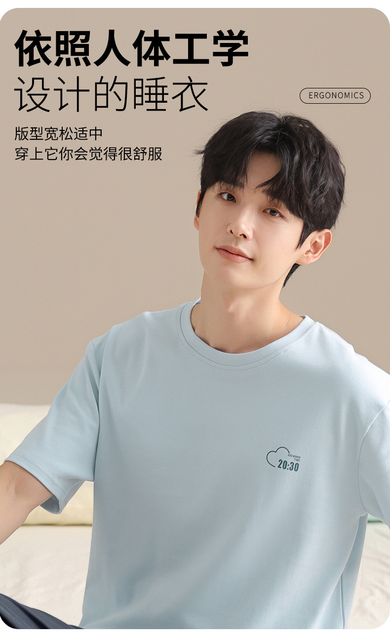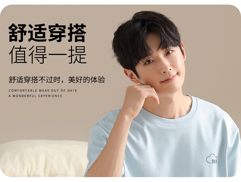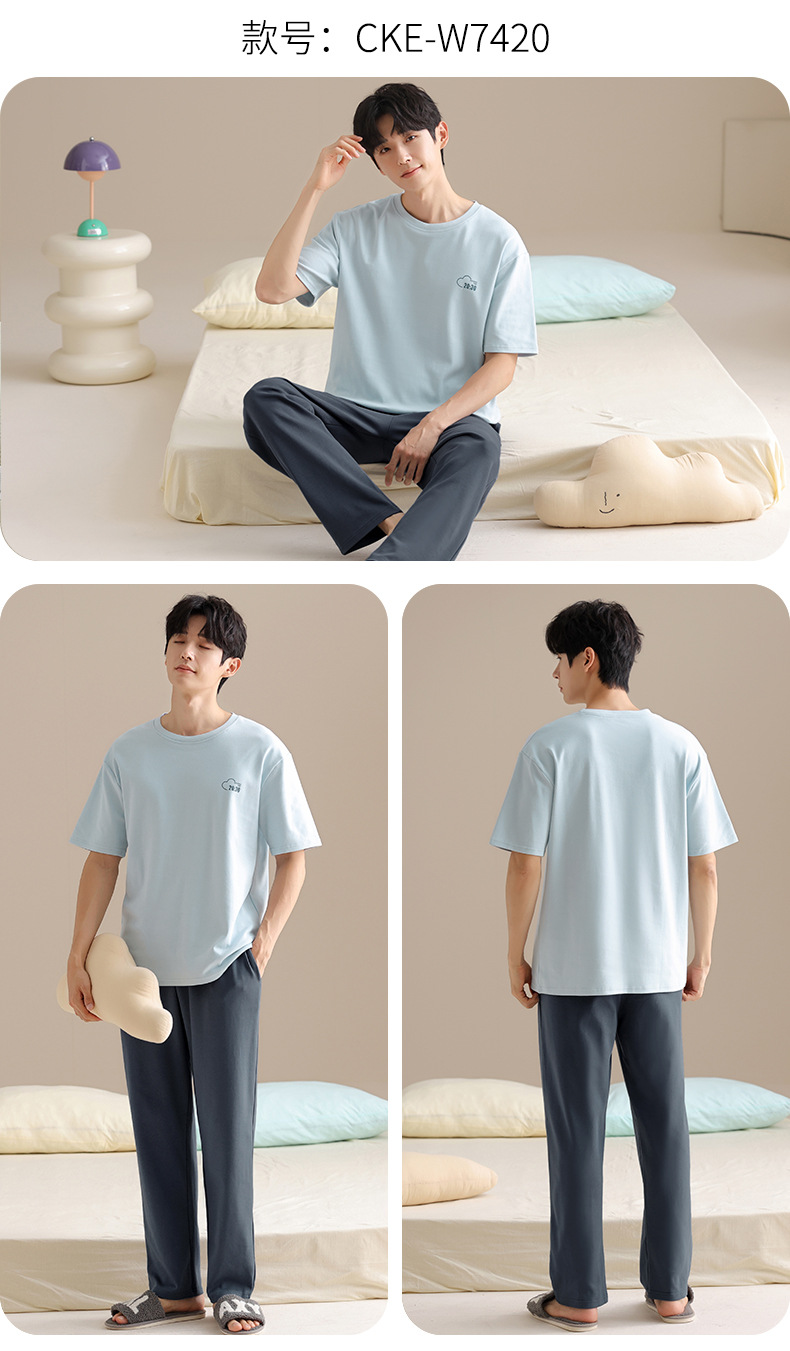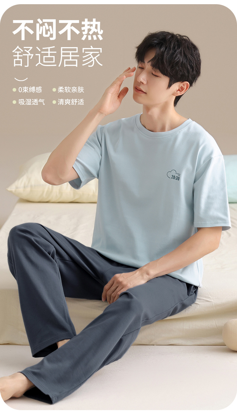풀오버 순수 코튼 남성 잠옷 봄과 여름 새로운 반팔 라운드 넥 바지 솔리드 컬러 캐주얼 겉옷 홈웨어 세트스토어 가기