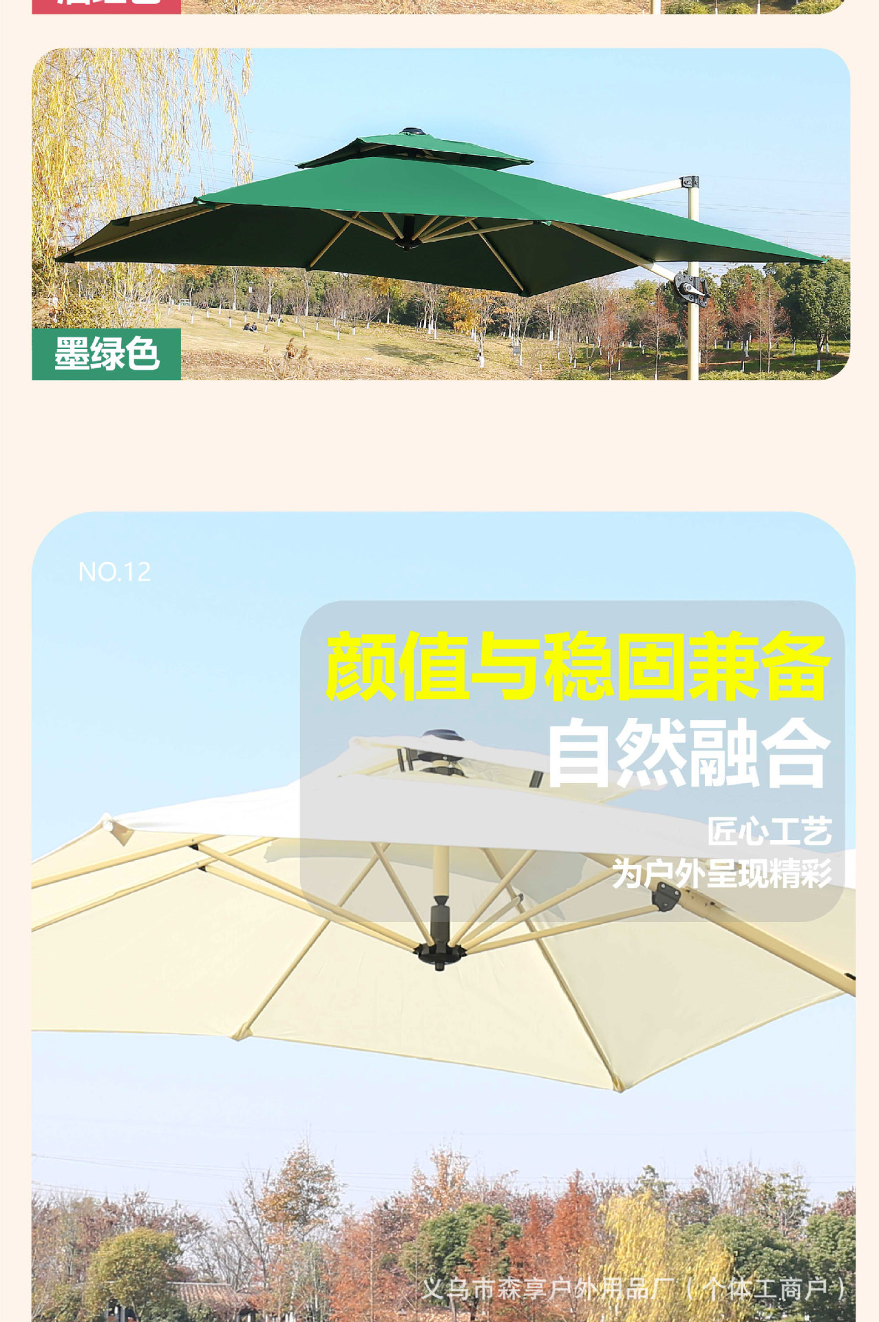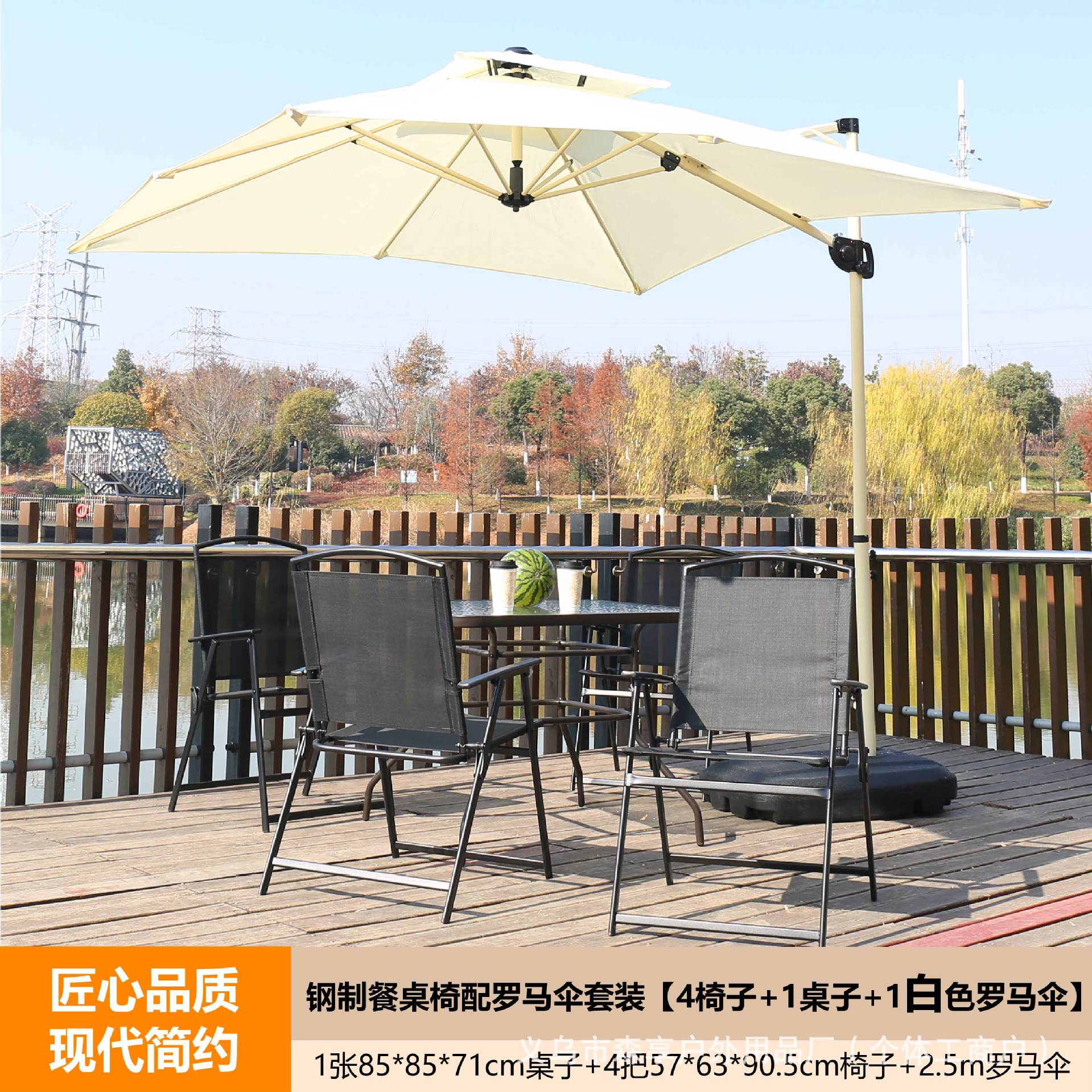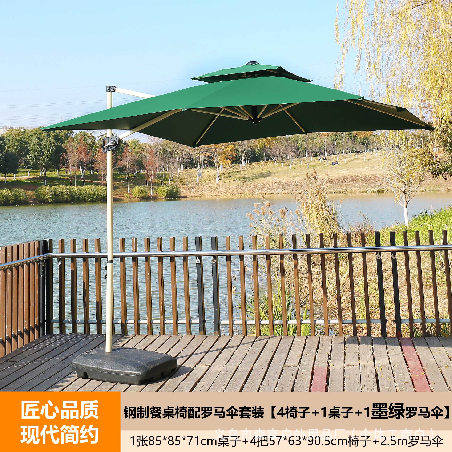 • 짙은 녹색 로마 우산 + 강철 식탁과 의자