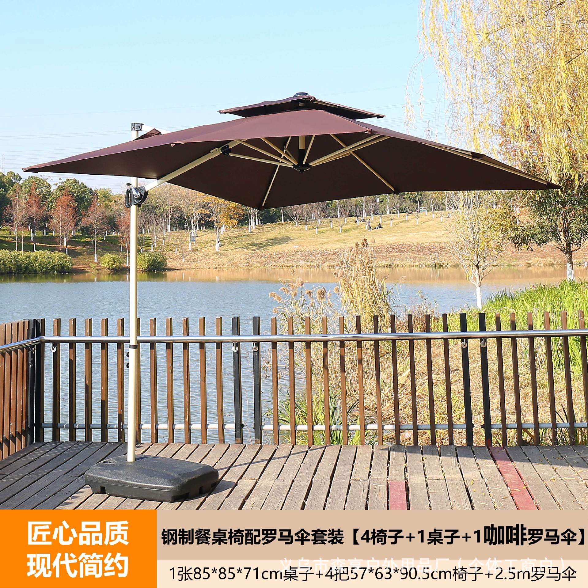 • 브라운 로마우산 + 스틸 식탁과 의자