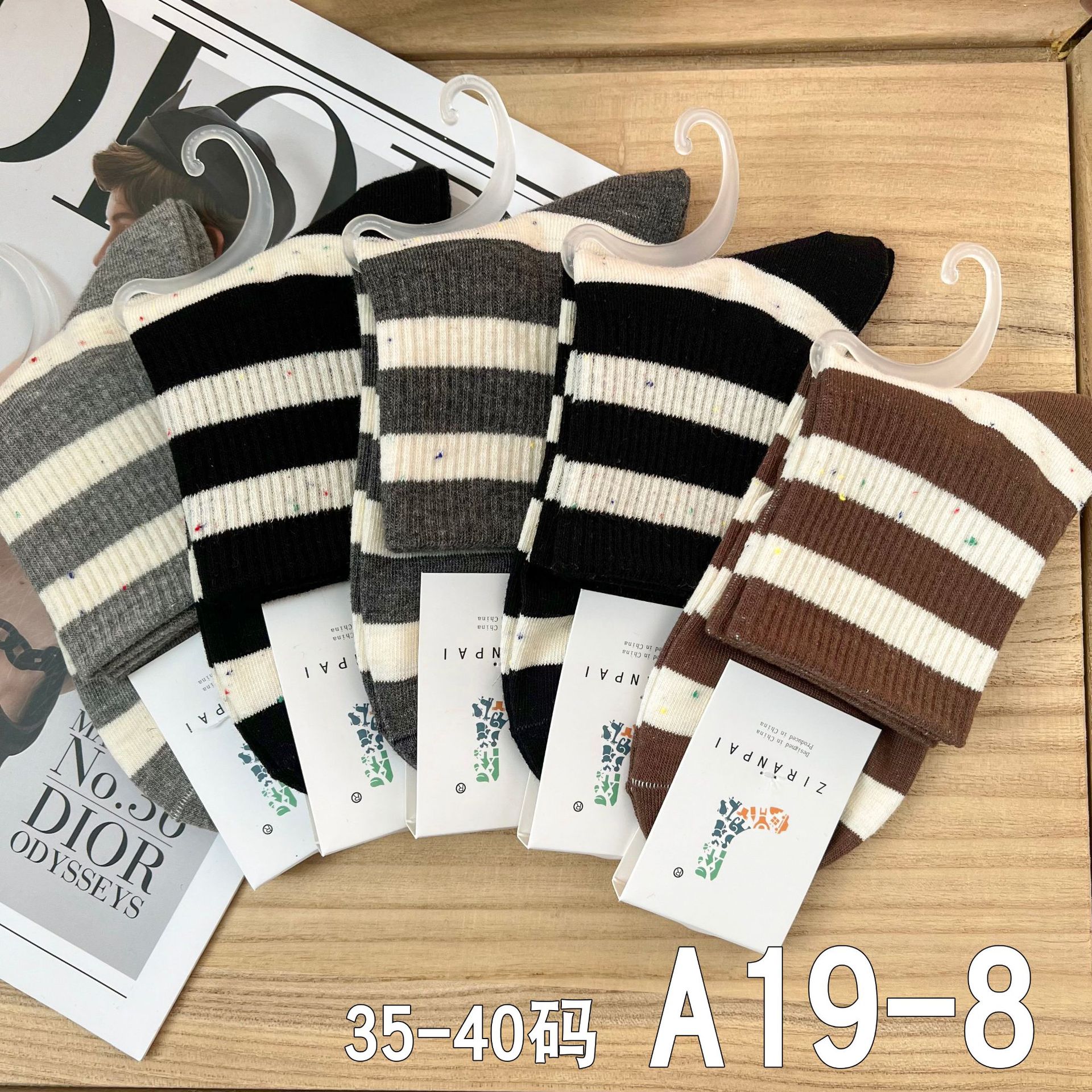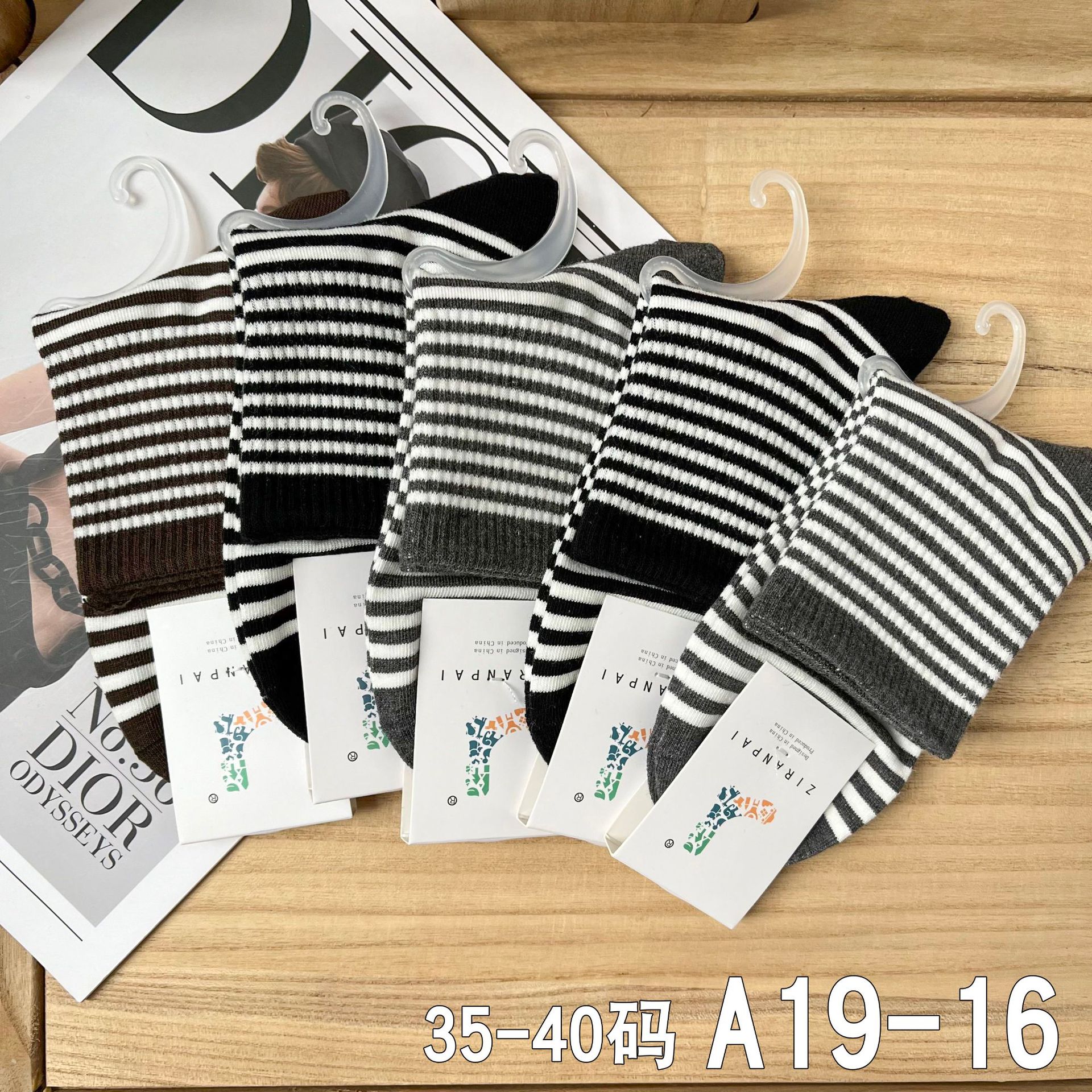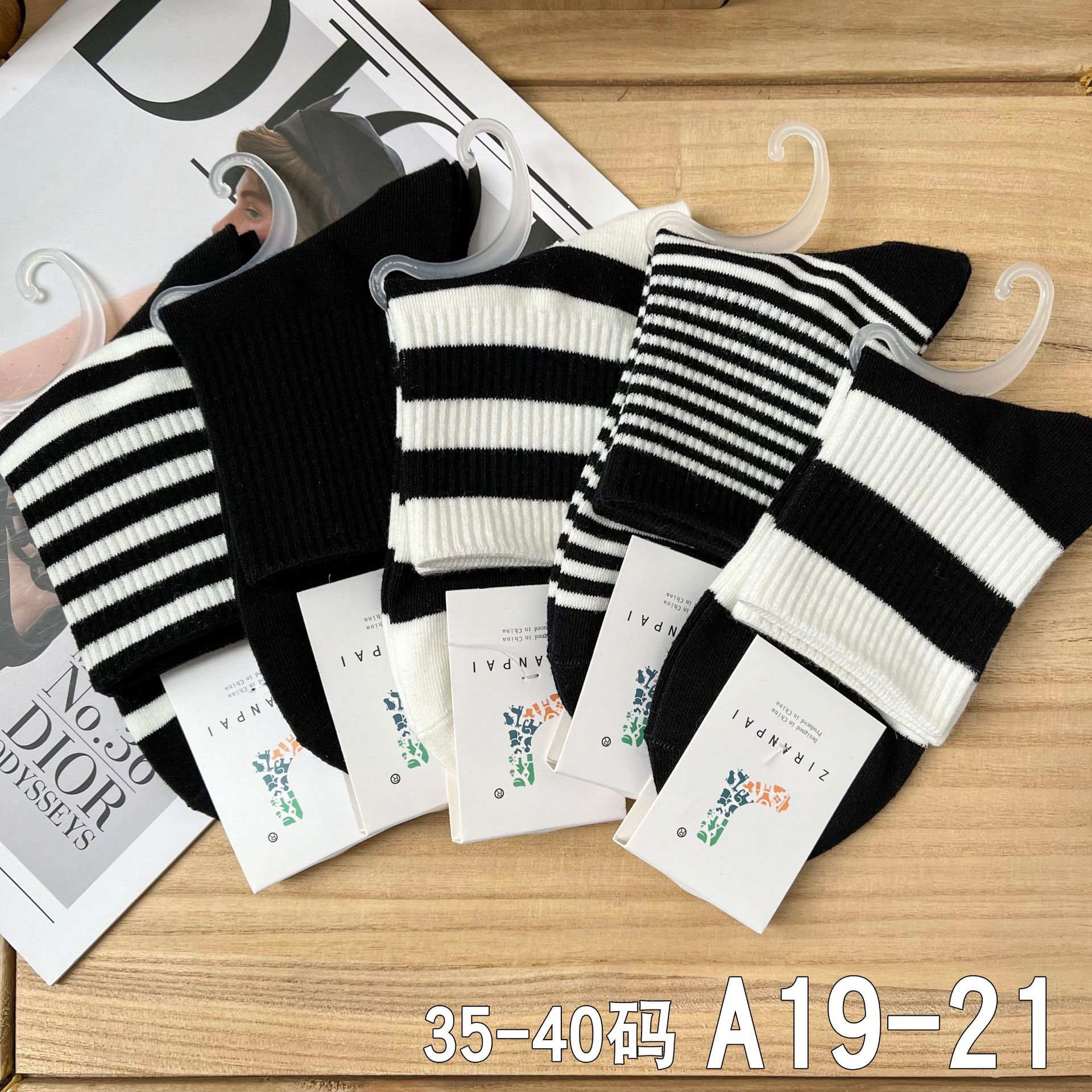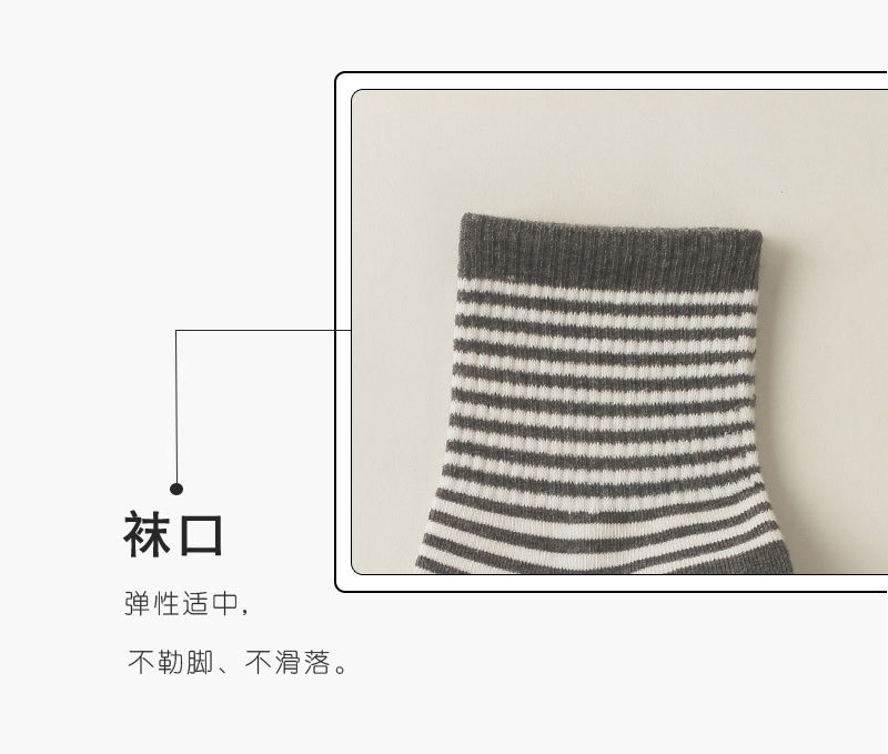 • A19-17 여성용 중간 길이 흰색 양말, 검정색 얇은 줄무늬