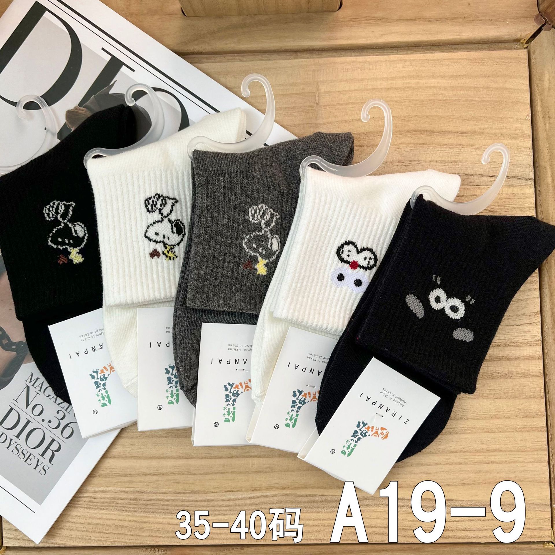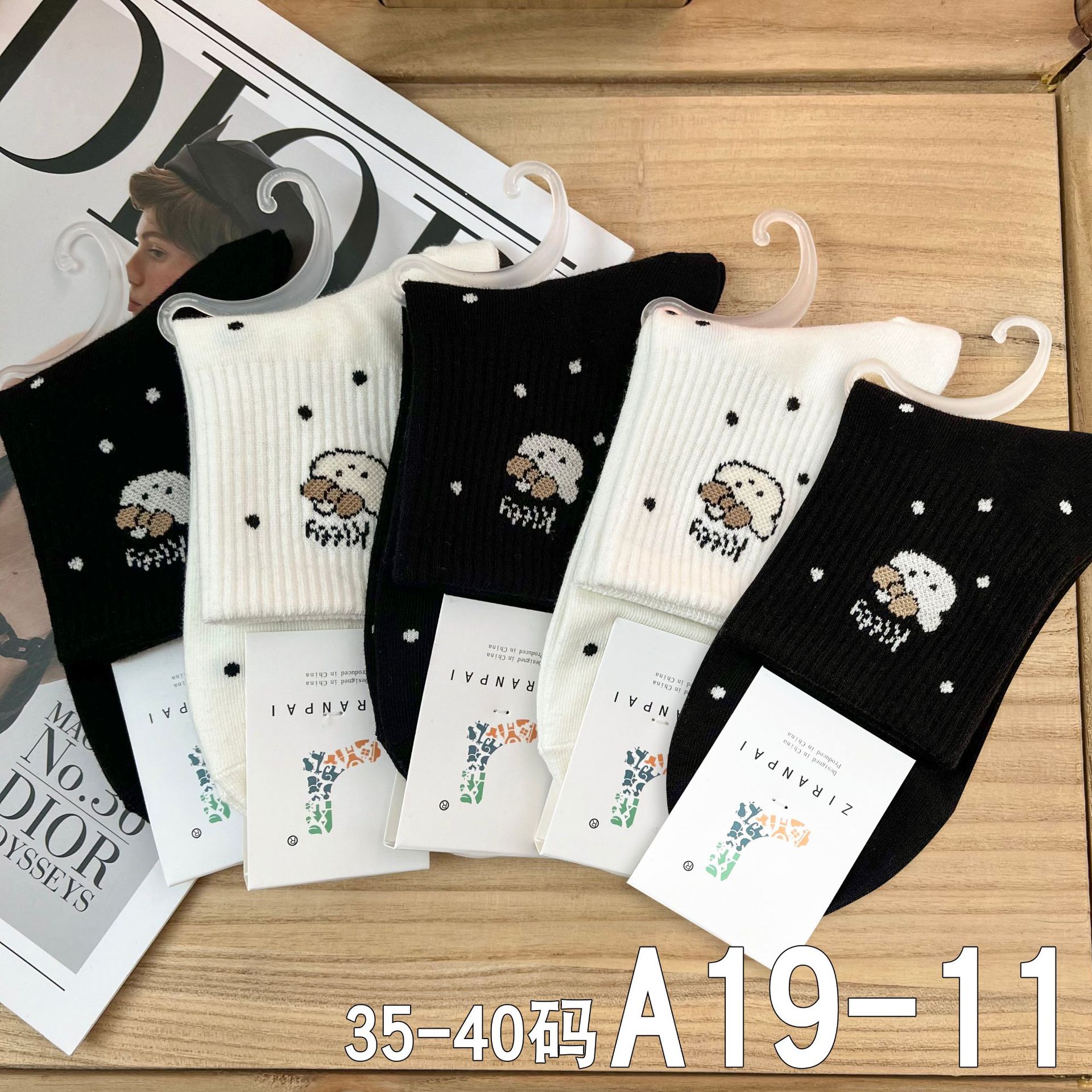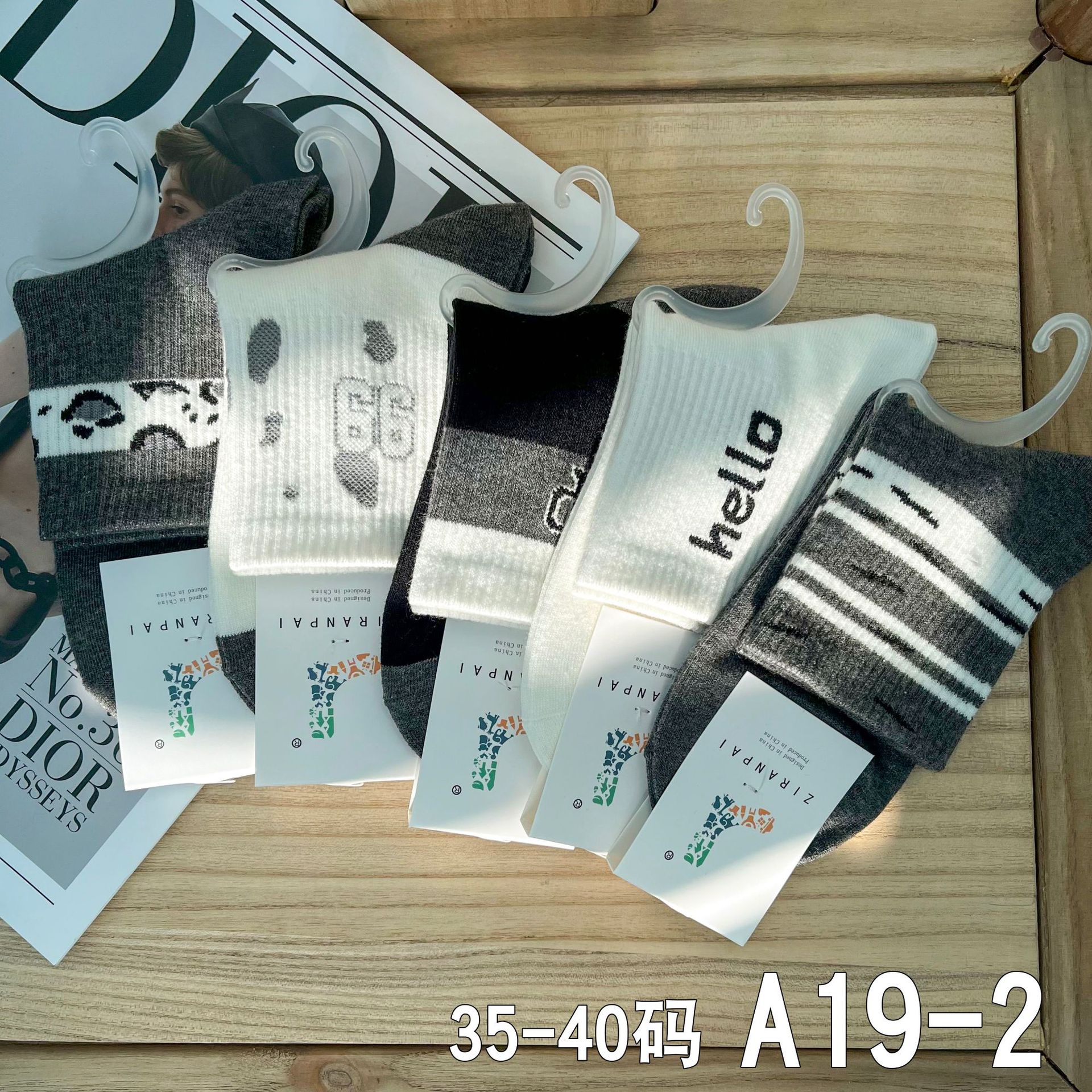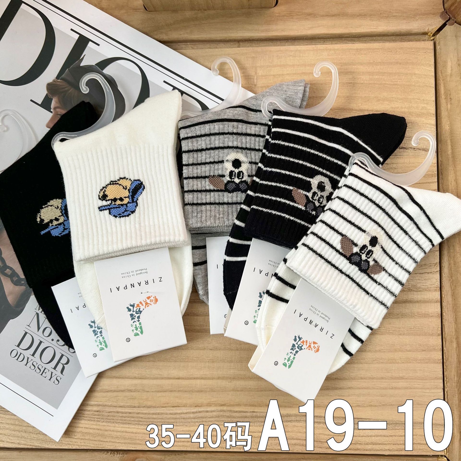 • A19-17 여성용 중간 길이 흰색 양말, 검정색 얇은 줄무늬