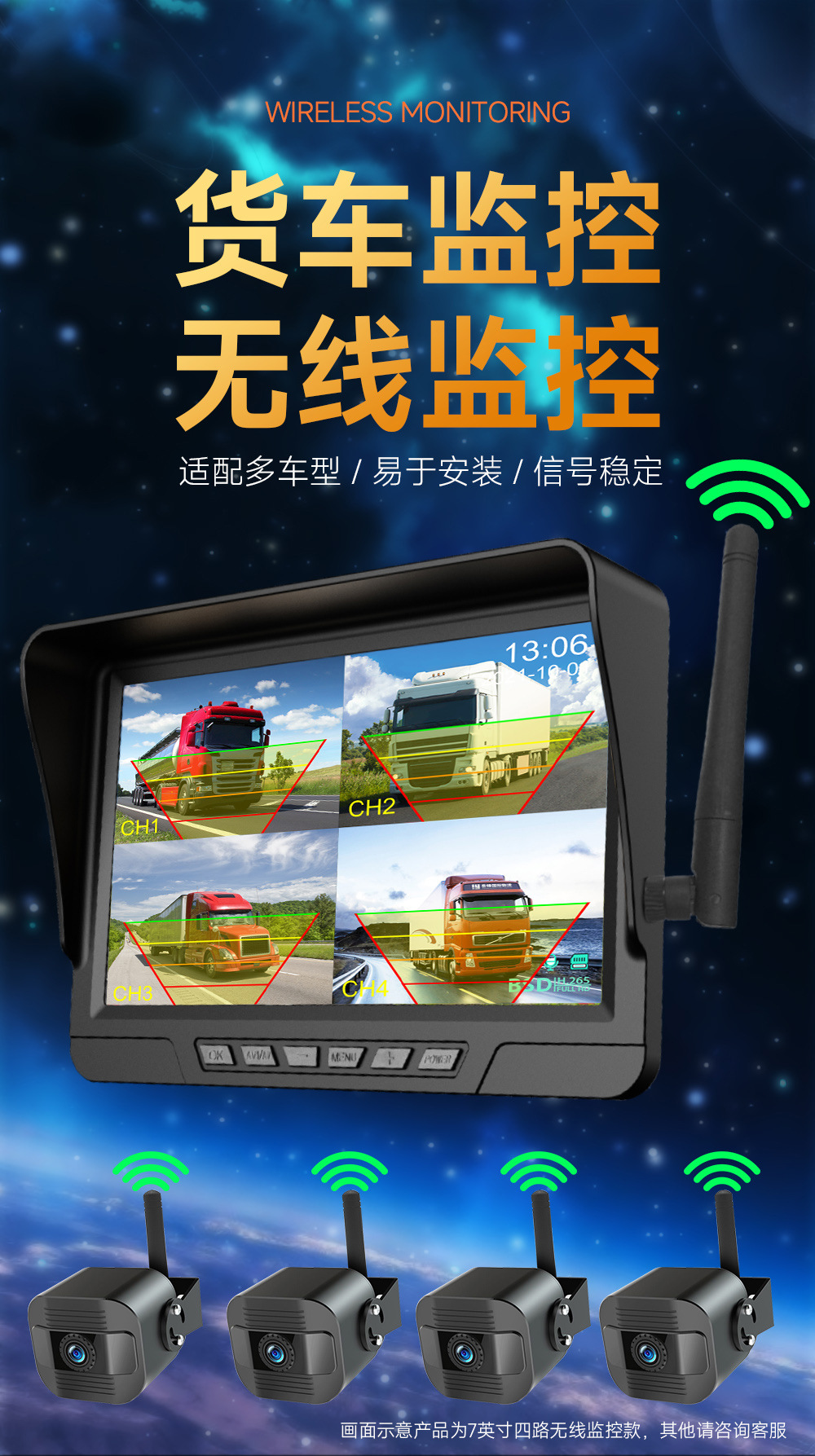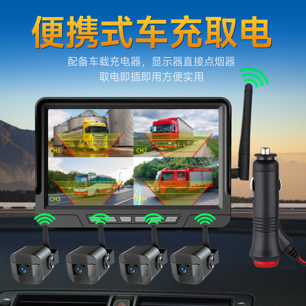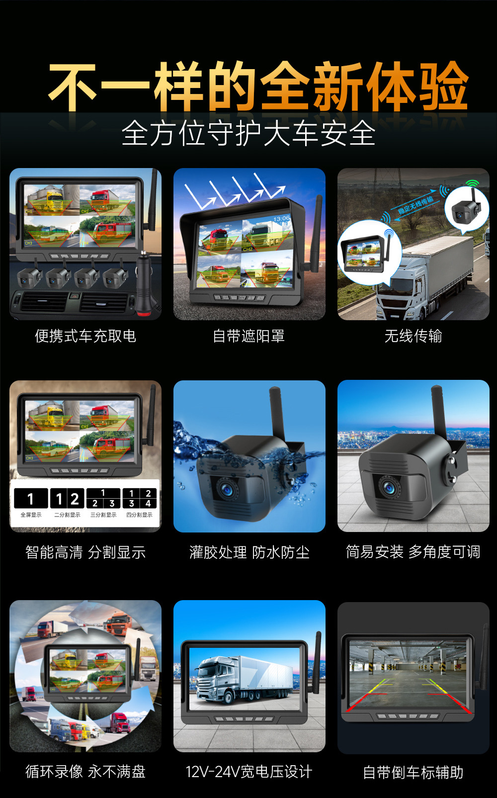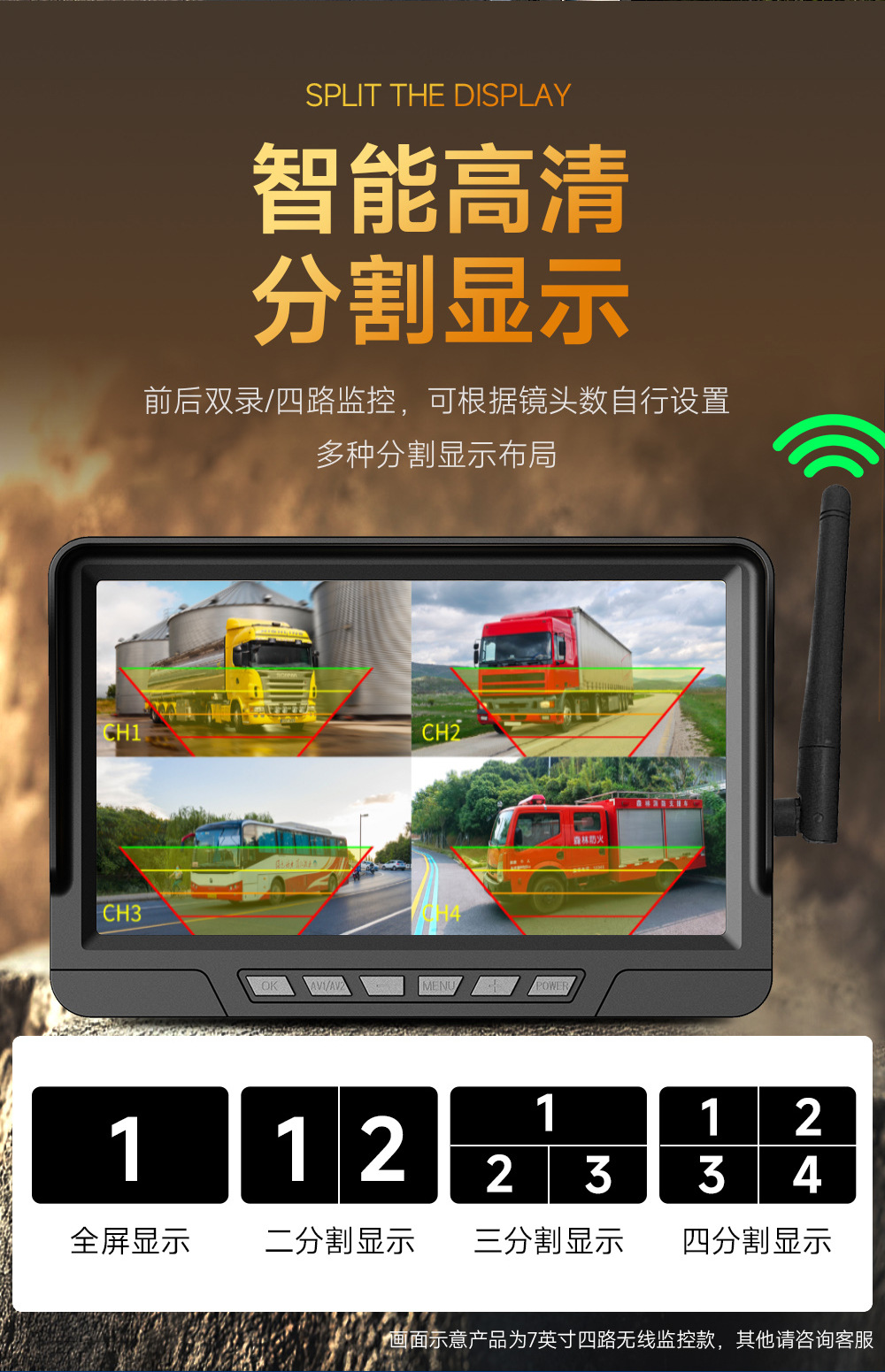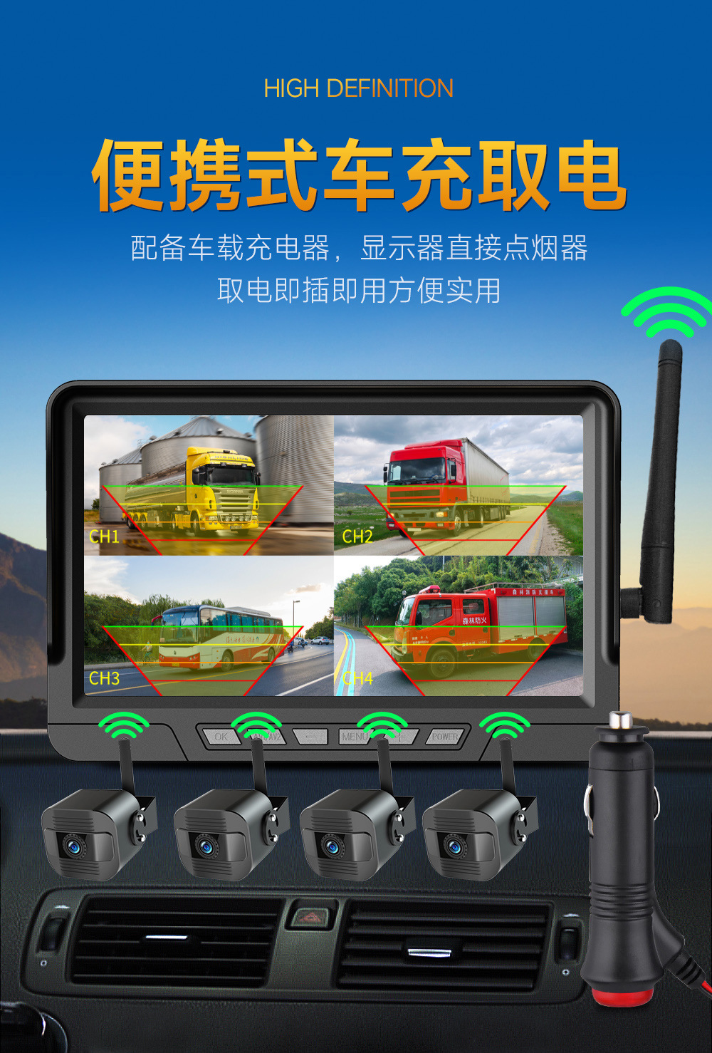 此款可以选择搭配7寸/10寸屏幕的无线记录仪,支持多种语言版本,可选1~4路,产品安装方便,操作简单,无需布线,屏幕点烟器供电 即插即用,带BSD算法