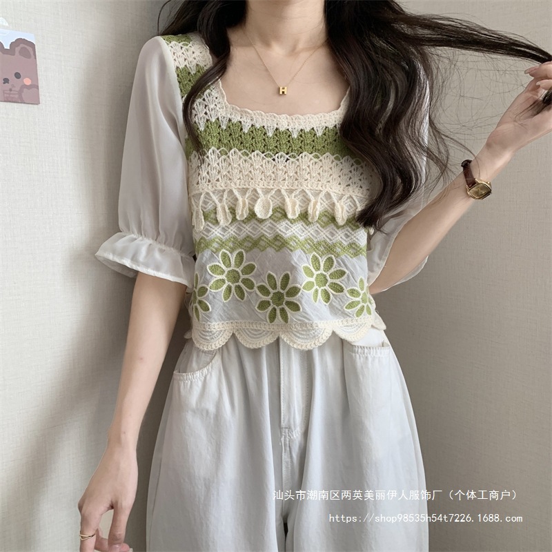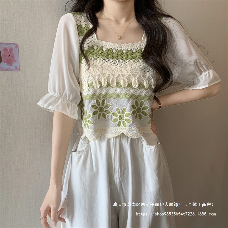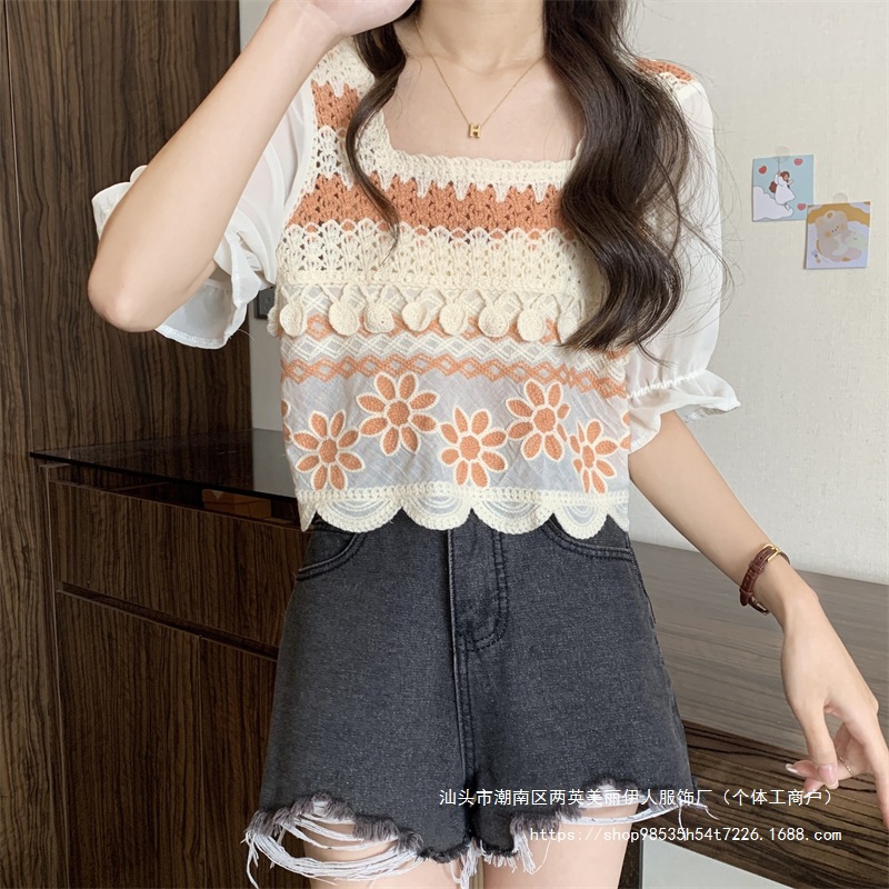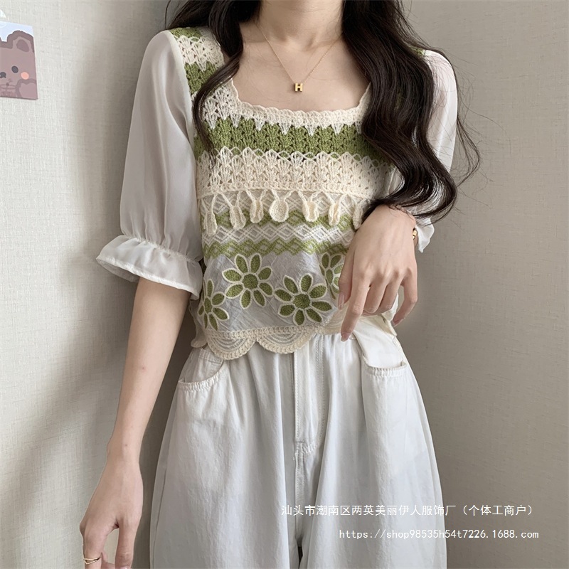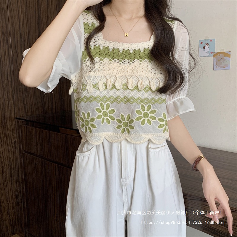 프랑스 스타일 부드러운 크로 셰 뜨개질 반팔 니트 스웨터 여성의 여름 새로운 스티칭 쉬폰 셔츠 작은 나이 감소 쇼트 탑스토어 가기
