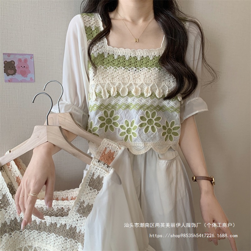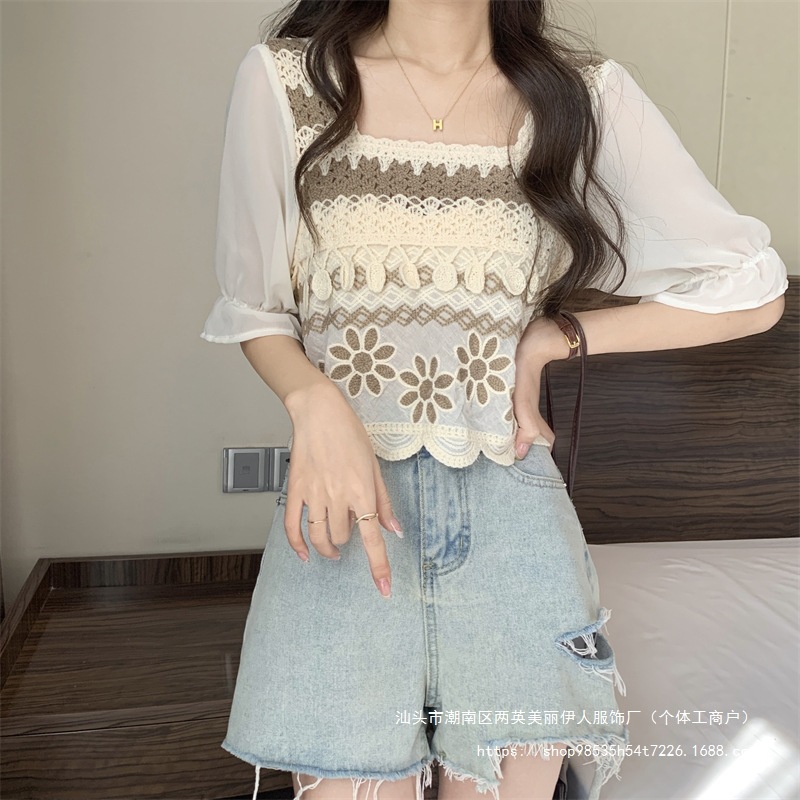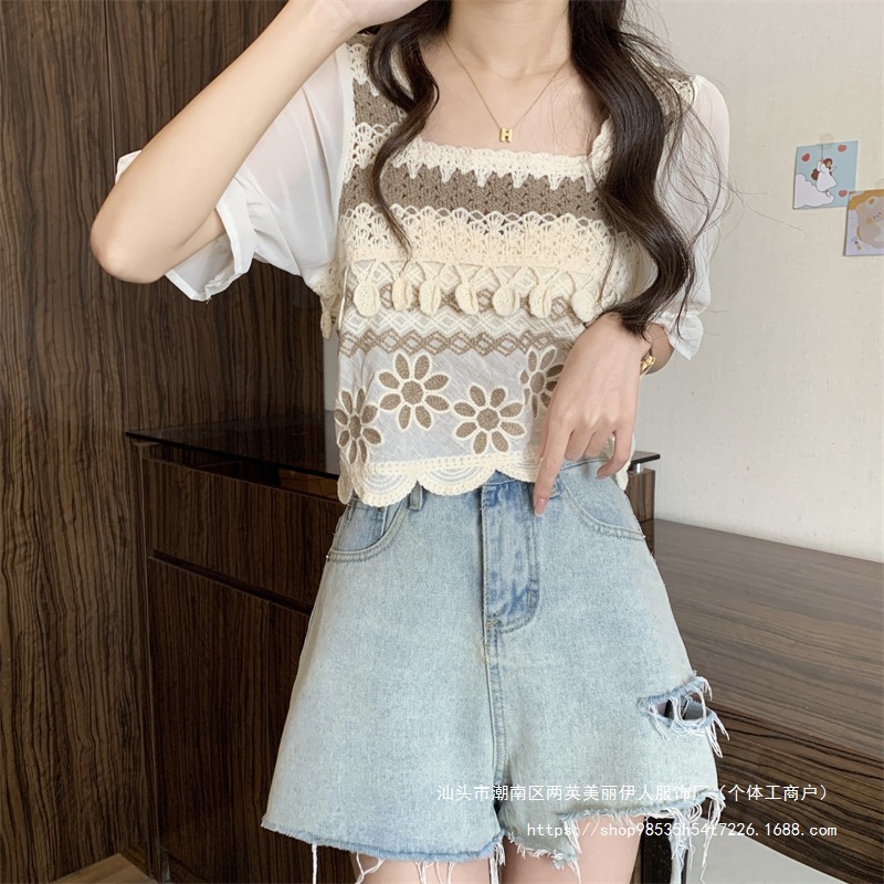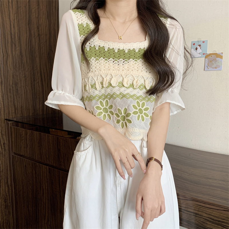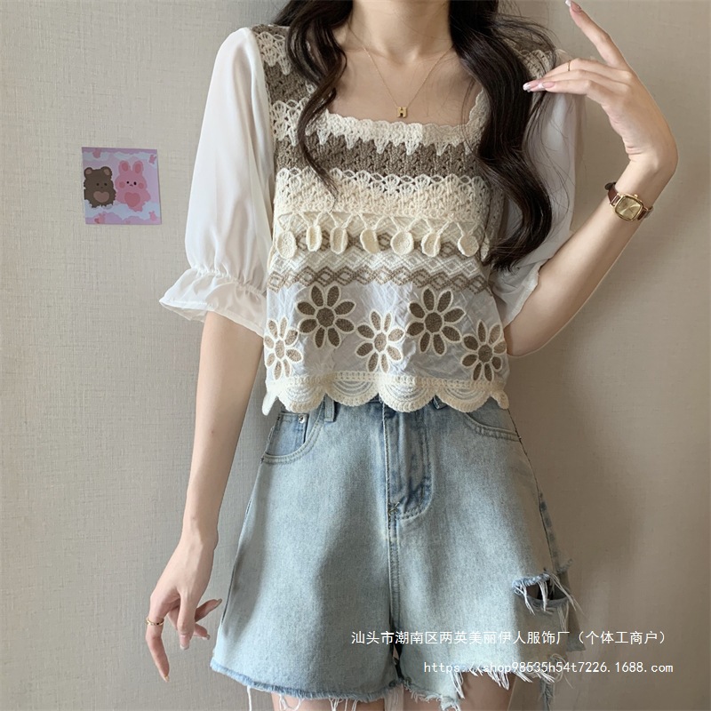 프랑스 스타일 부드러운 크로 셰 뜨개질 반팔 니트 스웨터 여성의 여름 새로운 스티칭 쉬폰 셔츠 작은 나이 감소 쇼트 탑스토어 가기