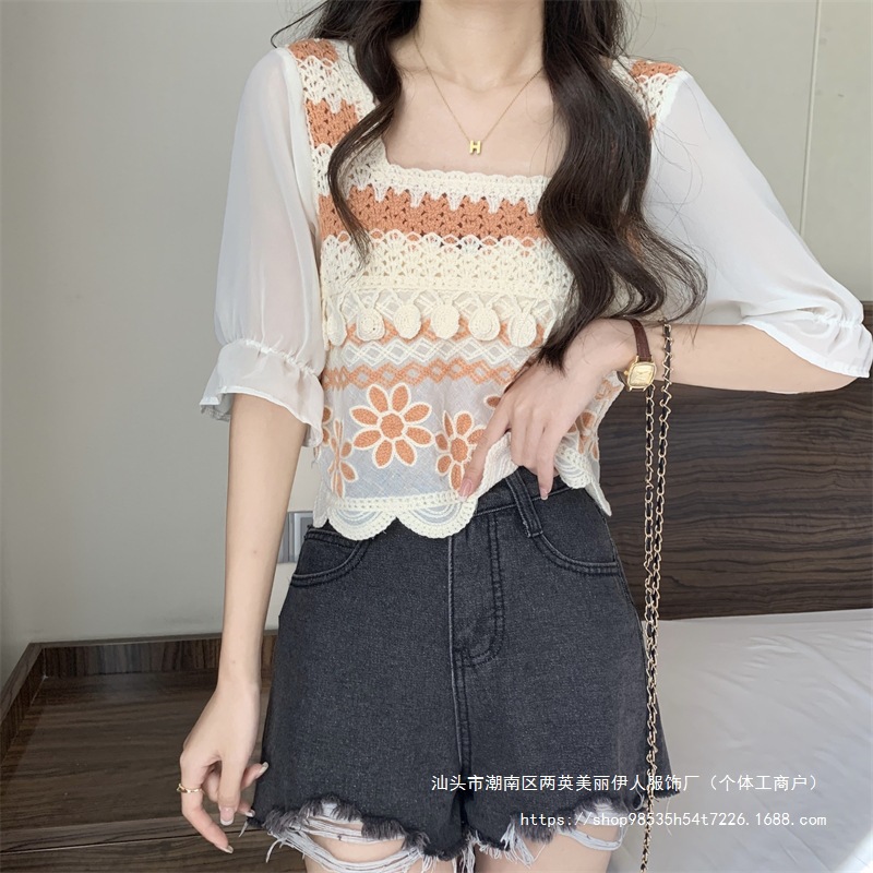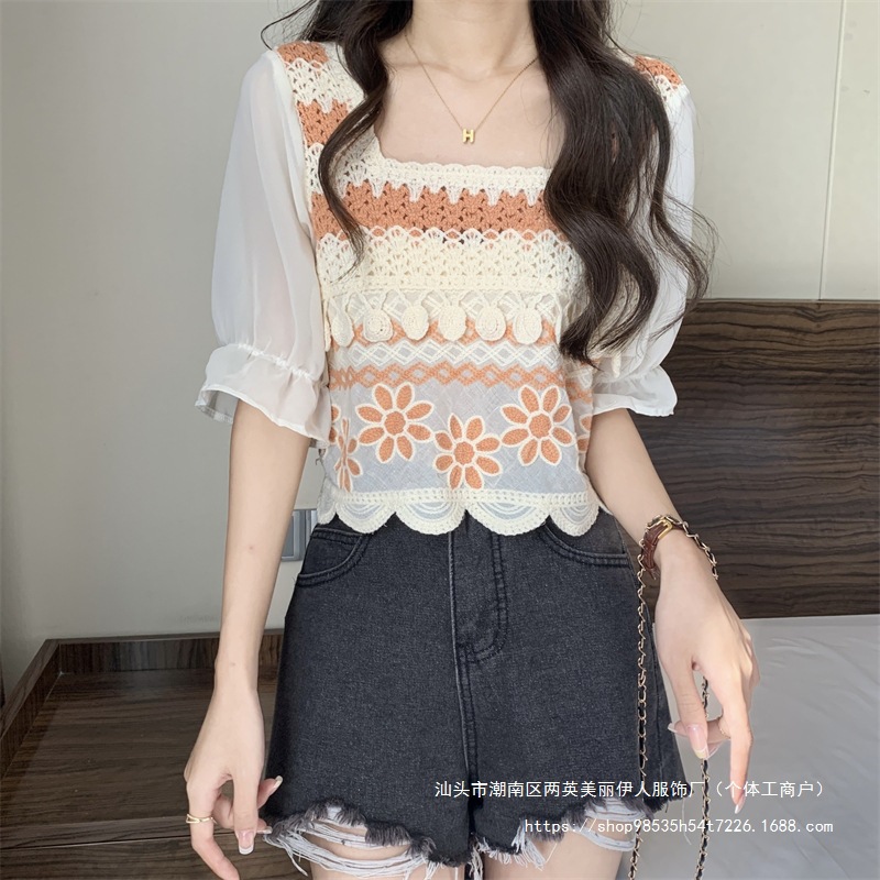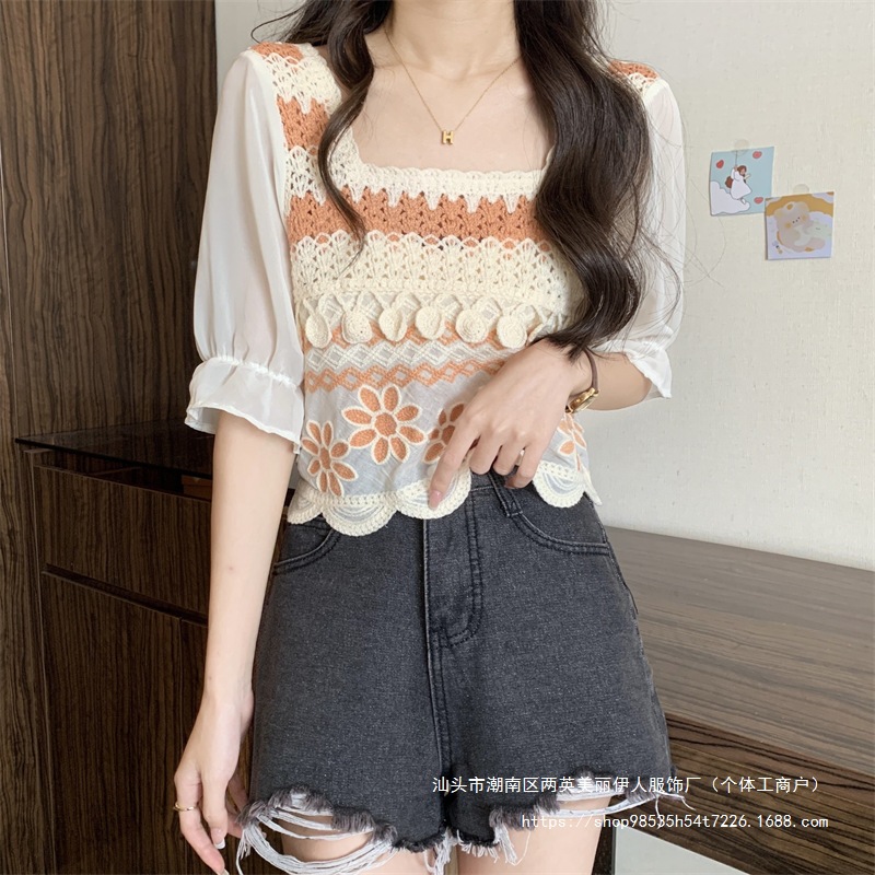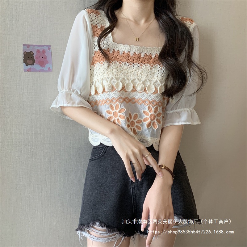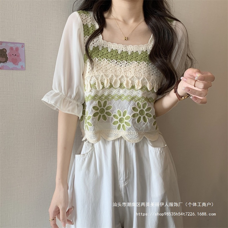 프랑스 스타일 부드러운 크로 셰 뜨개질 반팔 니트 스웨터 여성의 여름 새로운 스티칭 쉬폰 셔츠 작은 나이 감소 쇼트 탑