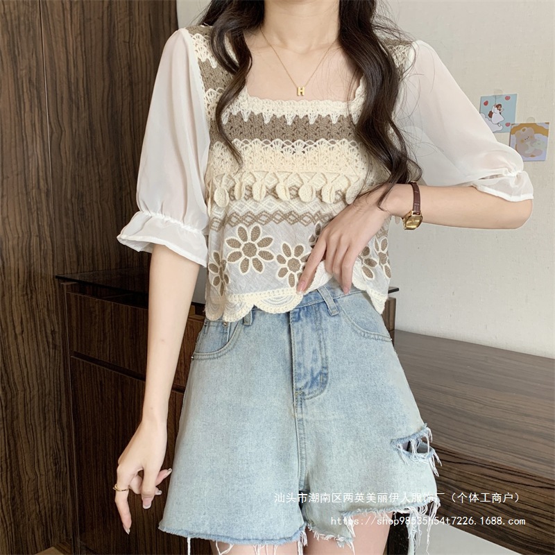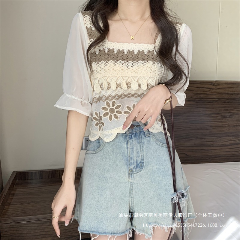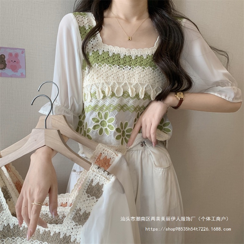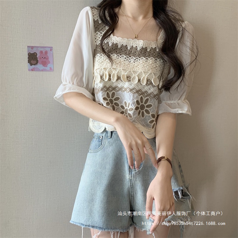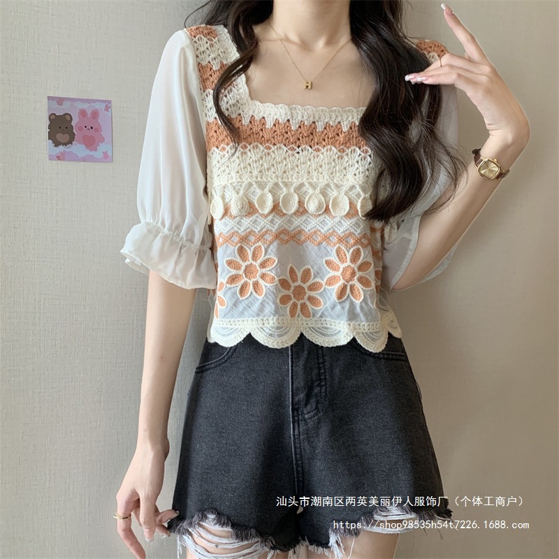 프랑스 스타일 부드러운 크로 셰 뜨개질 반팔 니트 스웨터 여성의 여름 새로운 스티칭 쉬폰 셔츠 작은 나이 감소 쇼트 탑