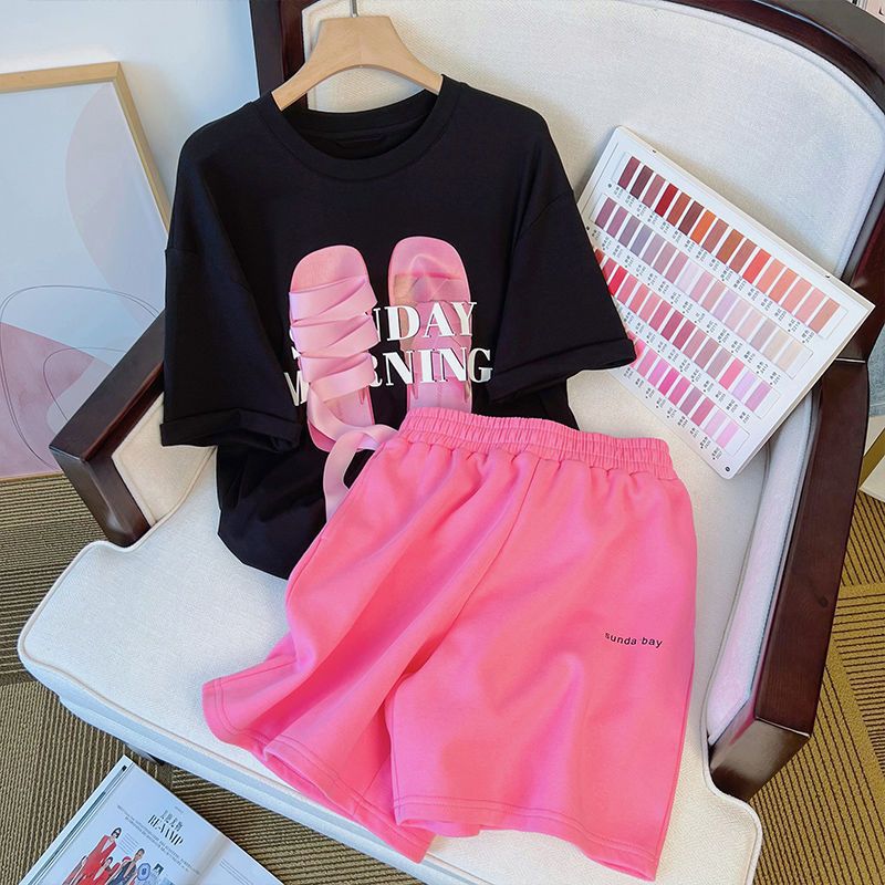 여성 여름 2025 신상 세트, 세련되고 나이를 덜어보이는 디자인, 틈새시장 소형 사이즈 스포츠 반바지 투피스 세트, 입체 프린팅