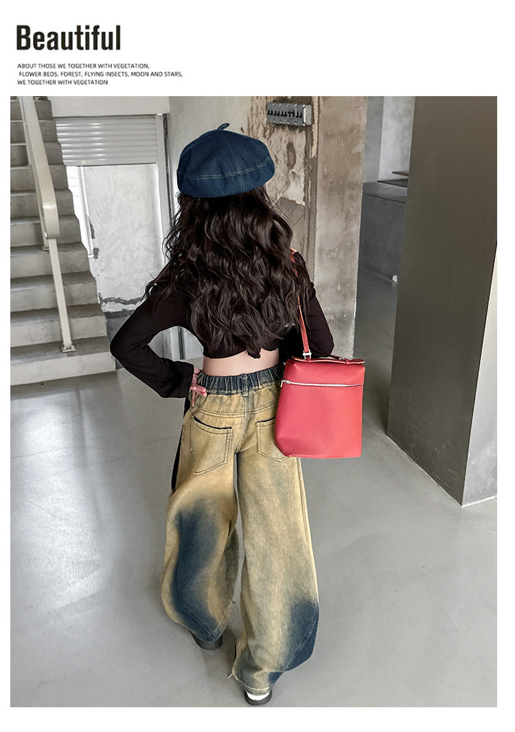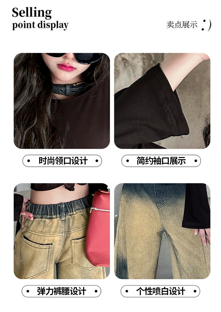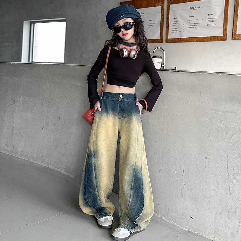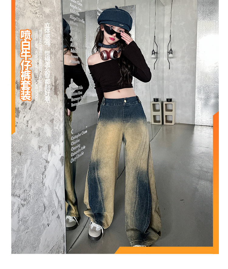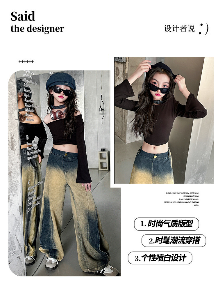 소녀의 봄과 가을 세트 2025 새로운 유행 후드 니트 어깨 스웨터 데님 시미 터 팬츠 트렌디스토어 가기