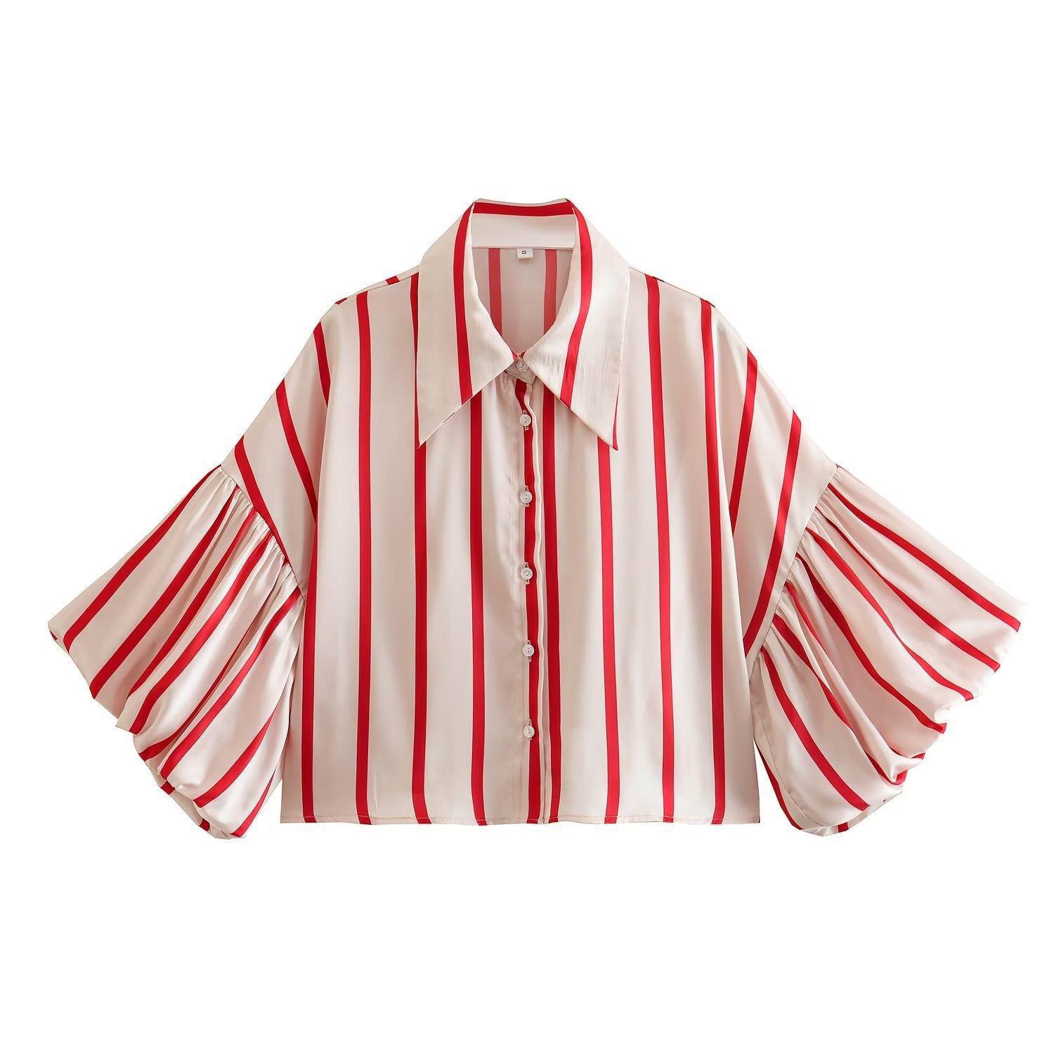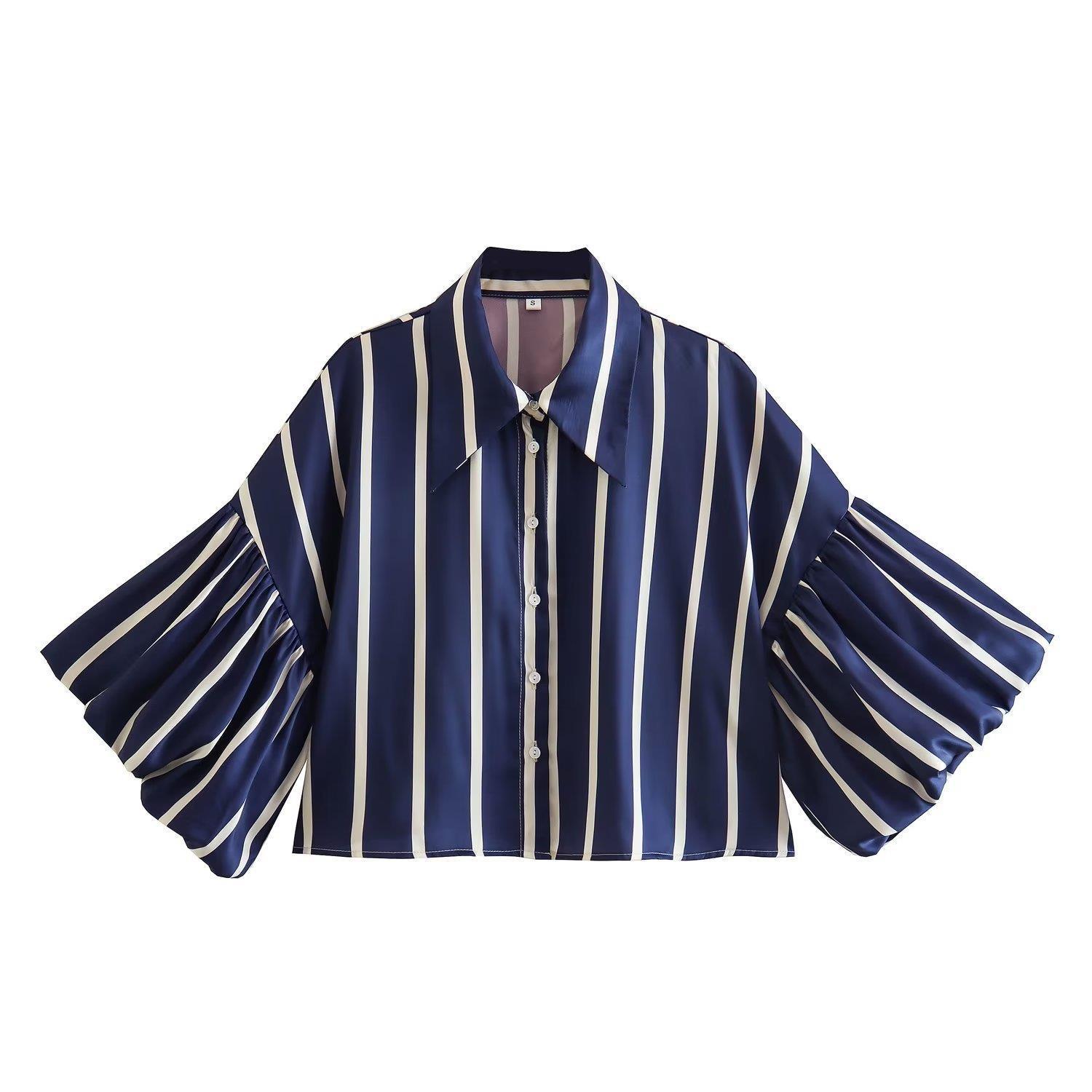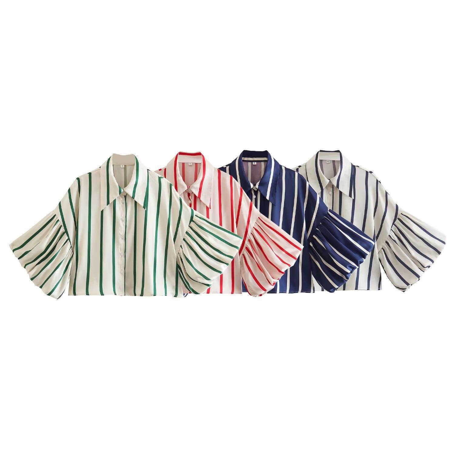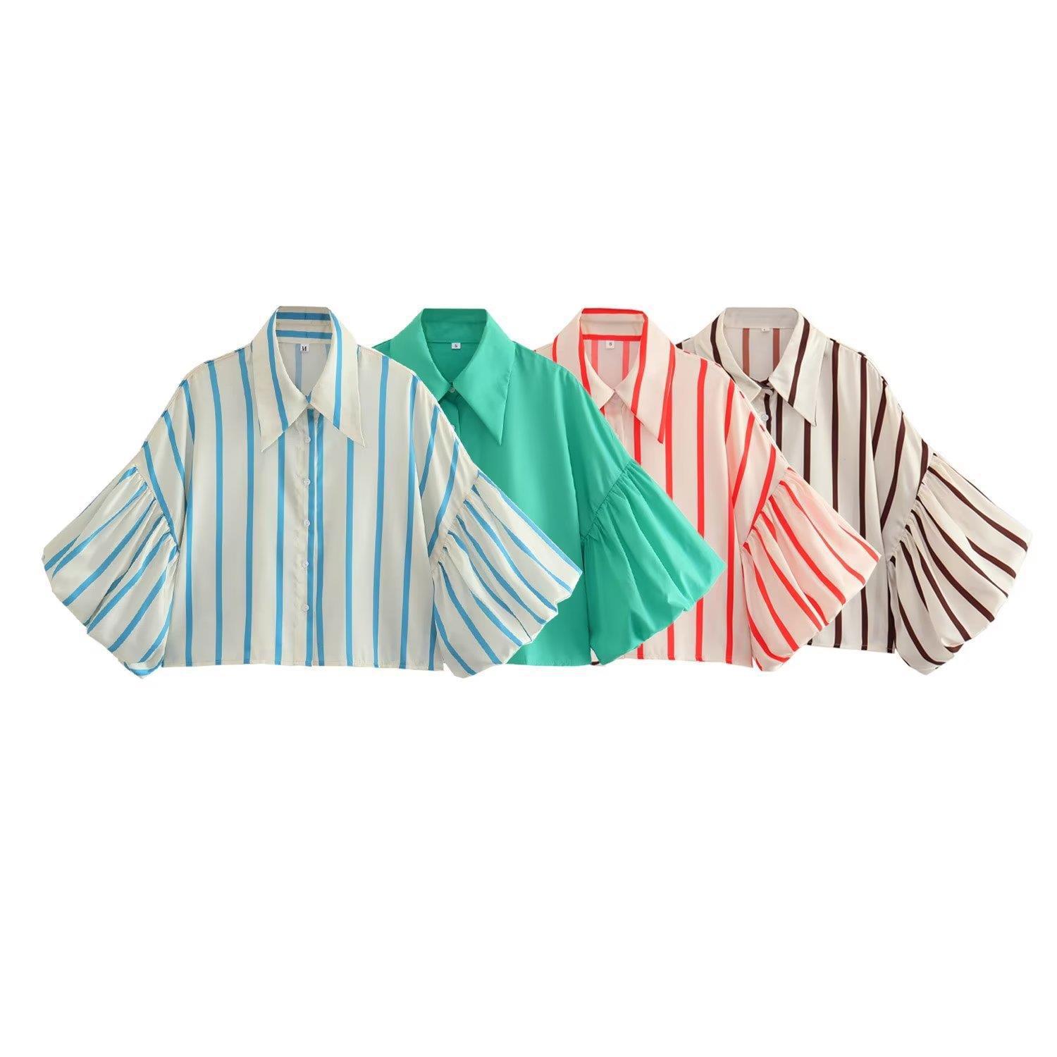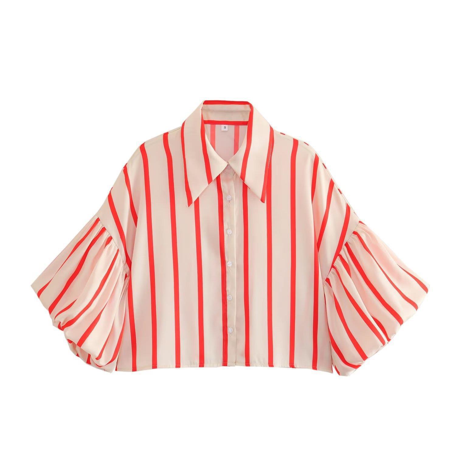 대외 무역 목록! 여성의 봄 새로운 느슨한 캐주얼 줄무늬 랜턴 소매 짧은 셔츠 여성용 탑
