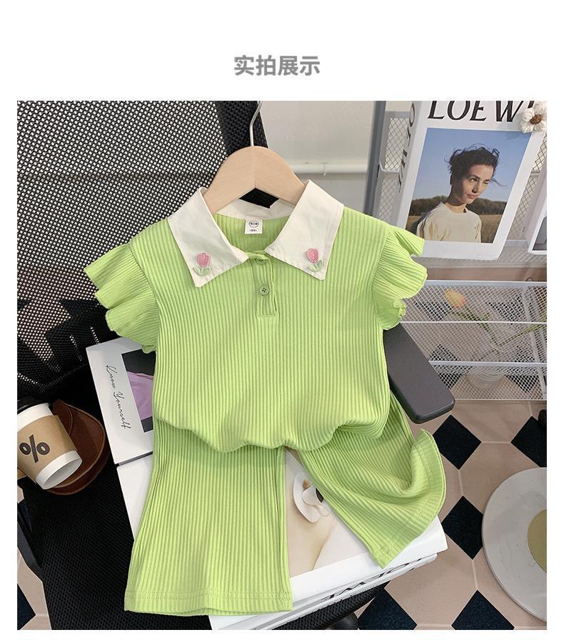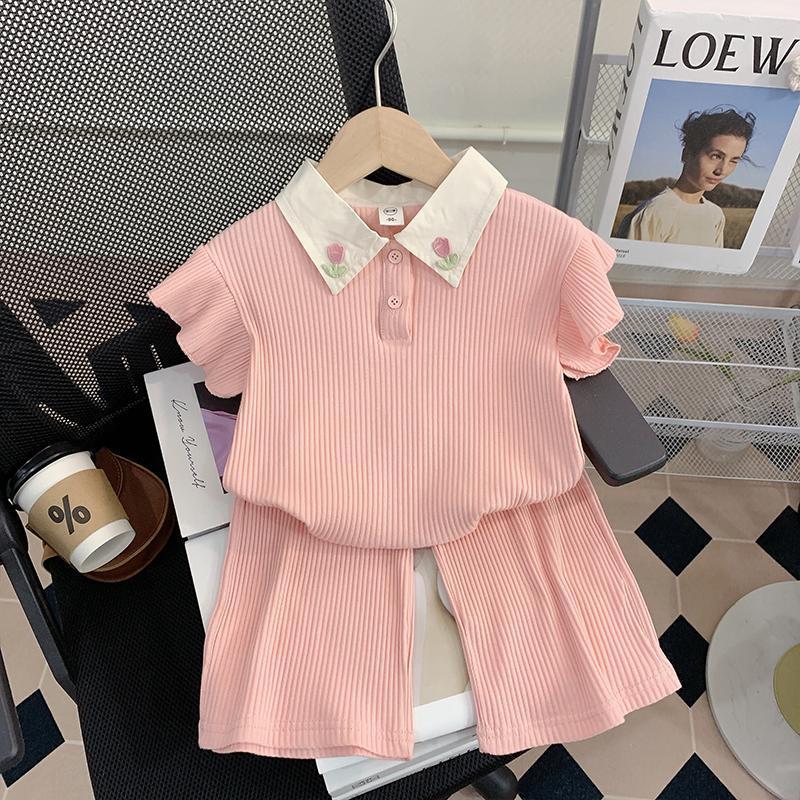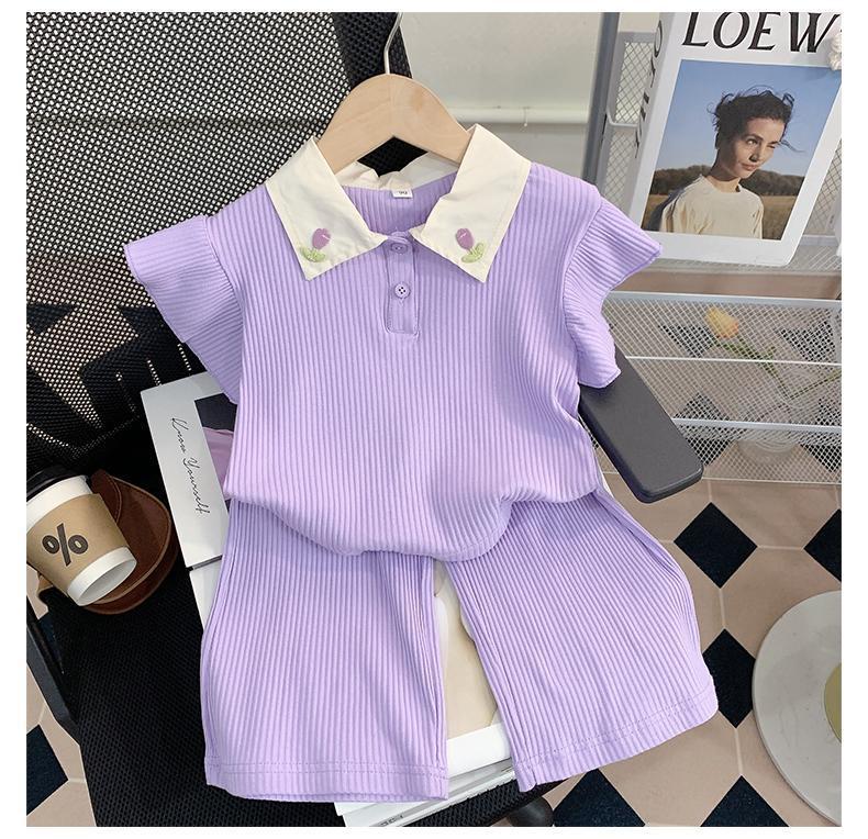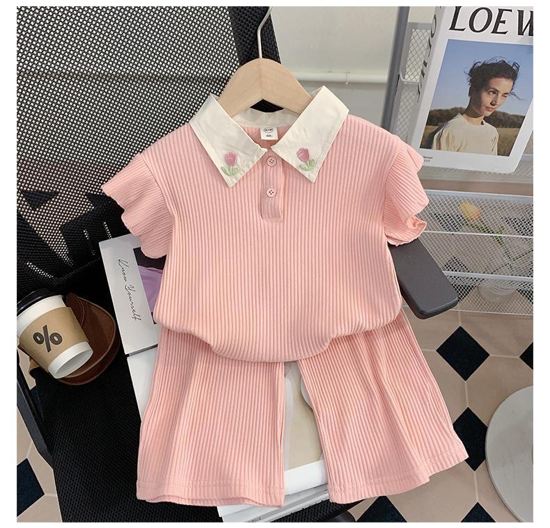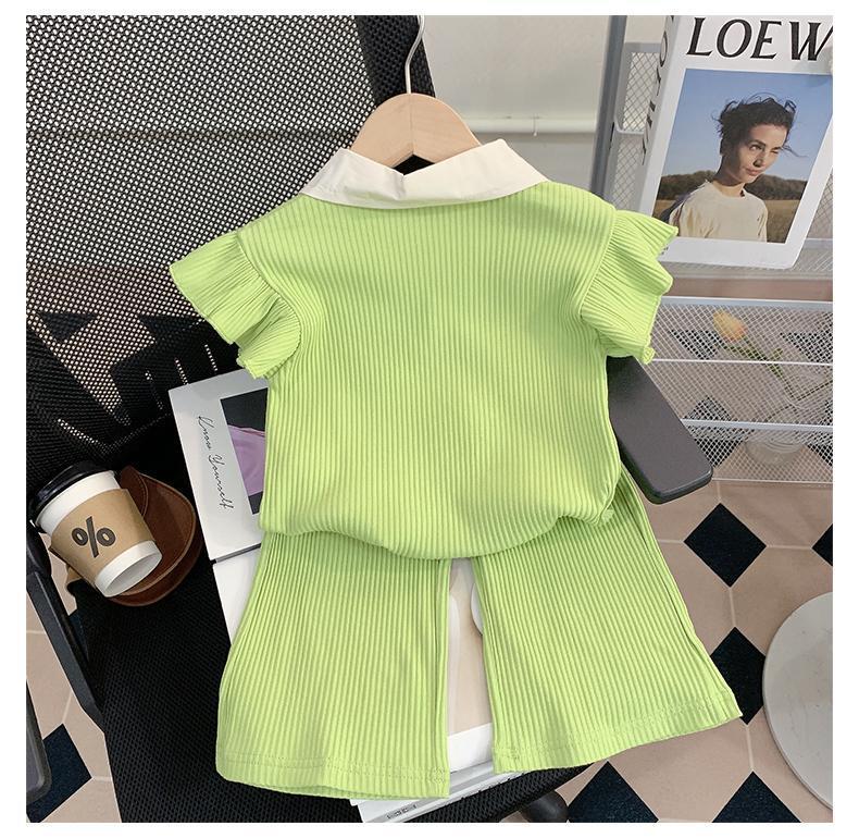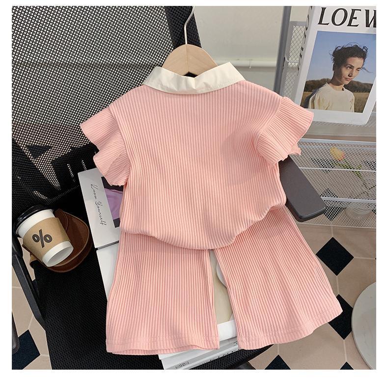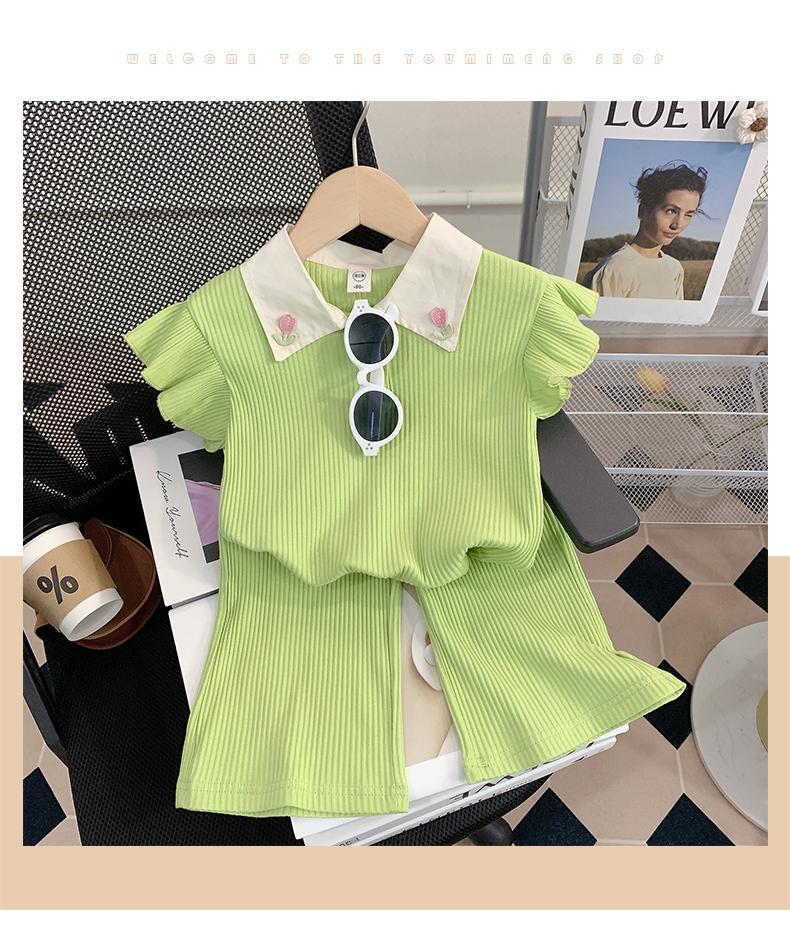 소녀 세트 여름 새로운 어린이 세련된 반팔 탑 아기 세련된 와이드 레그 바지 투피스 세트
