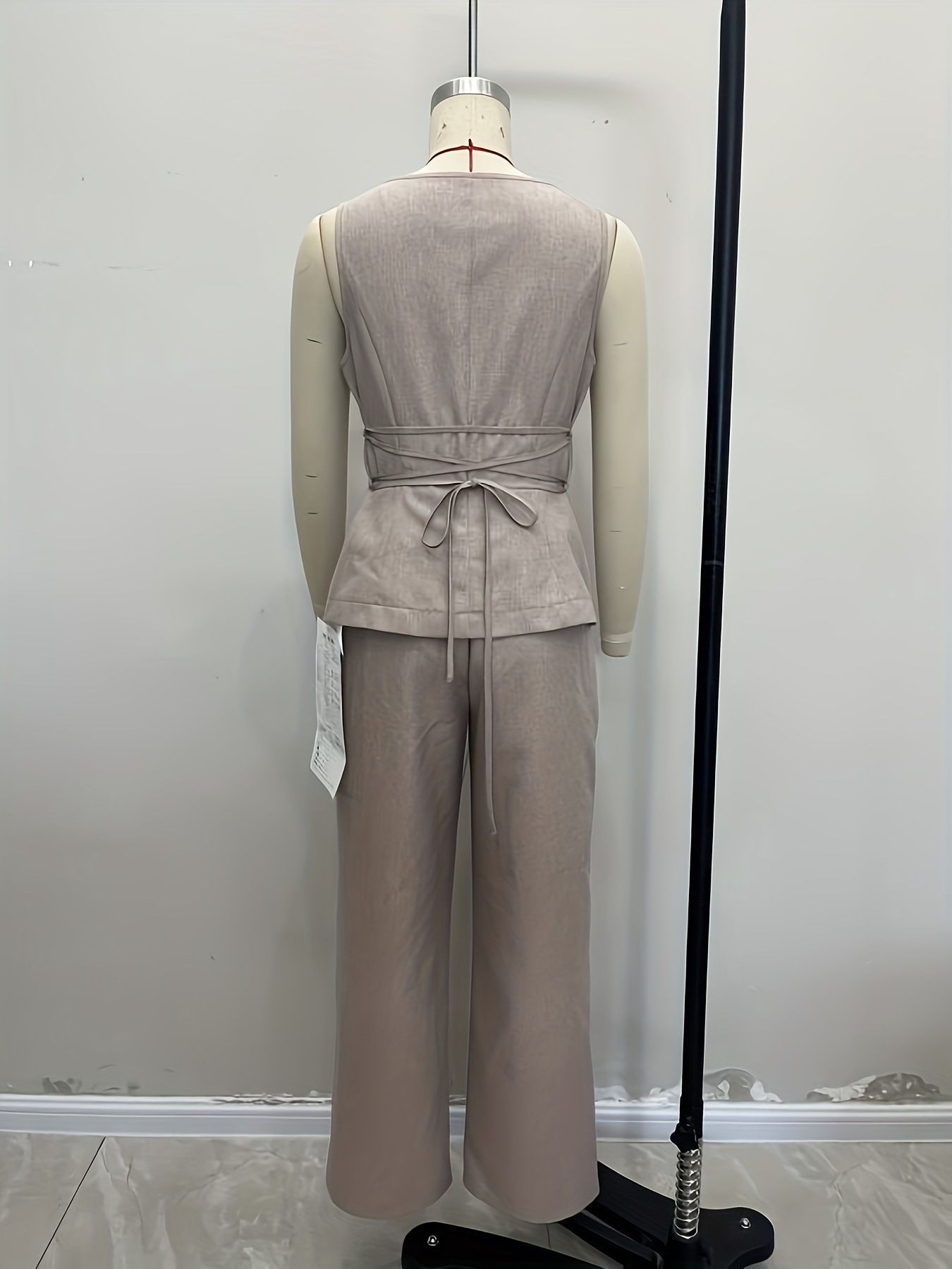봄과 여름 얇은 통기성 여성 2 피스 민소매 탑 스트랩 허리 프랑스 와이드 레그 바지 패션 세트