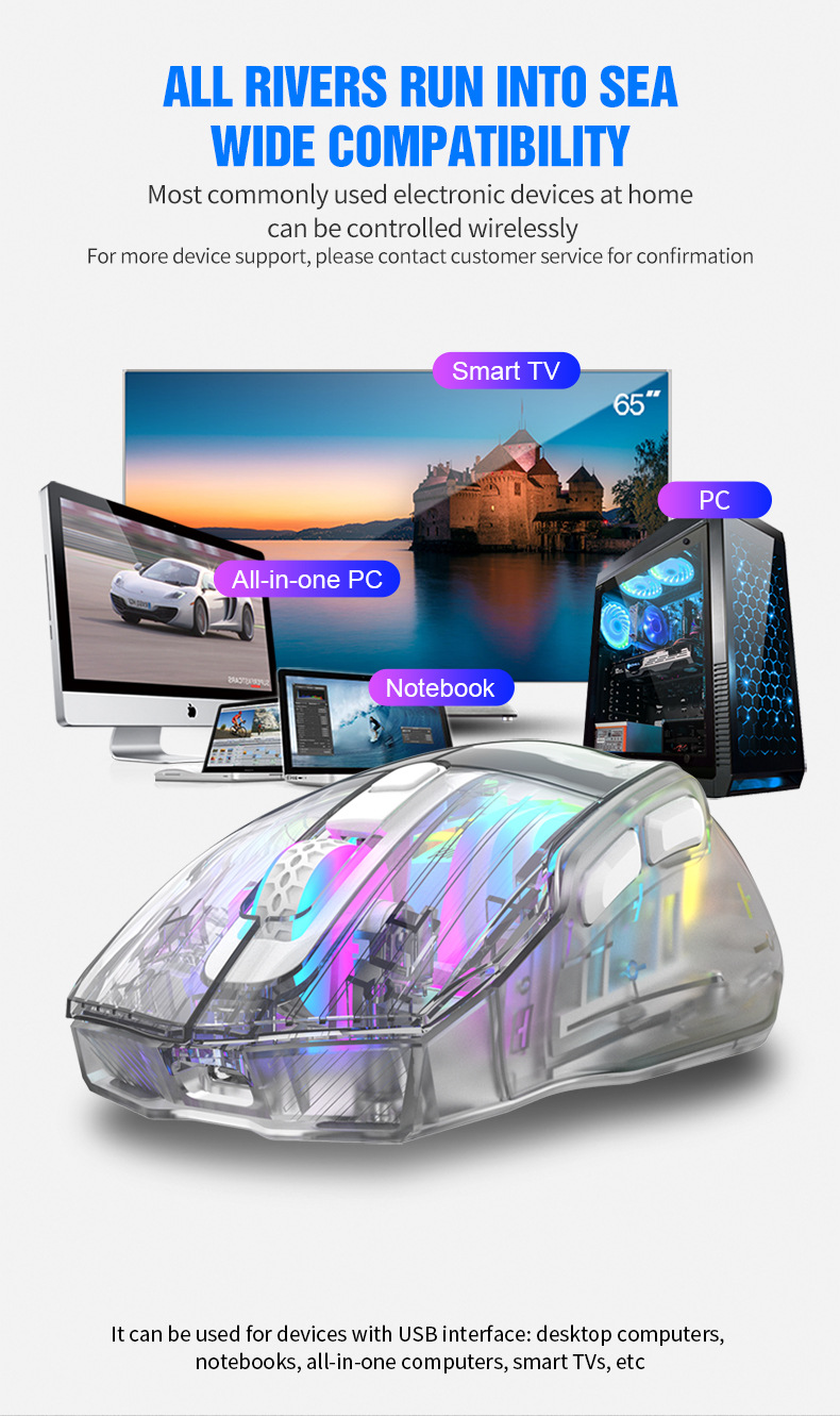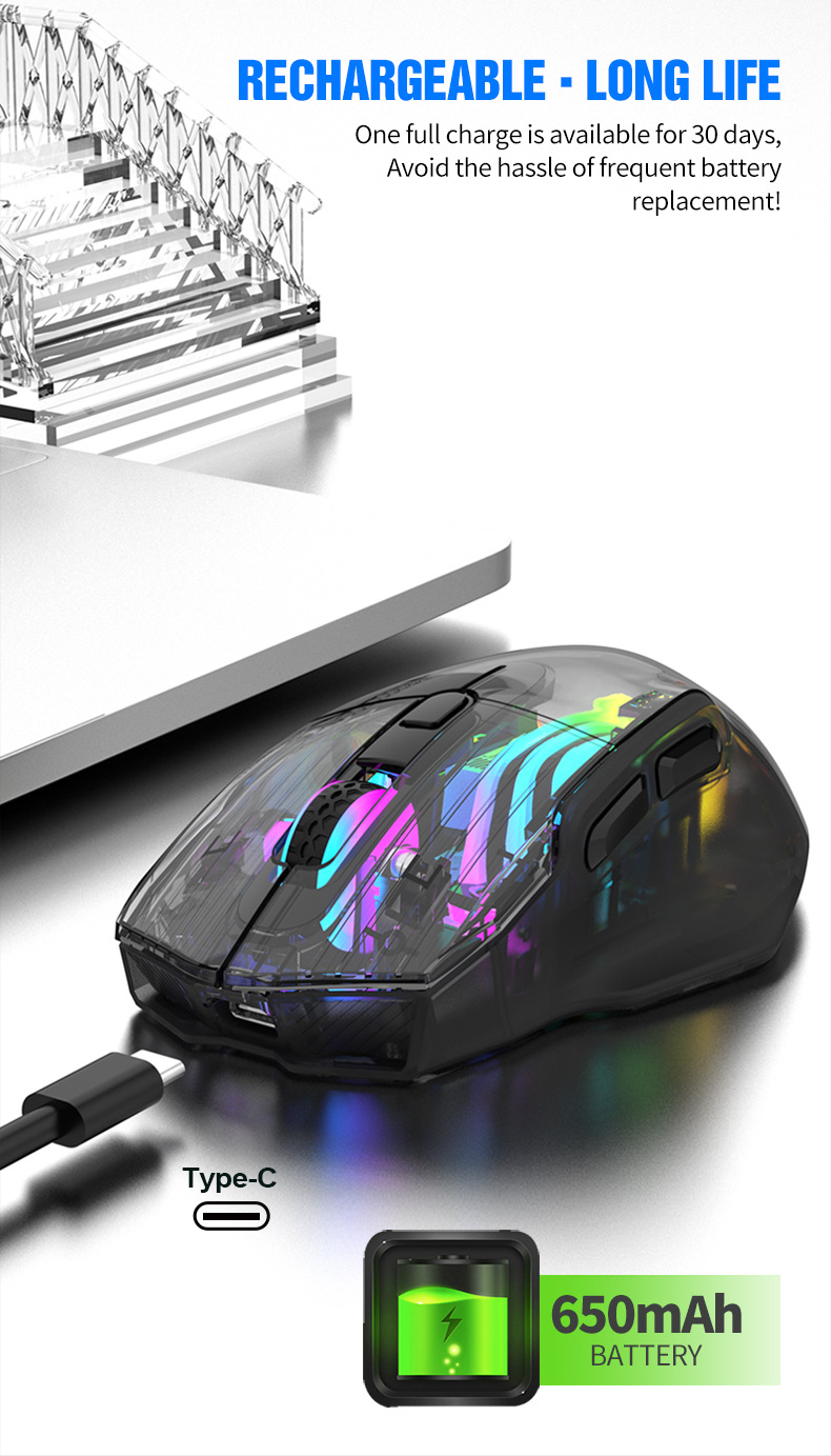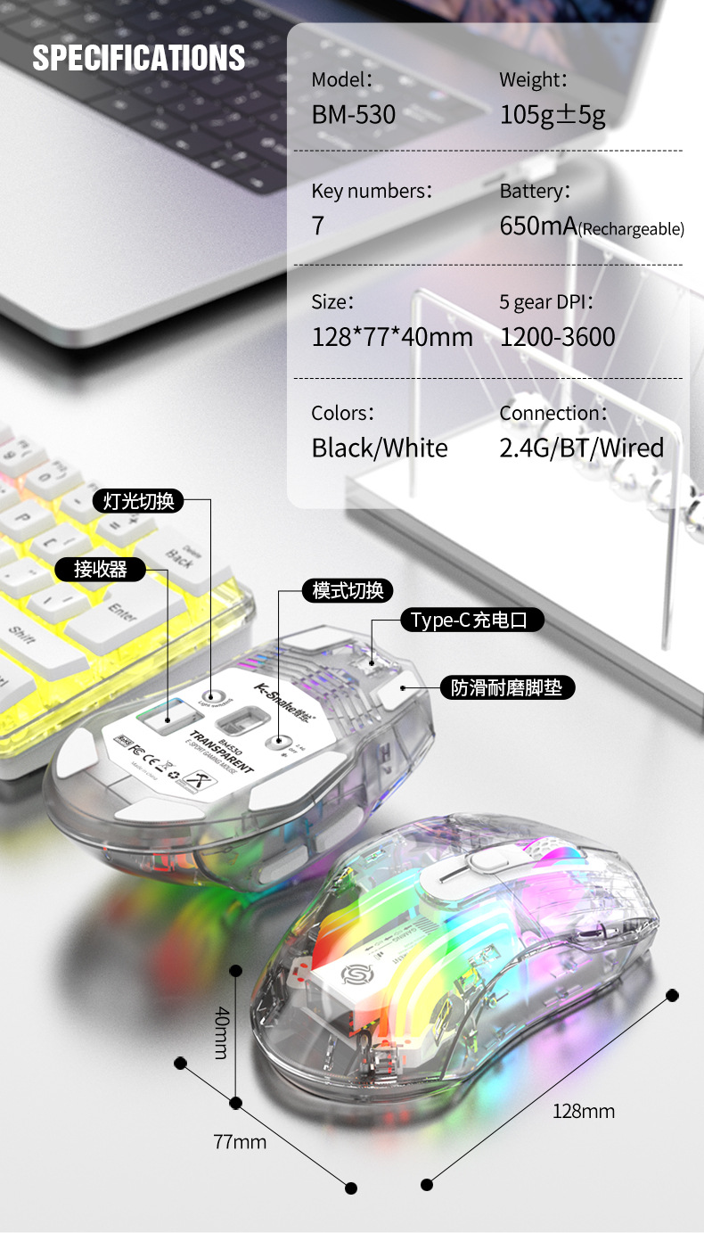 국경 투명 바이퍼 BM530 무선 3 모드 마우스 RGB 블루투스 2.4G 충전 게임 e 스포츠