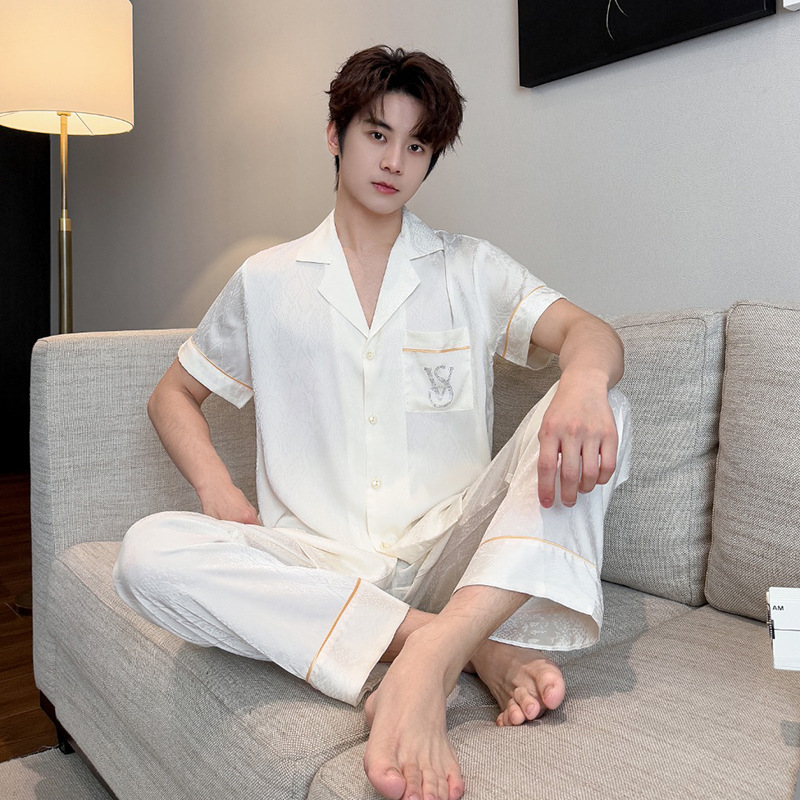 고급 아이스 실크 커플 파자마 여성의 봄 새로운 반팔 바지 자카드 핫 라인스톤 세트 플러스 사이즈 남성 홈 의류