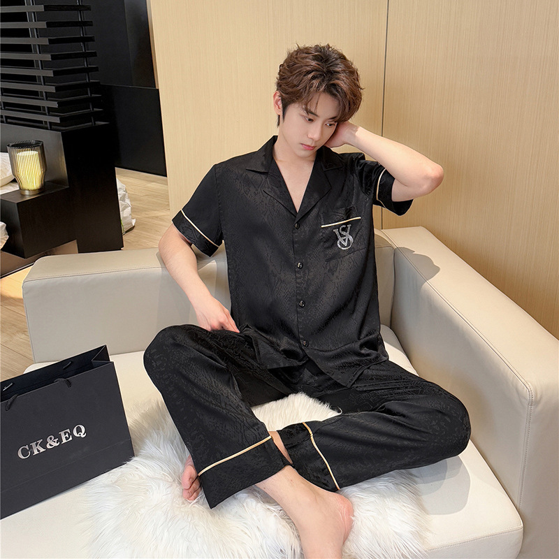고급 아이스 실크 커플 파자마 여성의 봄 새로운 반팔 바지 자카드 핫 라인스톤 세트 플러스 사이즈 남성 홈 의류스토어 가기