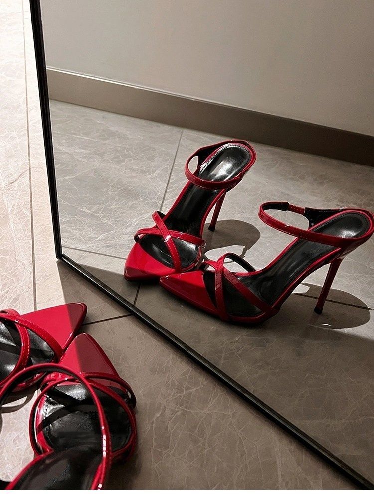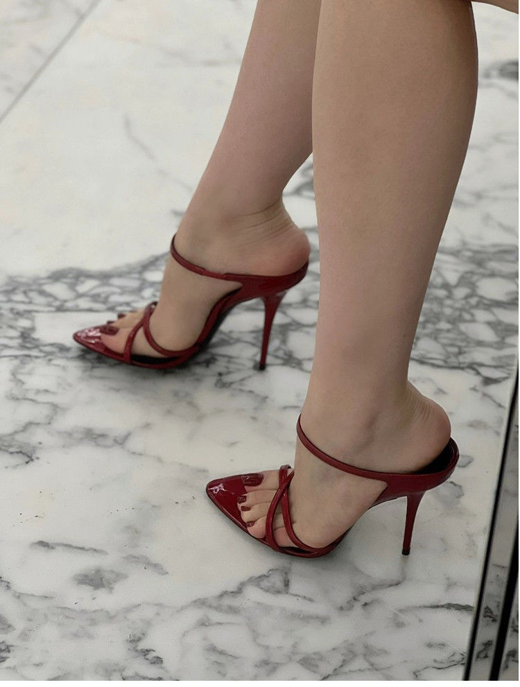 빨간 침대 하이힐로 뾰족한 발가락 여성용 2024 봄 새로운 스타일의 섹시한 샌들 플랫폼 얇은 뒤꿈치 슬리퍼스토어 가기