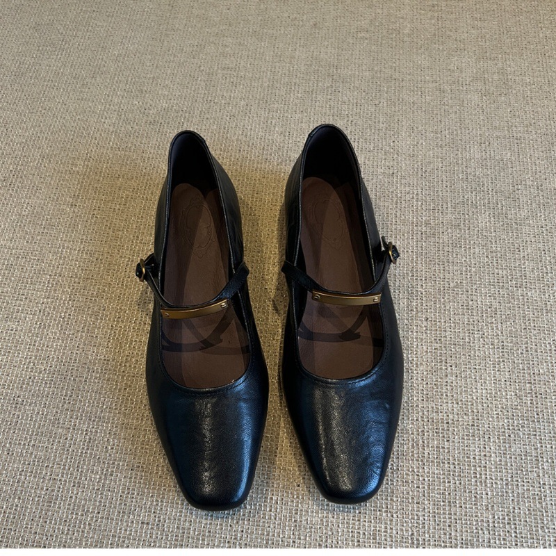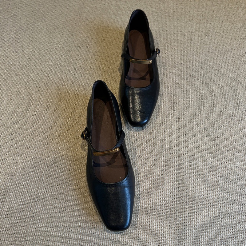 양가죽 버전 ~ 얕은 입 금속 버클 블랙 메리 제인 신발 여성 복고풍 평면 올매치 스퀘어 발가락 작은 싱글 신발