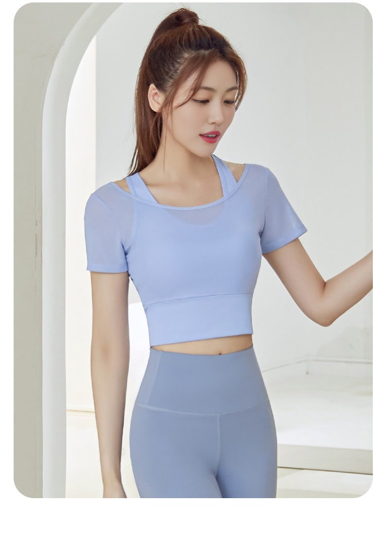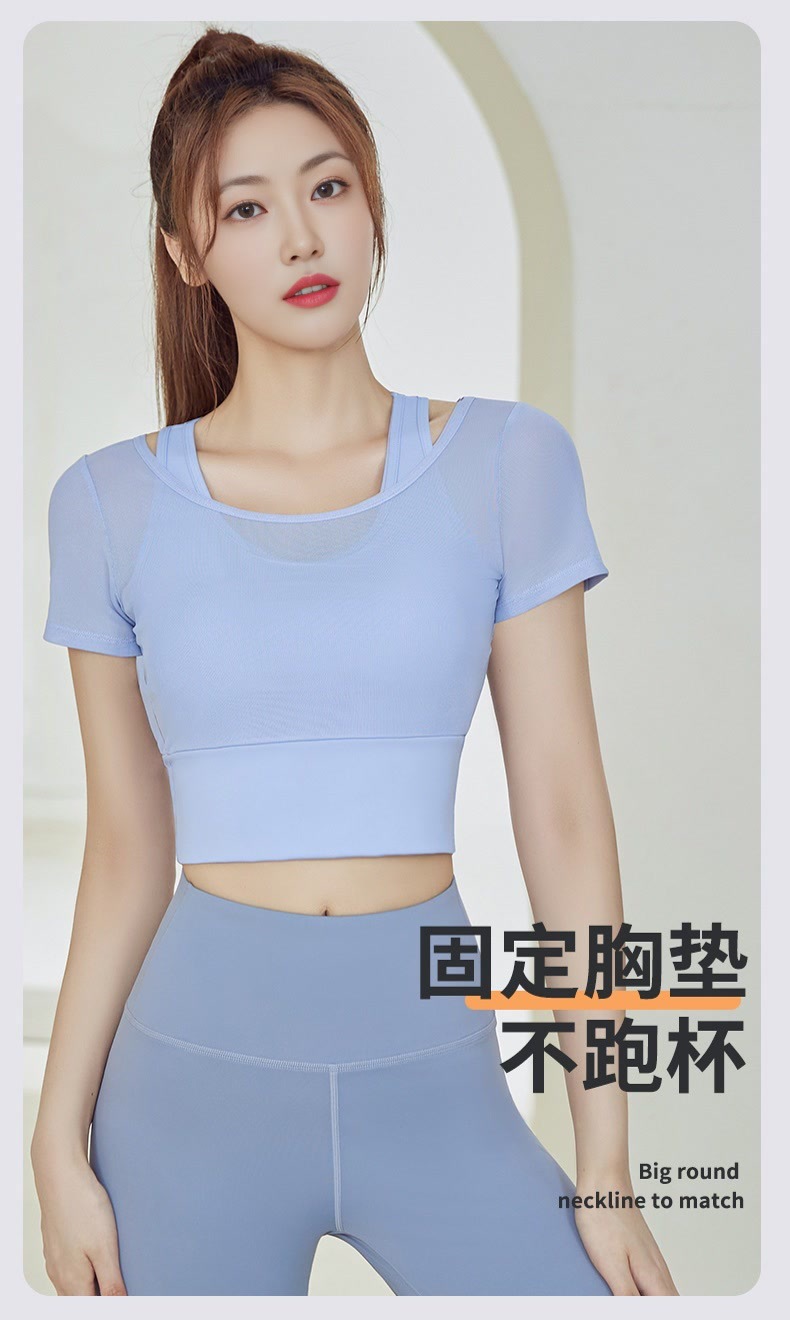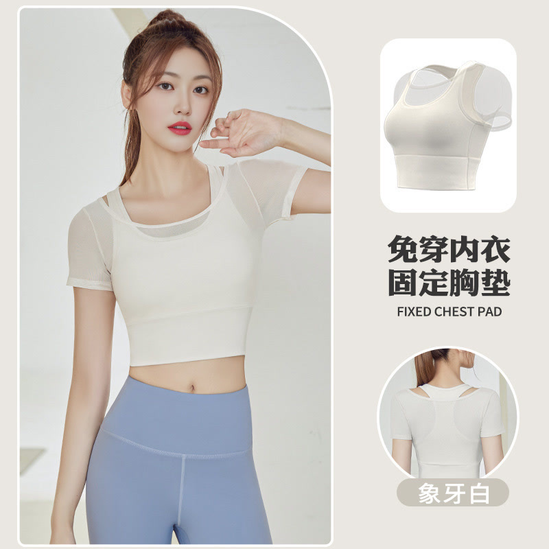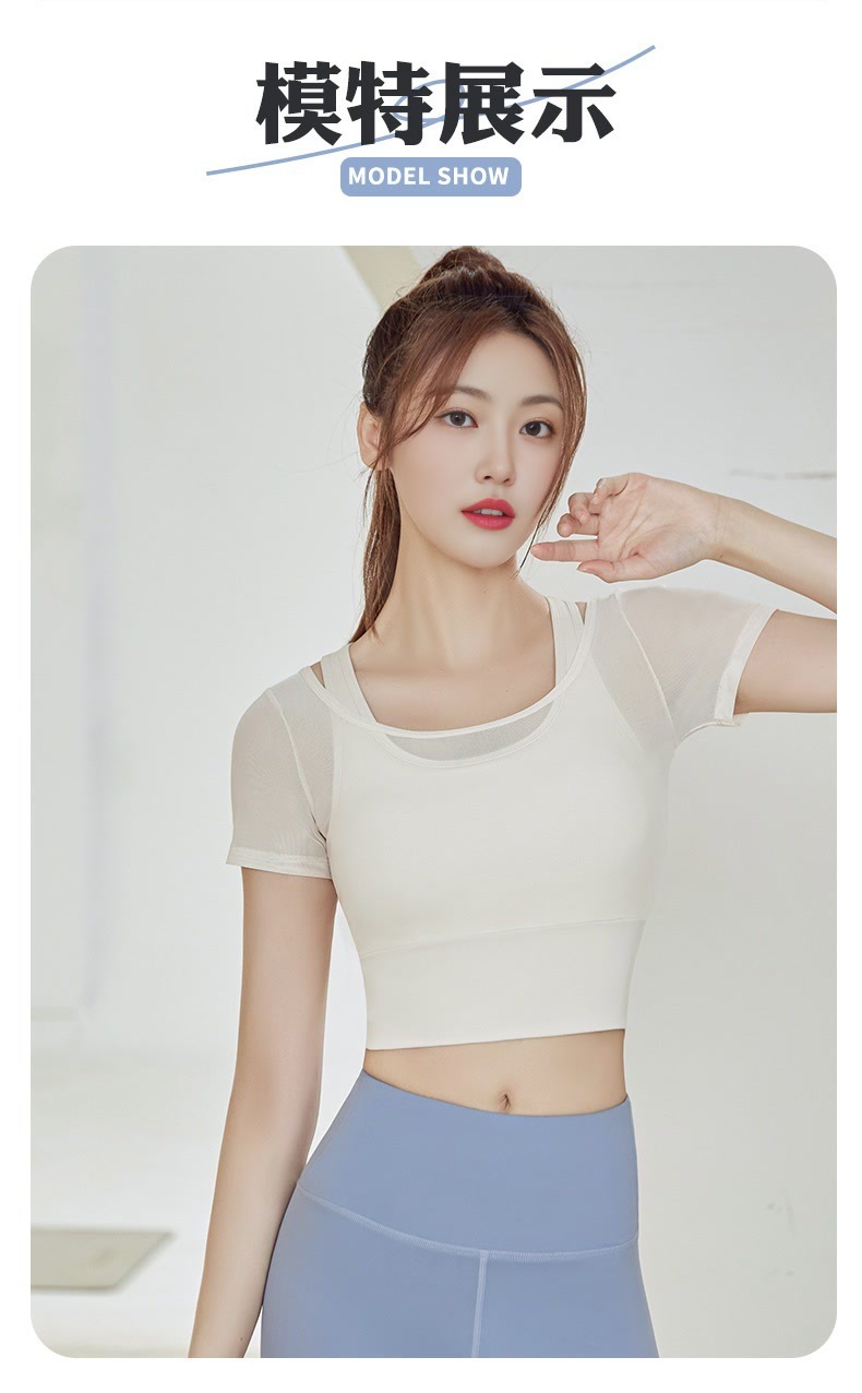 가짜 투피스 얇은 여성 벨트 가슴 패드 메쉬 통기성 러닝 피트니스 타이트 스포츠 탑 반팔 요가 옷스토어 가기