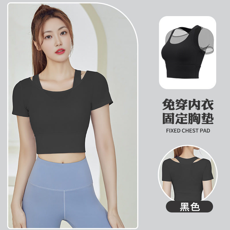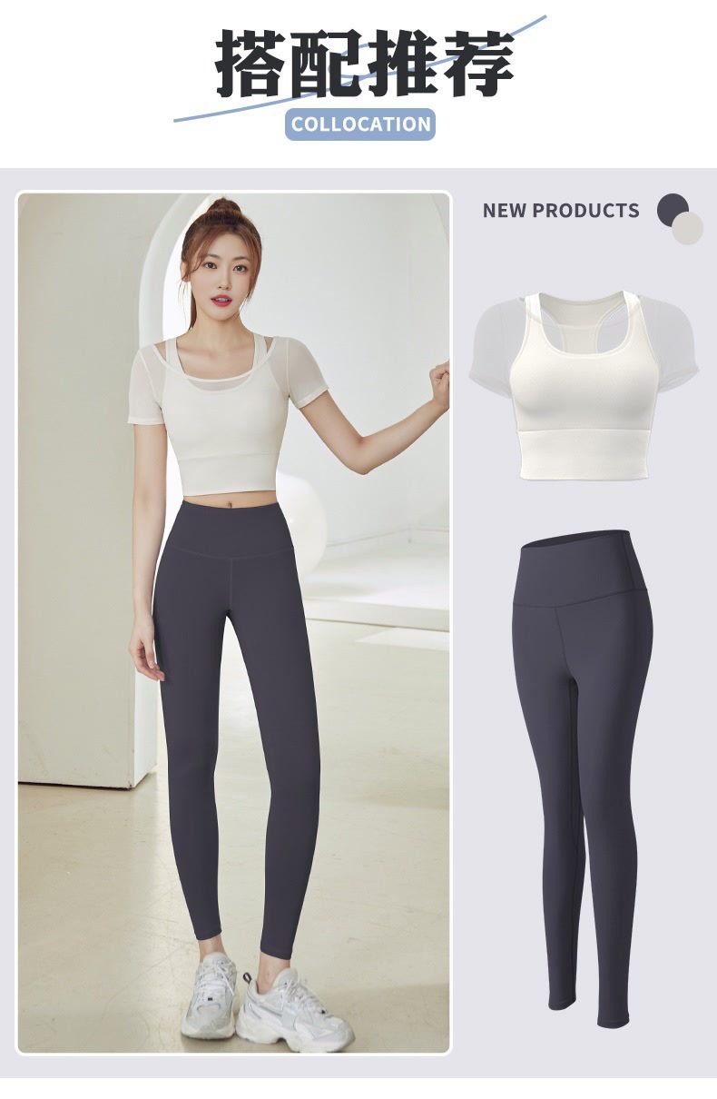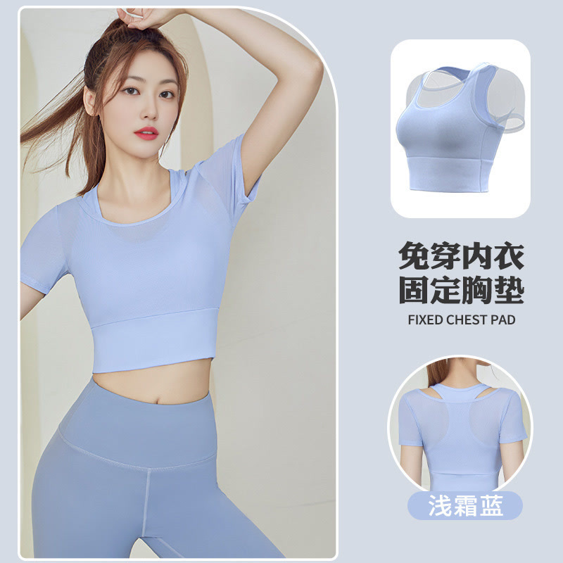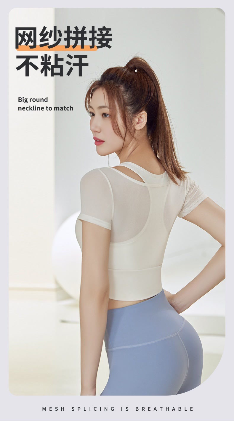 가짜 투피스 얇은 여성 벨트 가슴 패드 메쉬 통기성 러닝 피트니스 타이트 스포츠 탑 반팔 요가 옷스토어 가기