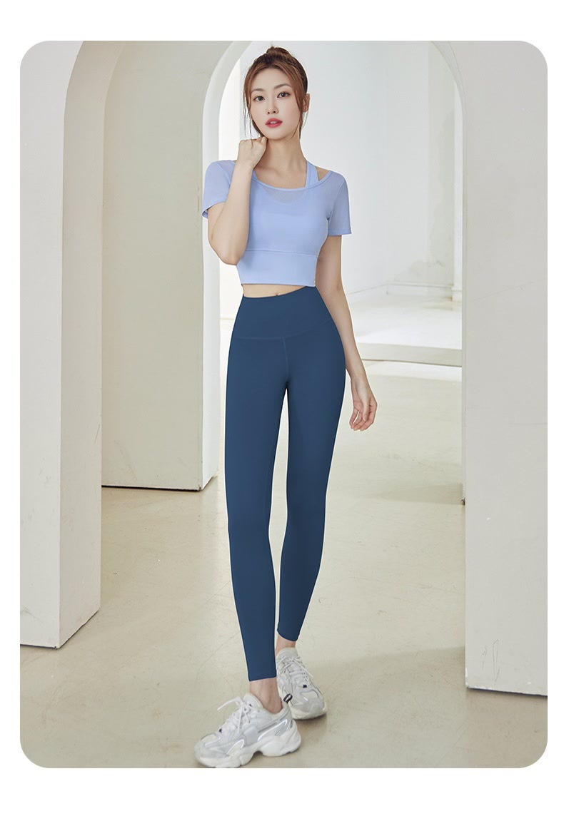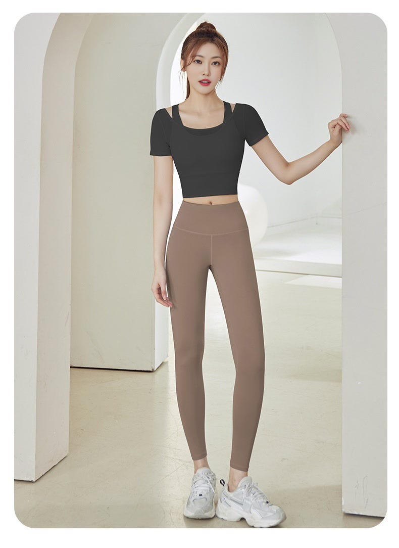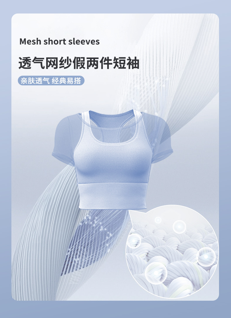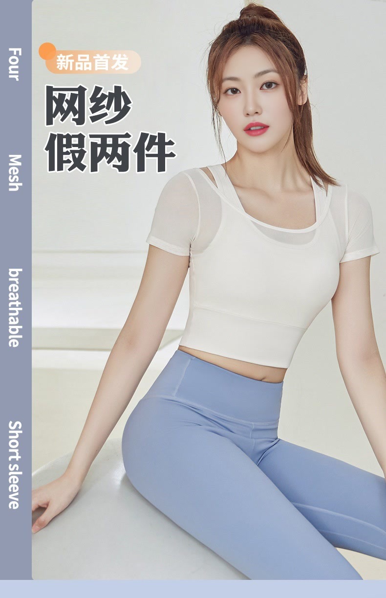 가짜 투피스 얇은 여성 벨트 가슴 패드 메쉬 통기성 러닝 피트니스 타이트 스포츠 탑 반팔 요가 옷