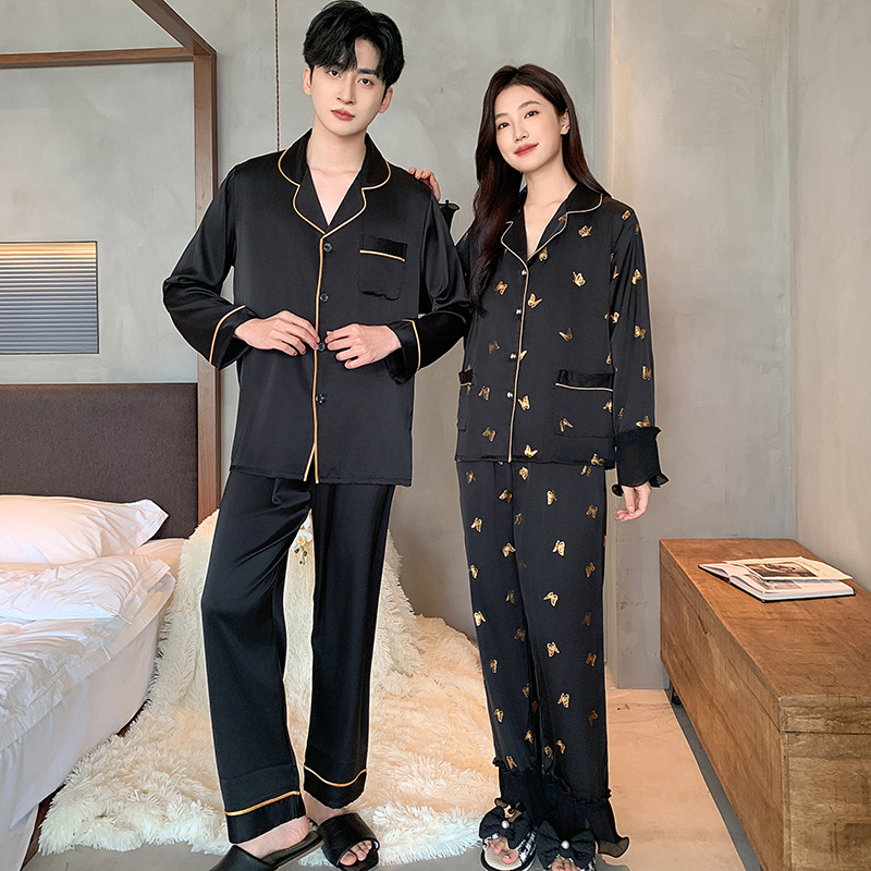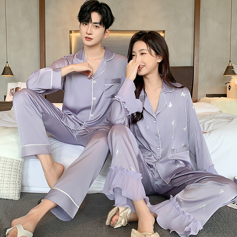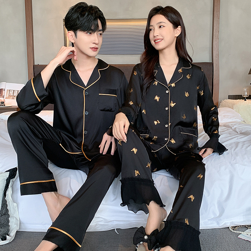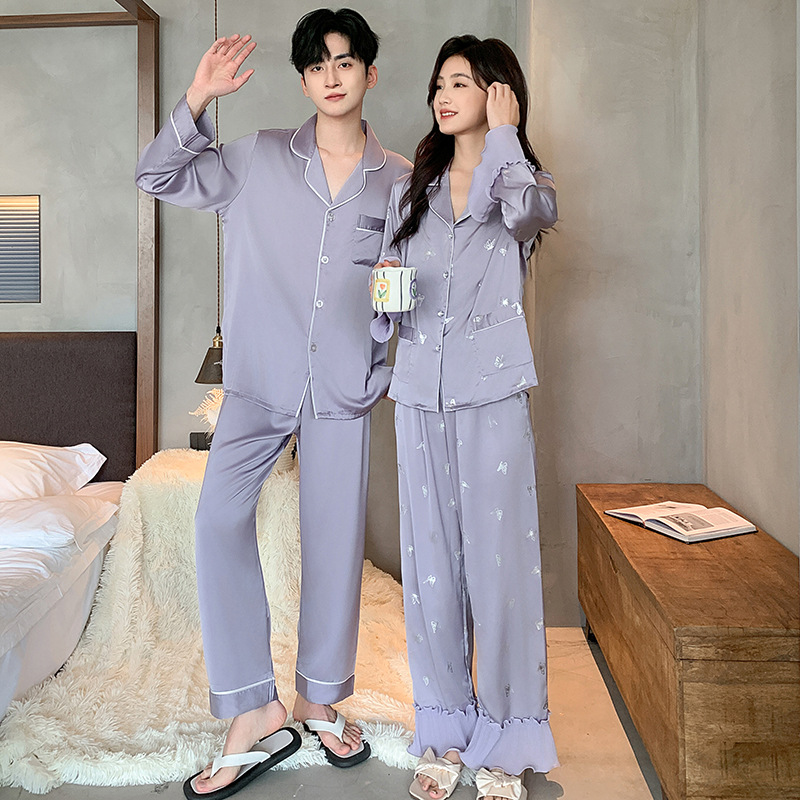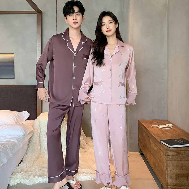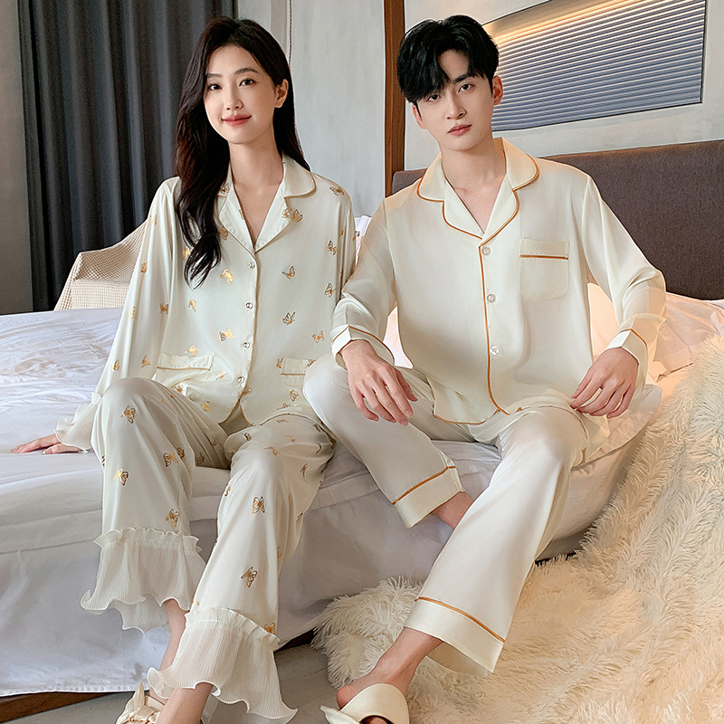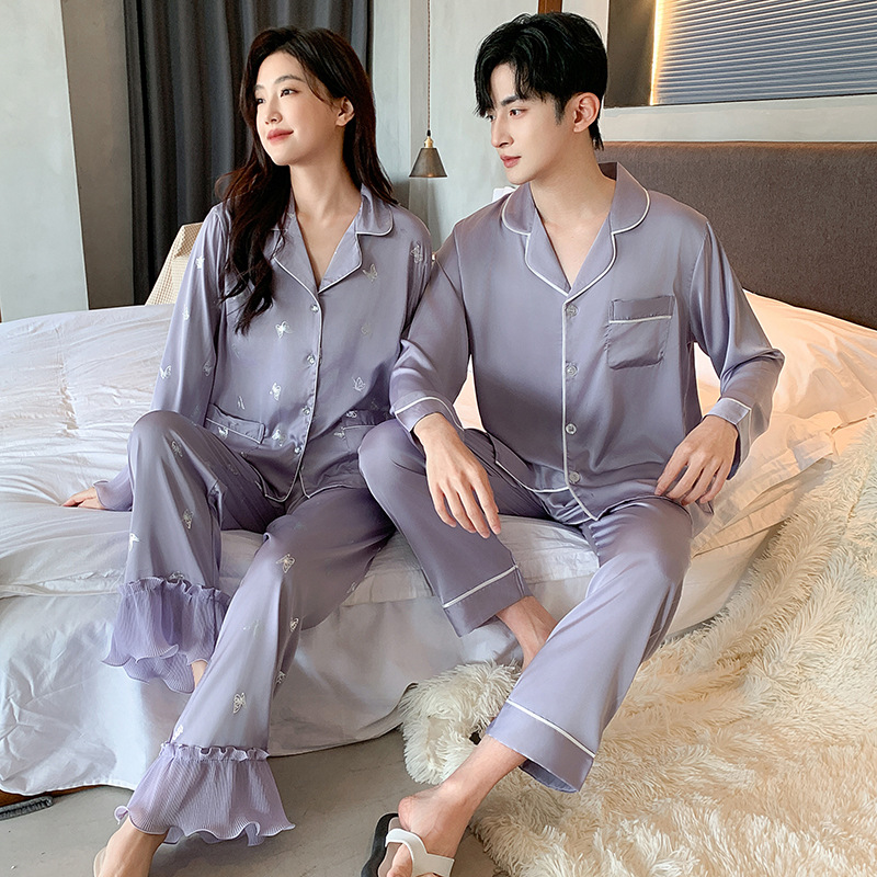 커플 잠옷 봄과 가을 새로운 새틴 여성 아이스 실크 하이 엔드 남성 여름 빛 럭셔리 홈 웨어 얇은 세트스토어 가기