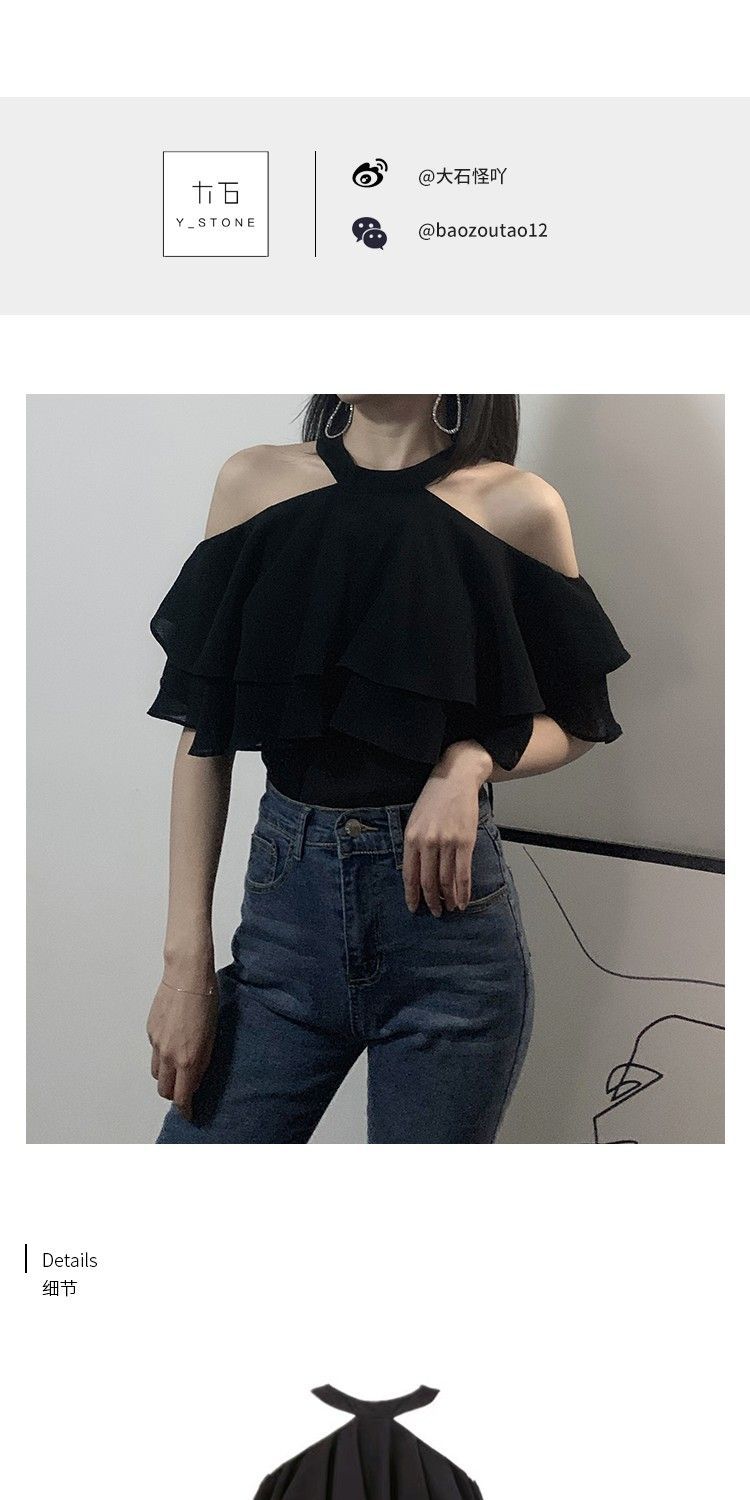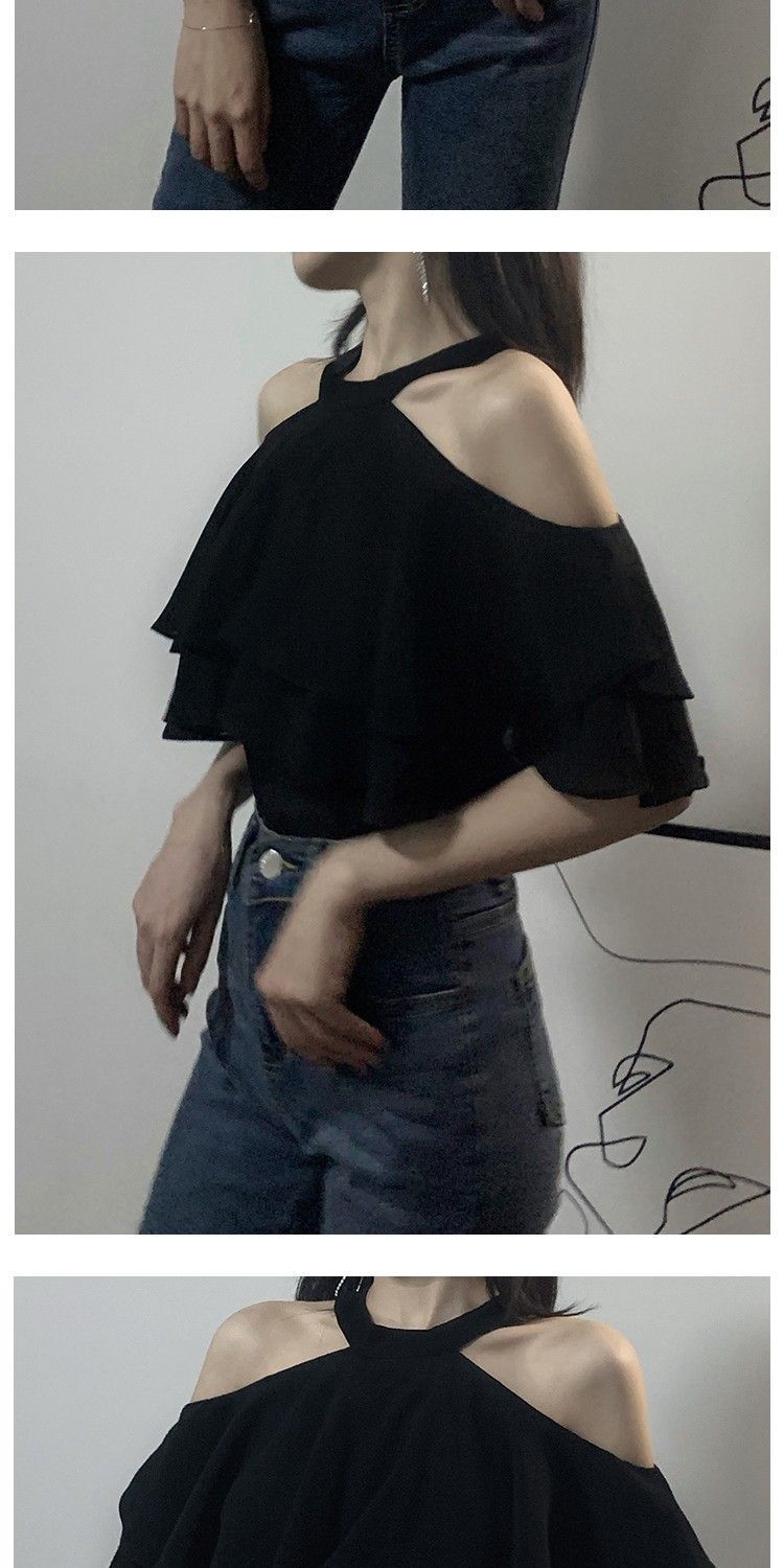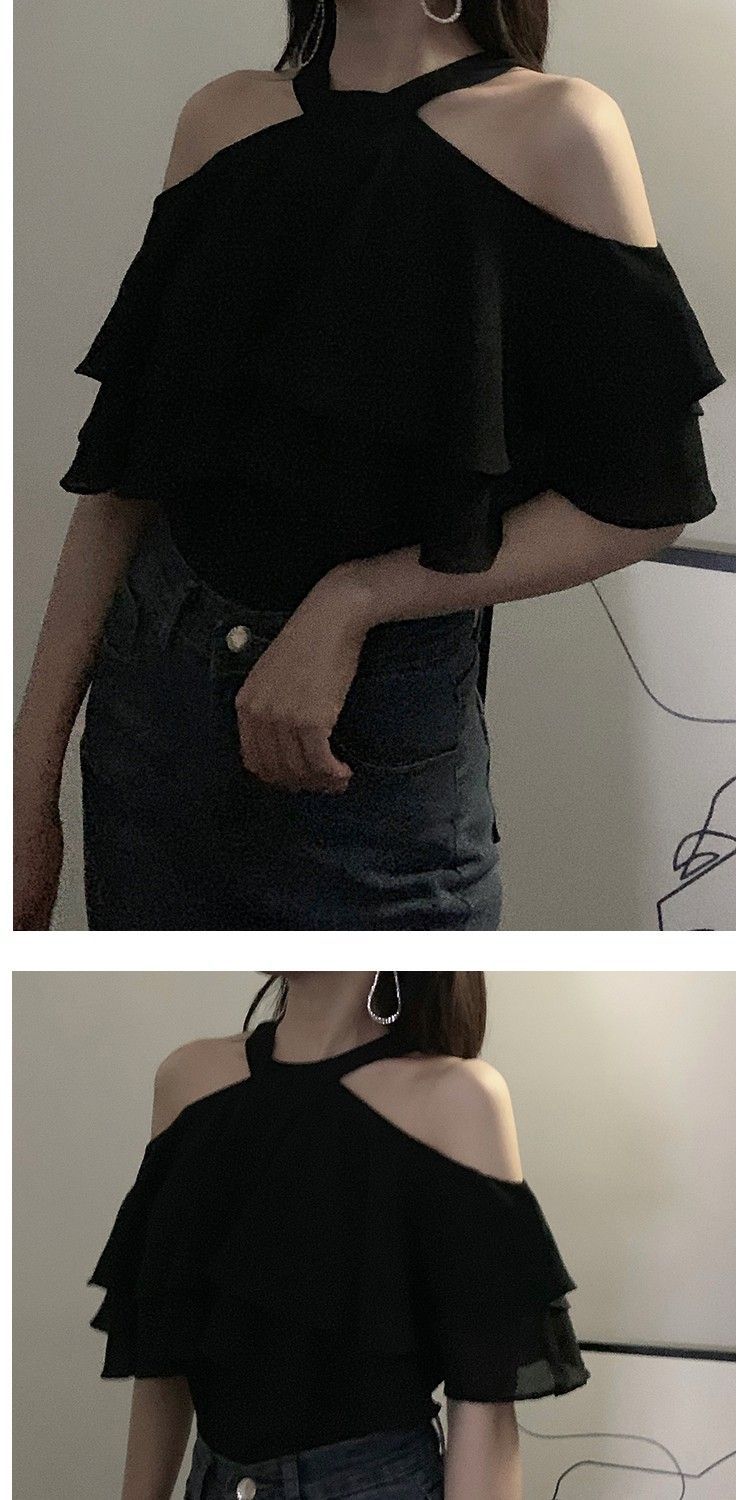 오프 숄더 쉬폰 탑 여성 여름 반팔 2025 새로운 디자인 감각 틈새 오프 숄더 쉬폰 셔츠 스위트 플랍스토어 가기