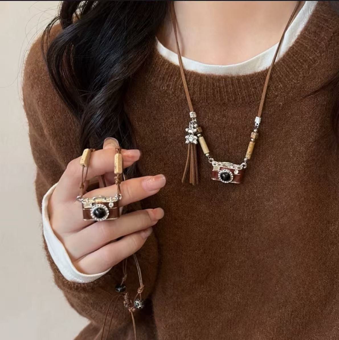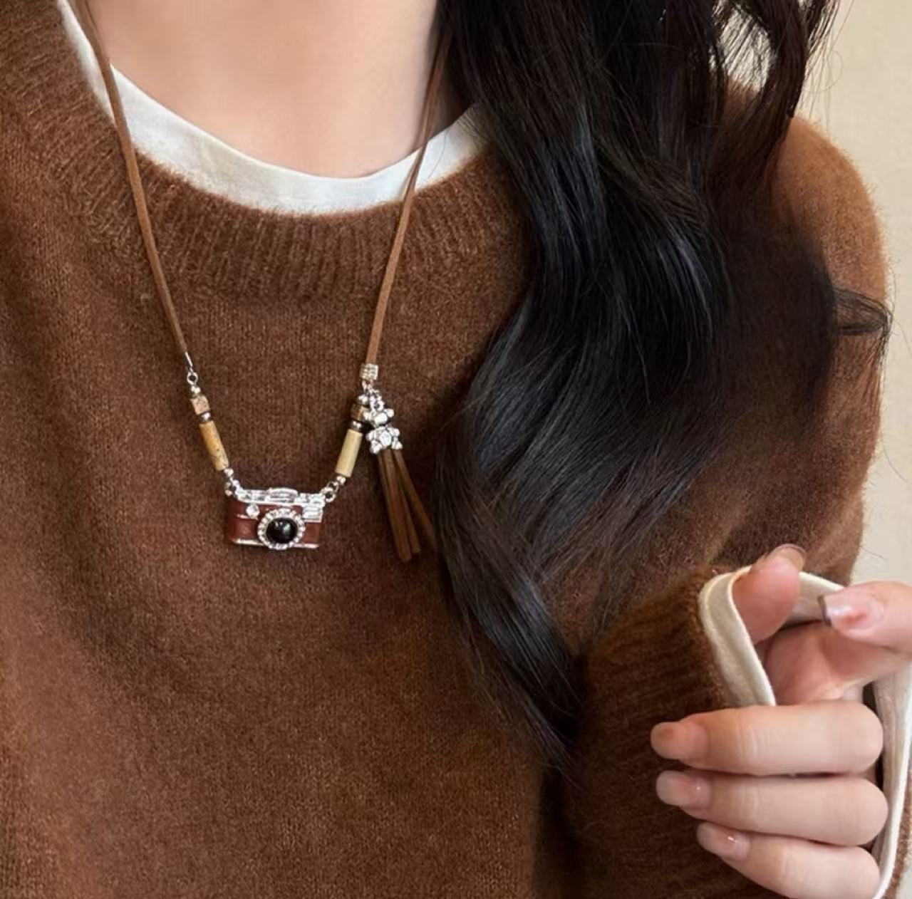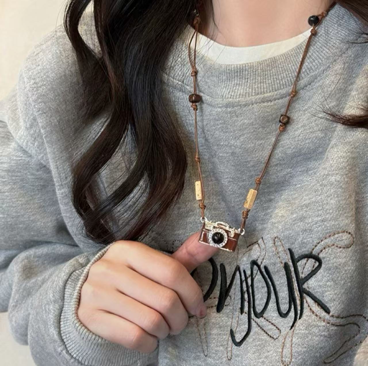빈티지 다크 브라운 카메라 목걸이 여성용 마일러 달콤한 쿨 스파이스 소녀 스타일 틈새 독특한 스웨터 체인 2025 새로운 액세서리스토어 가기