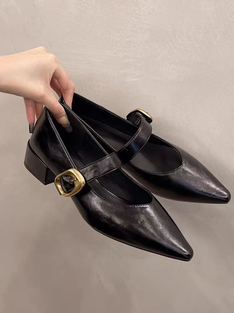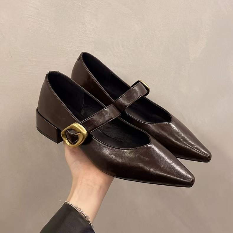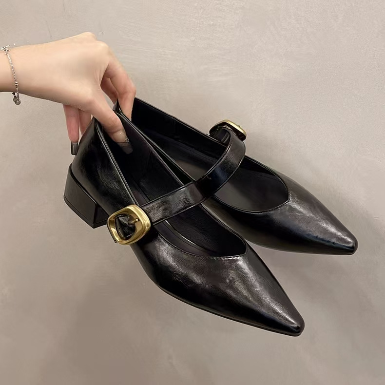 뾰족한 발 뒤꿈치 신발 여성 부드러운 가죽 메리 제인 여성 신발 2025 부드러운 밑바닥 우아한 프랑스 스타일 낮은 두꺼운 뒤꿈치 새로운 스타일스토어 가기