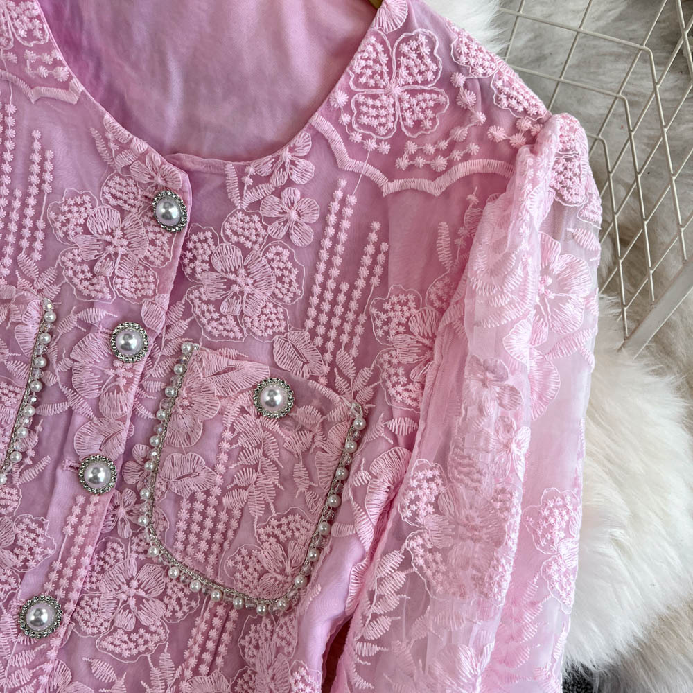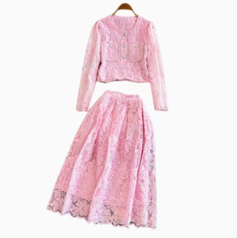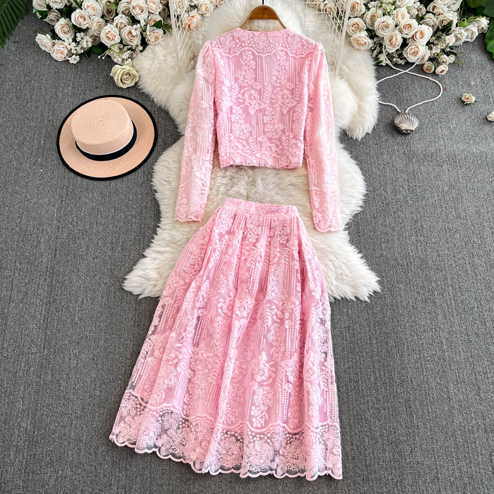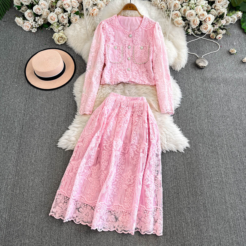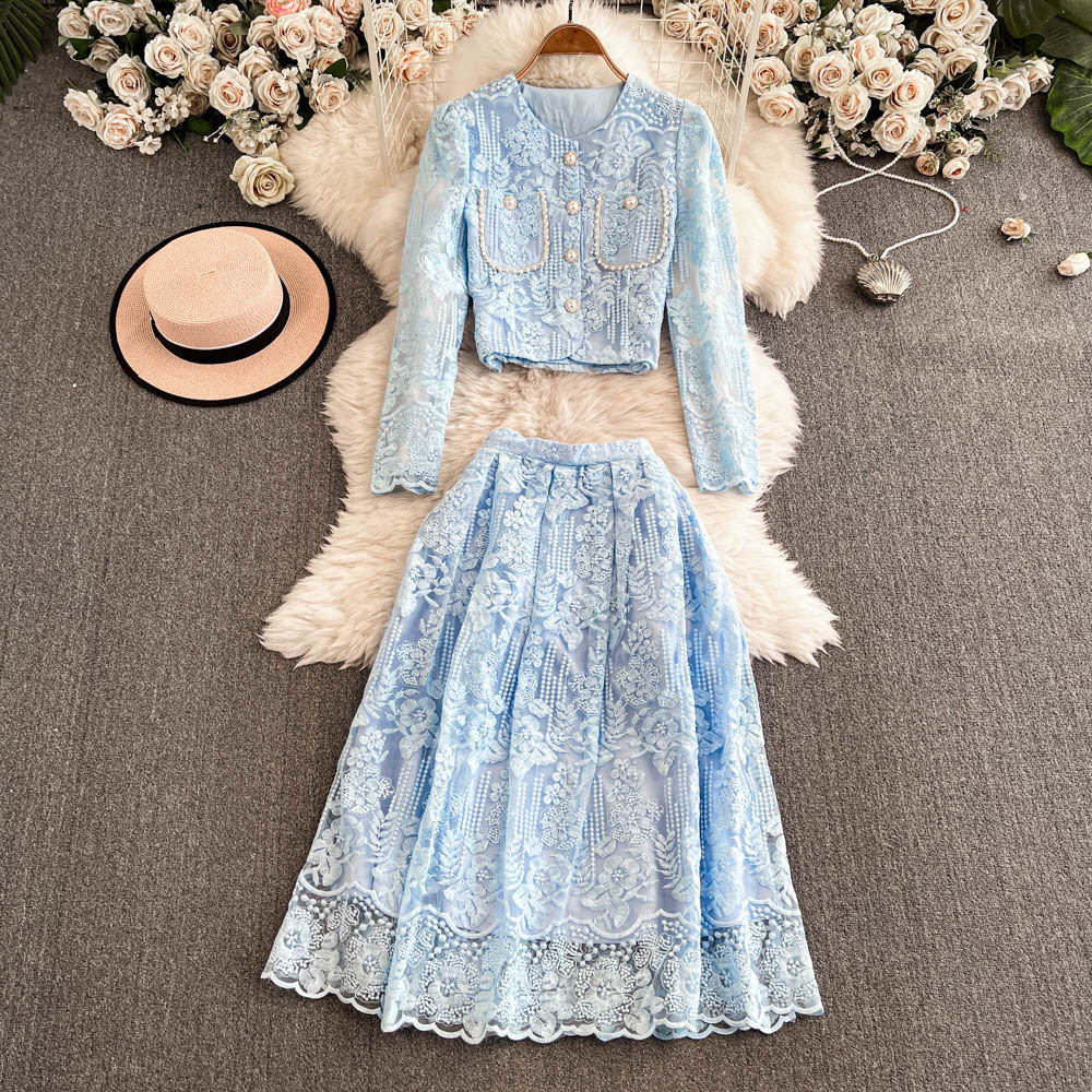 대외 무역 절묘한 투피스 세트 여성 우아한 숙녀 빛 럭셔리 슬리밍 레이스 자수 구슬 탑 스커트 0415스토어 가기