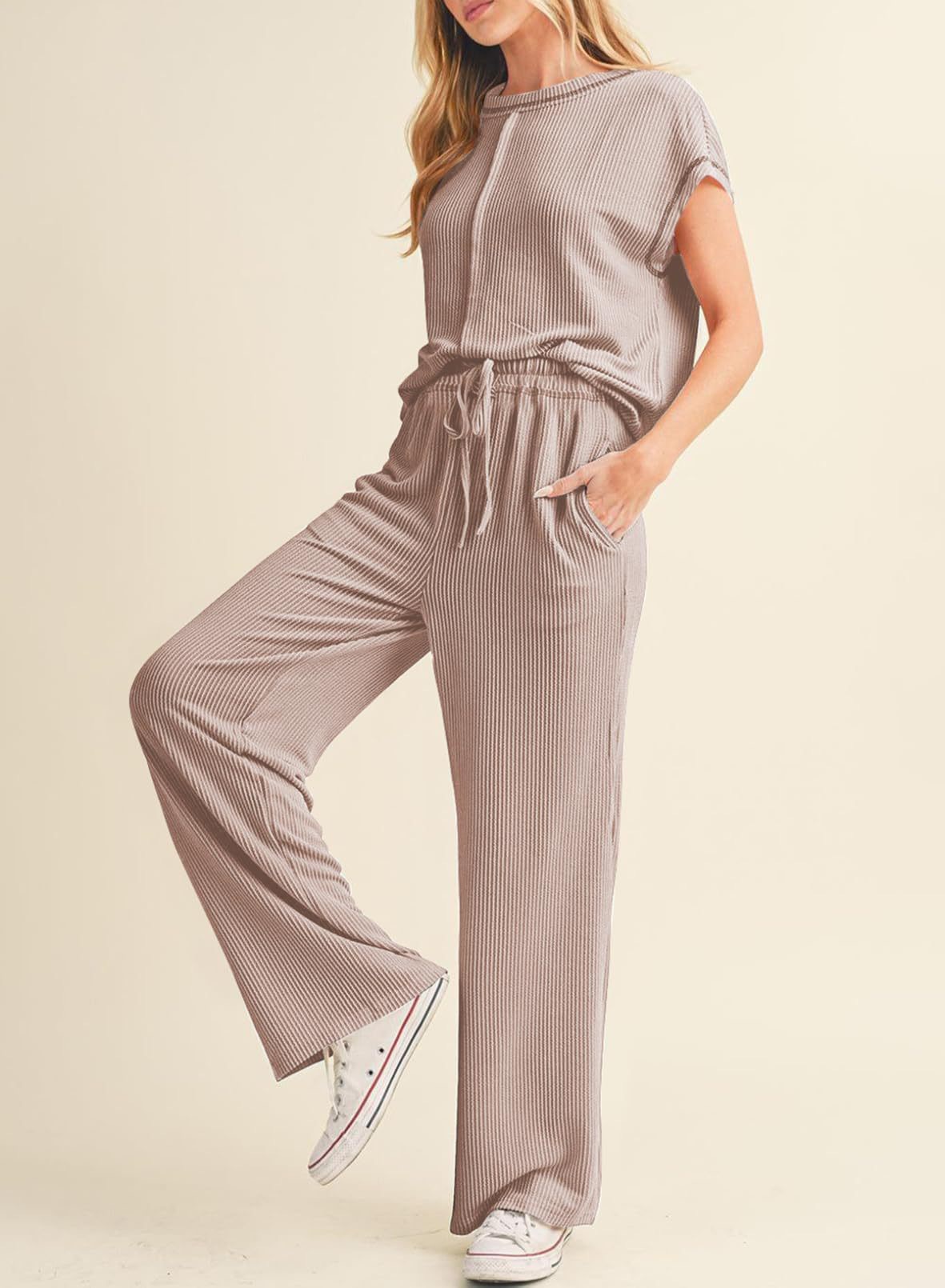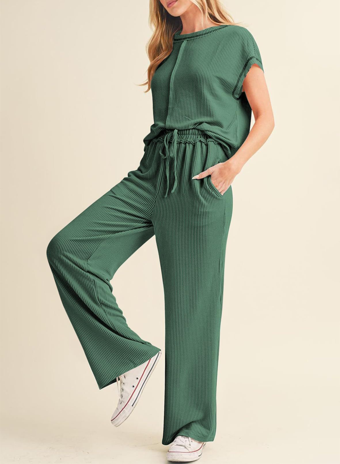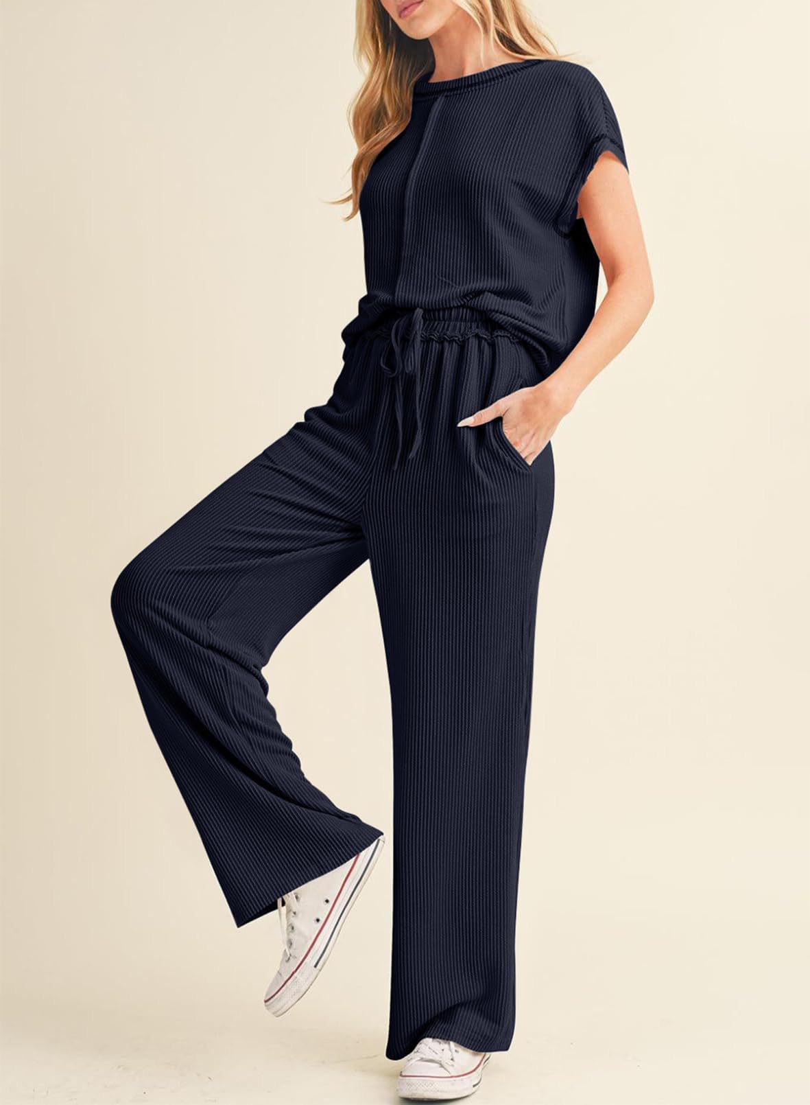 2026 아마존 유럽 및 미국 봄 여름 신상 패션 캐주얼 여성복 3부 소매 로프 솔리드 컬러 통근용 긴바지 정장 세트 여성용스토어 가기