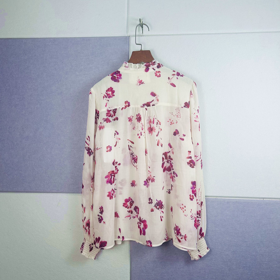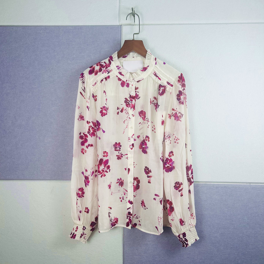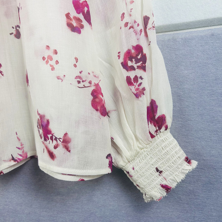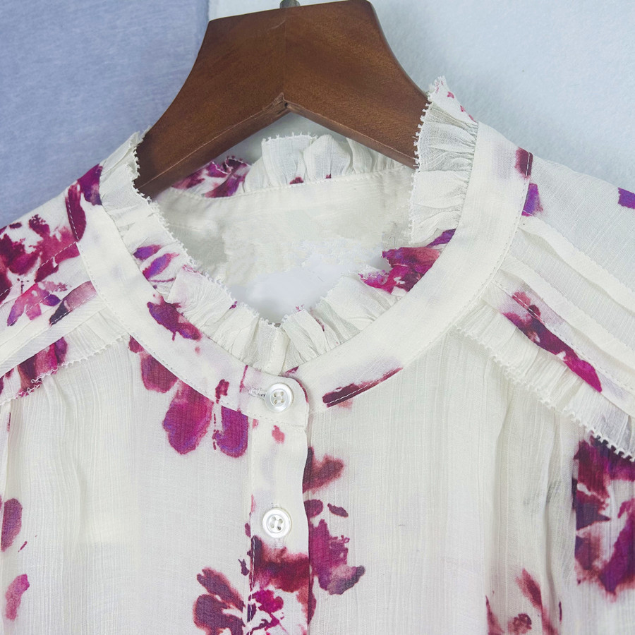 2025 년 초 봄 새로운 프랑스 스타일 트윈 로즈 쉬폰 인쇄 어깨와 귀 가장자리 텍스트 셔츠 탑스토어 가기