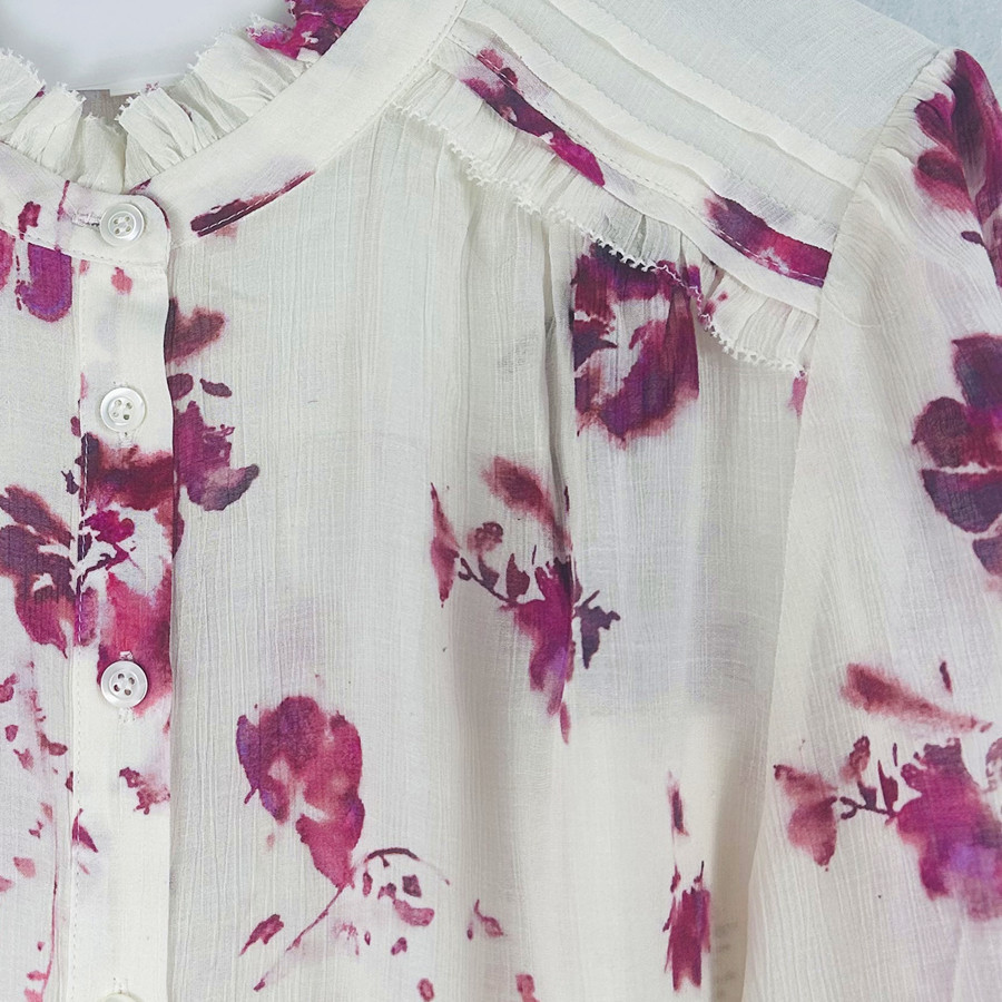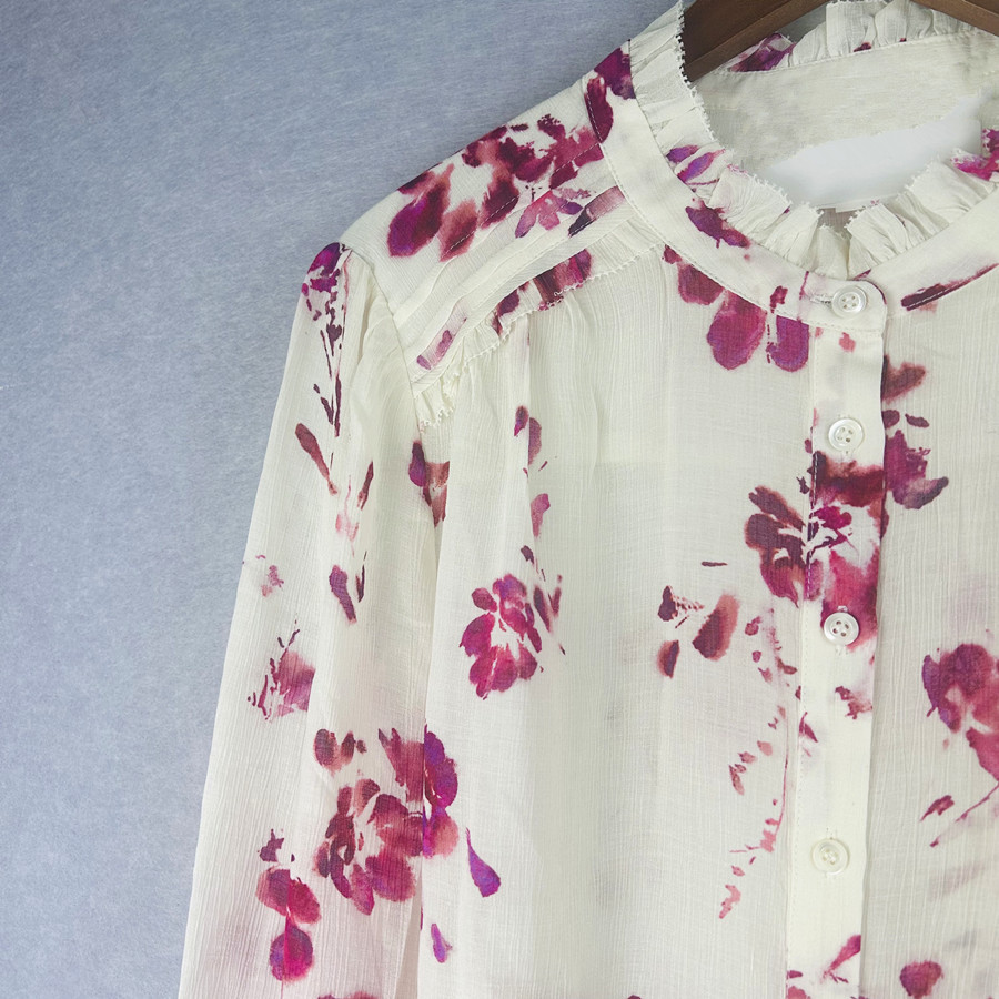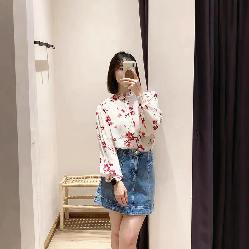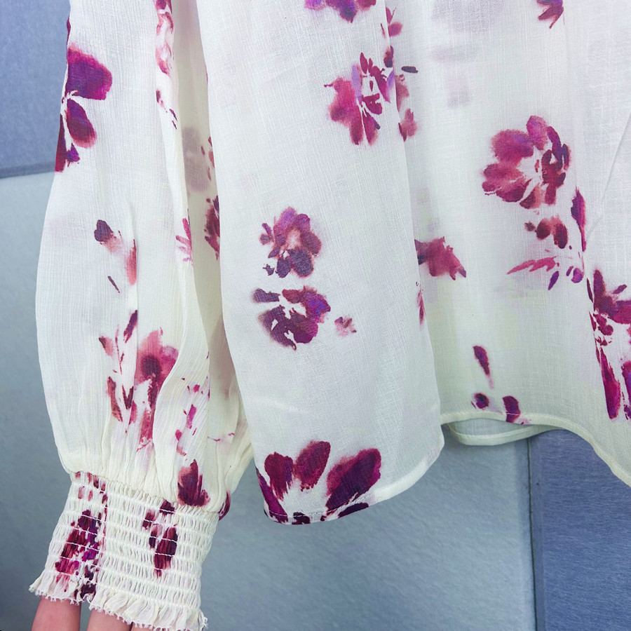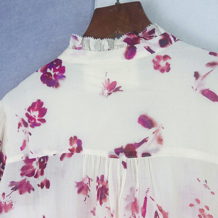 2025 년 초 봄 새로운 프랑스 스타일 트윈 로즈 쉬폰 인쇄 어깨와 귀 가장자리 텍스트 셔츠 탑스토어 가기