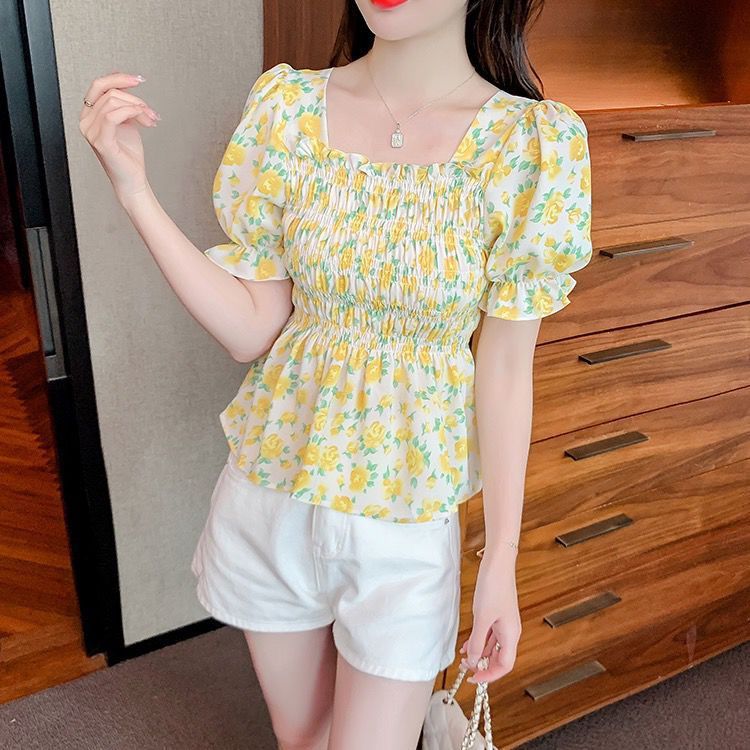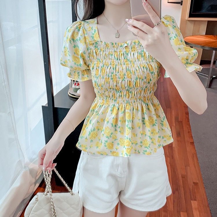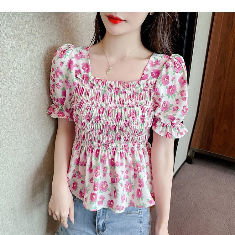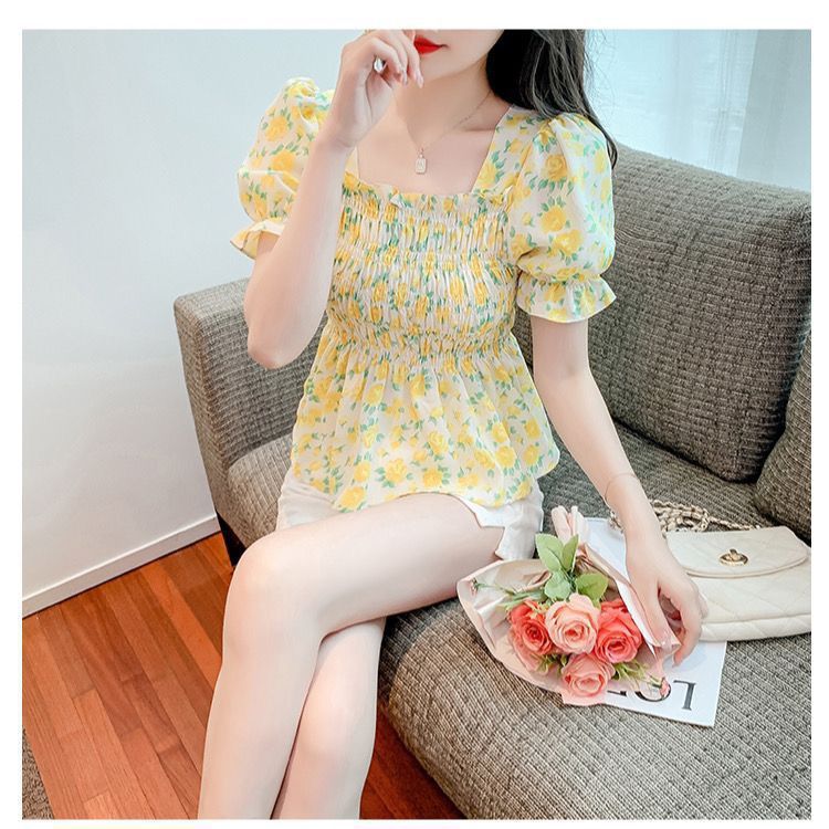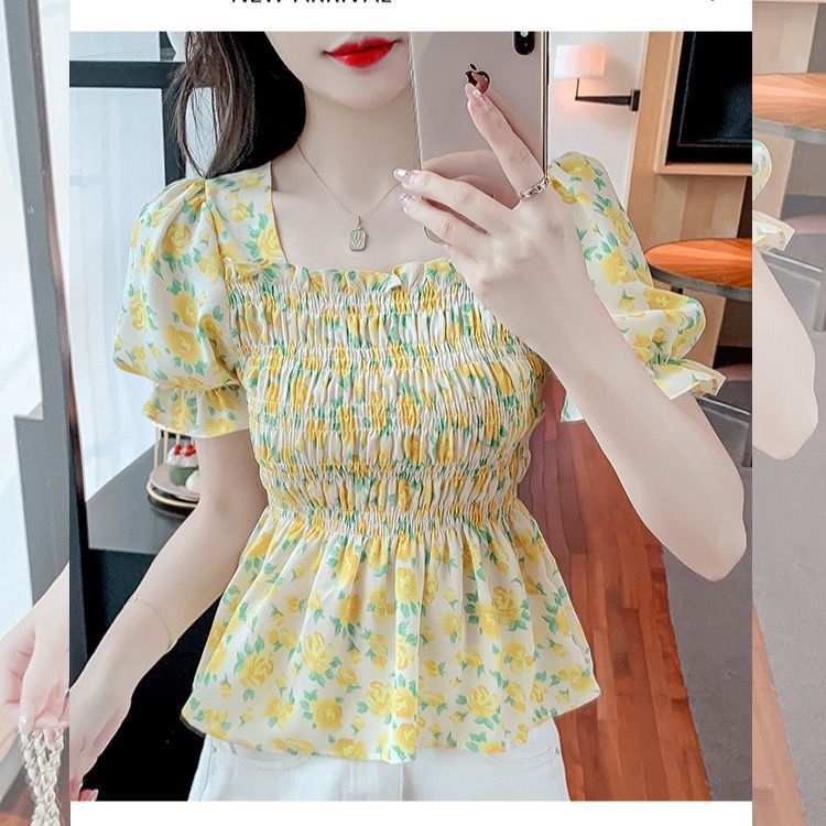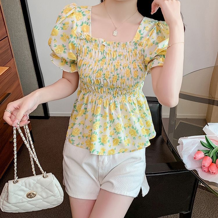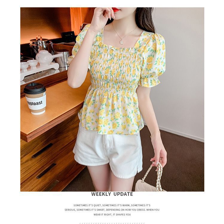 일본의 새로운 여름 퍼프 슬리브 달콤한 타이트 허리 반팔 쉬폰 셔츠 스퀘어 칼라 풀오버 플로어 여성용 티셔츠스토어 가기