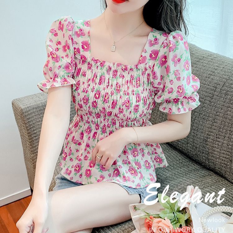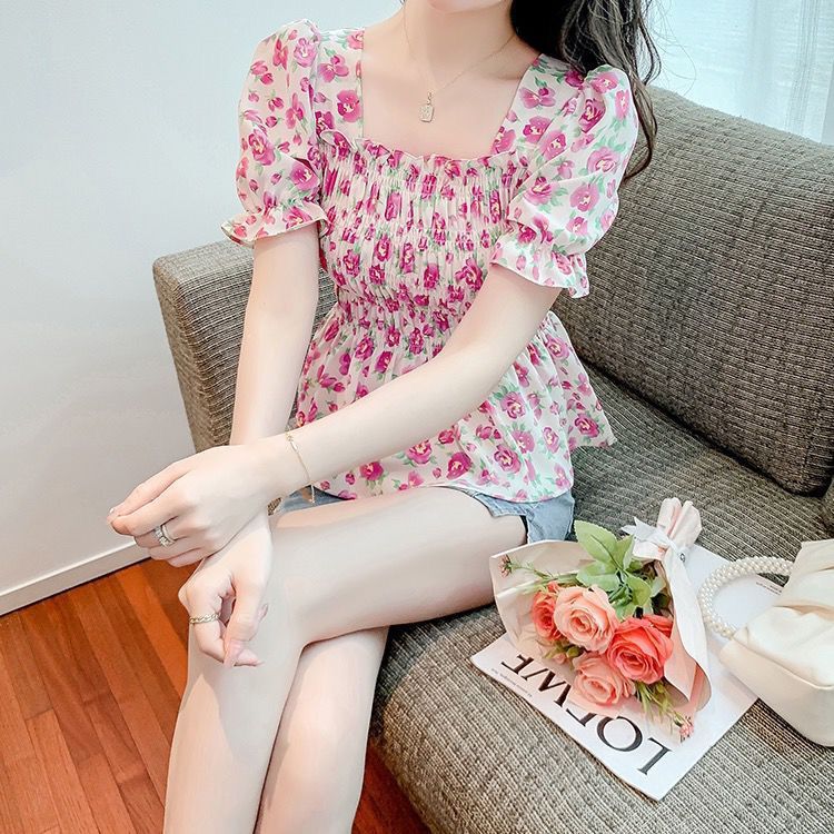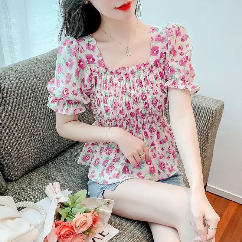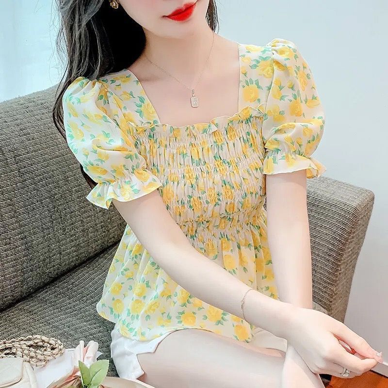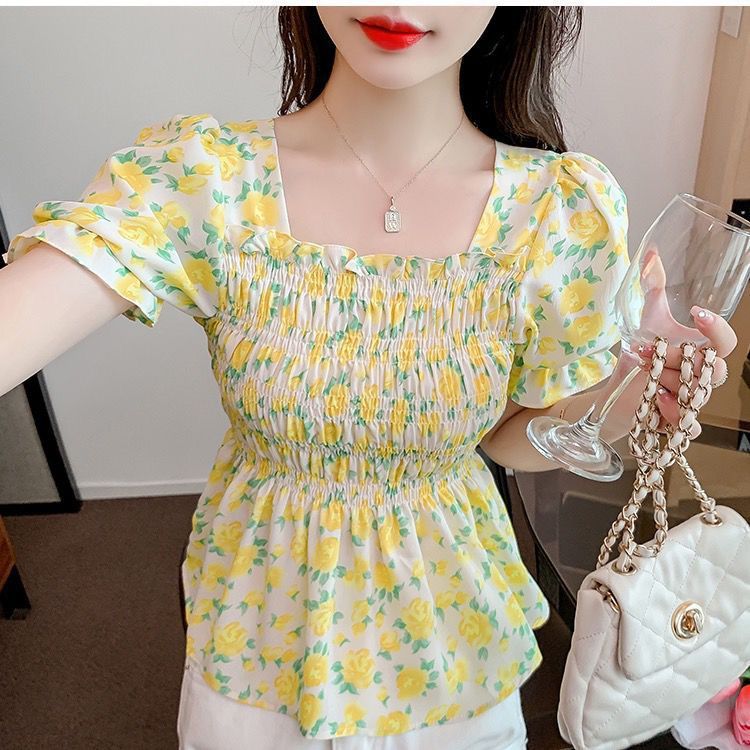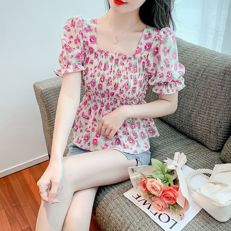 일본의 새로운 여름 퍼프 슬리브 달콤한 타이트 허리 반팔 쉬폰 셔츠 스퀘어 칼라 풀오버 플로어 여성용 티셔츠스토어 가기