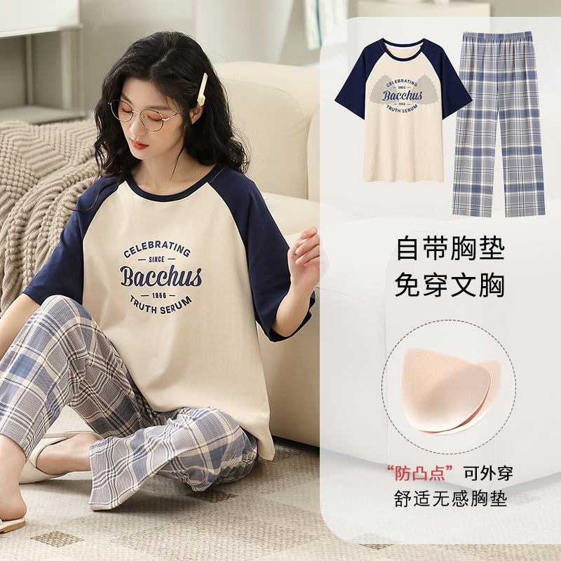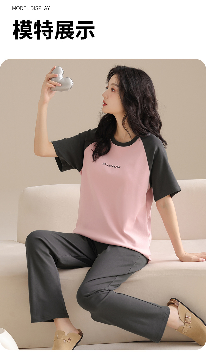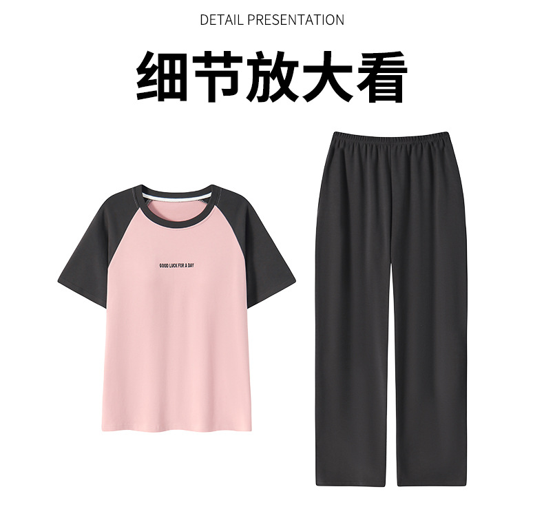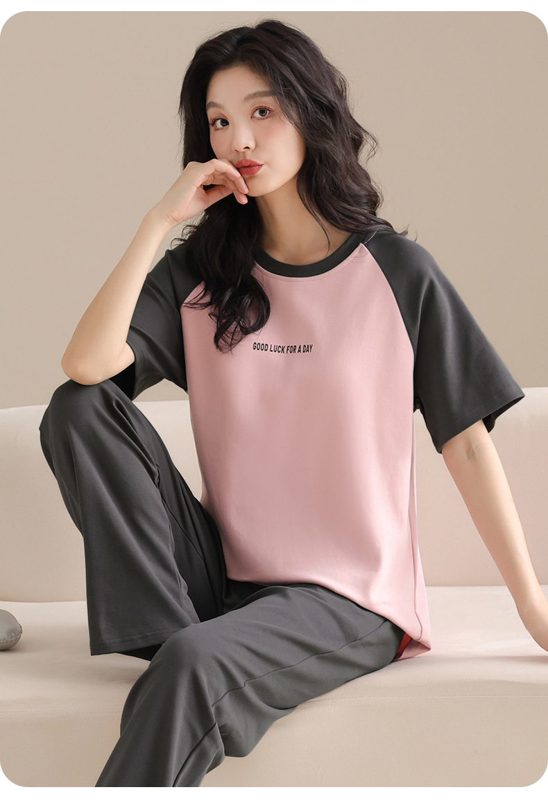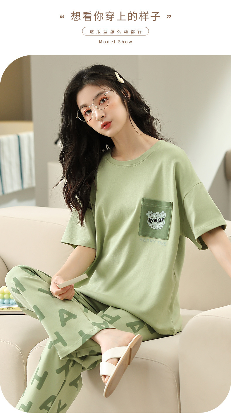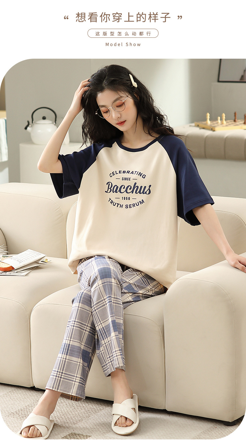코튼 파자마 여성용 여름 반팔 바지 세트 코튼 풀오버 라운드 넥 캐주얼 의상 홈 의류스토어 가기