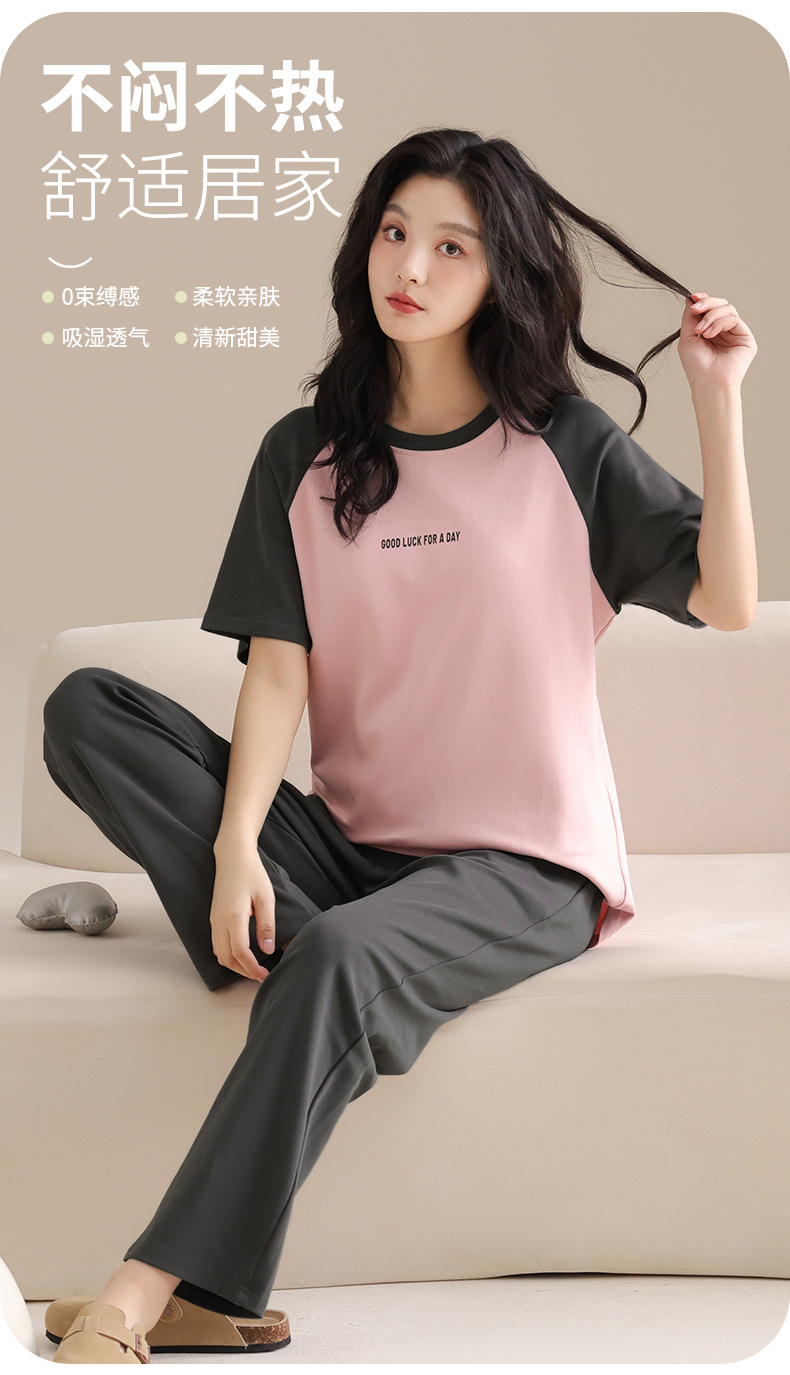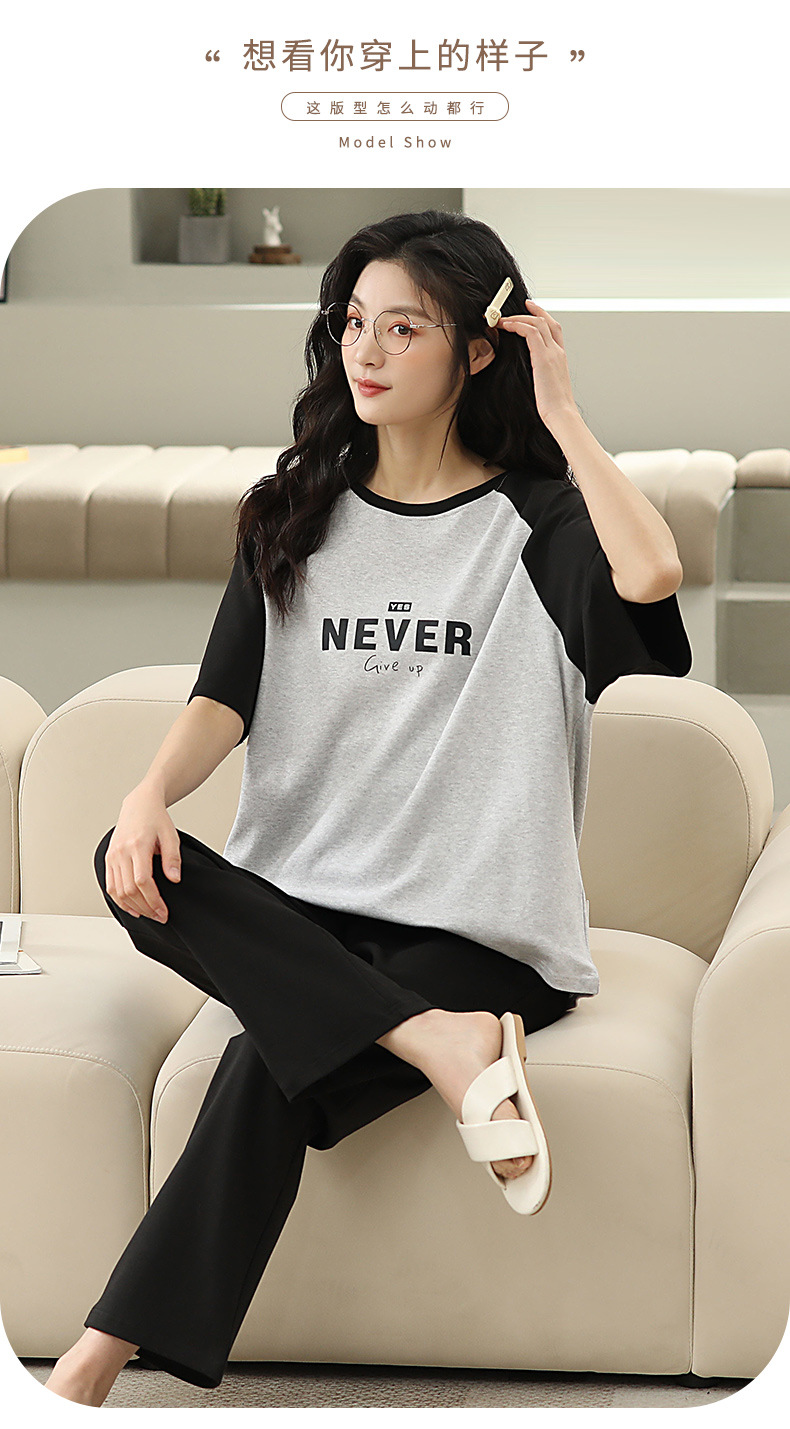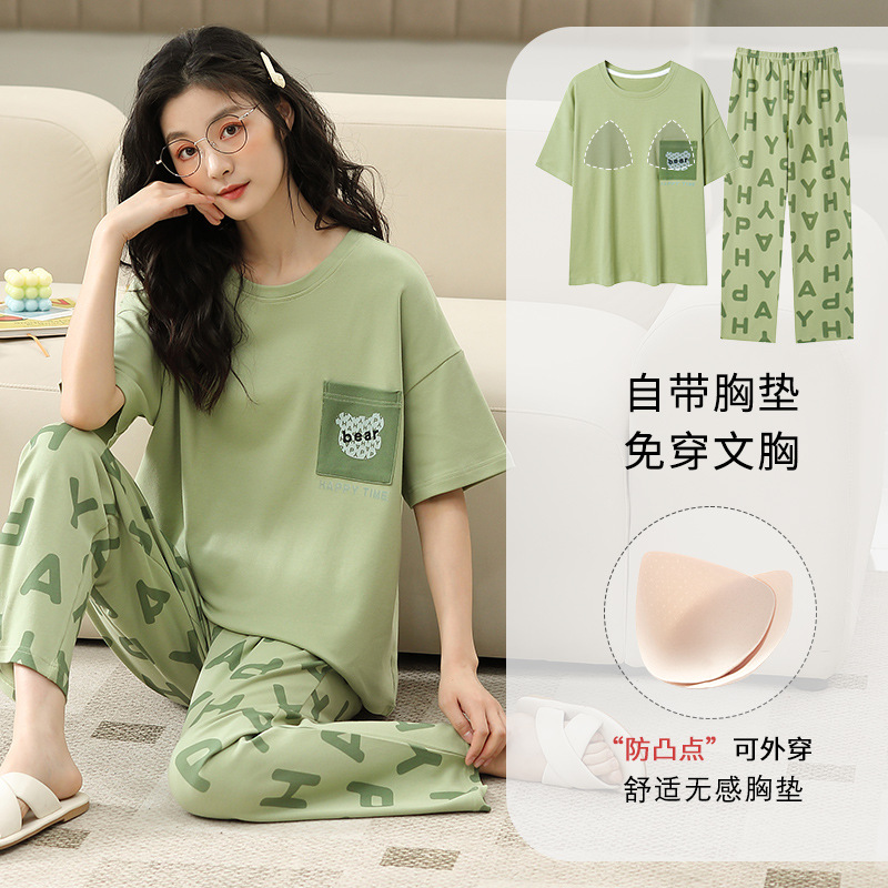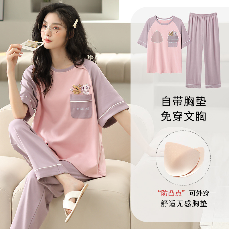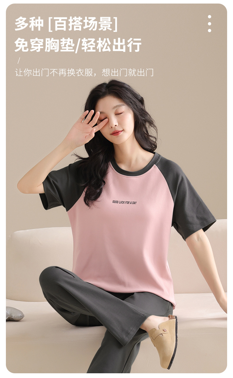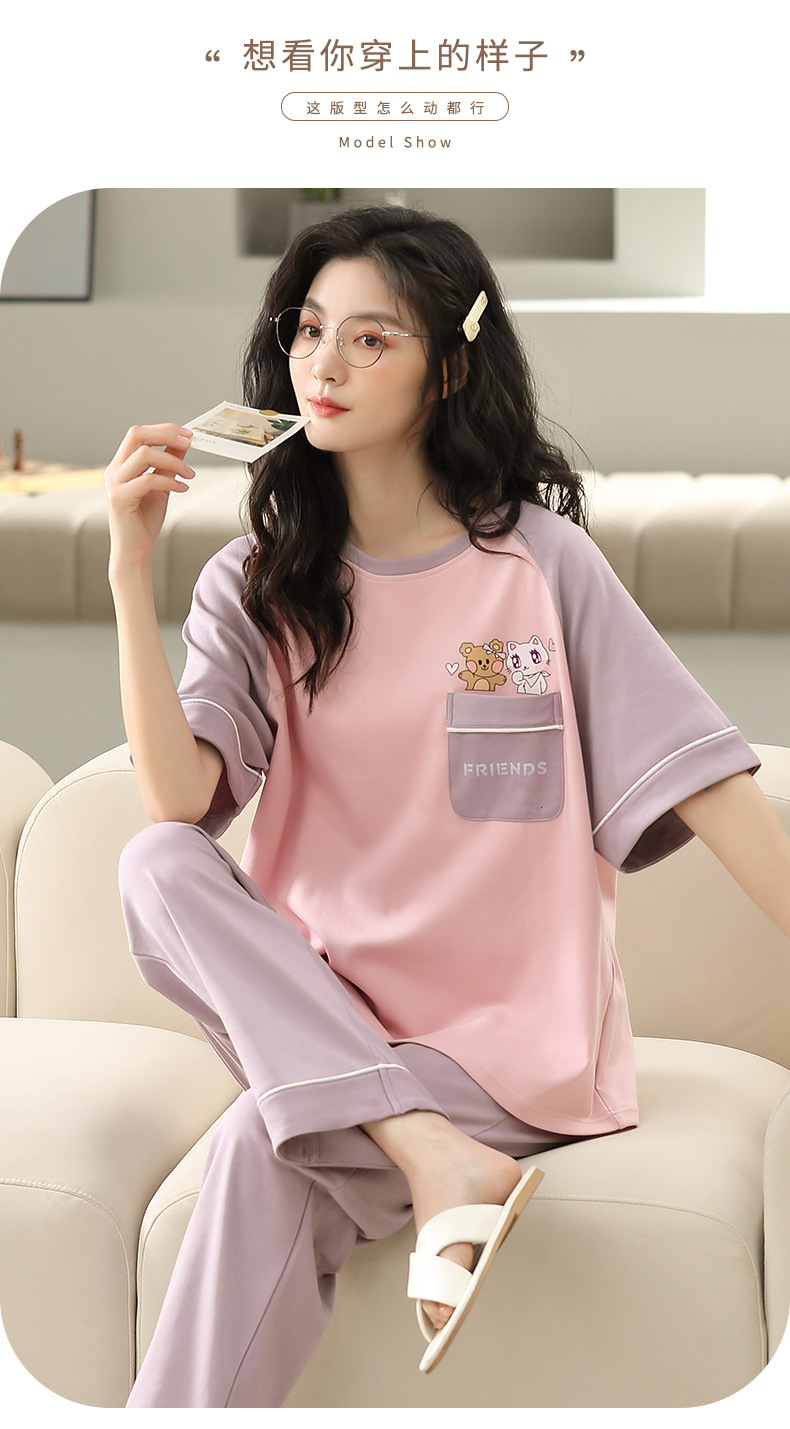 코튼 파자마 여성용 여름 반팔 바지 세트 코튼 풀오버 라운드 넥 캐주얼 의상 홈 의류스토어 가기