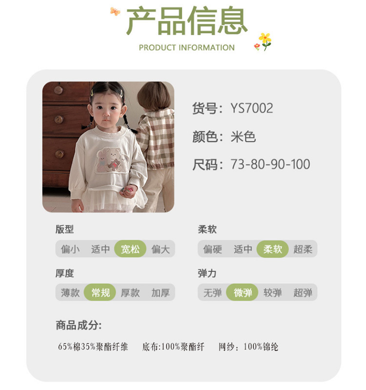 上衣面料成分:65%棉  35%聚酯纤维  底布:100%聚酯纤维 网纱:100%锦纶